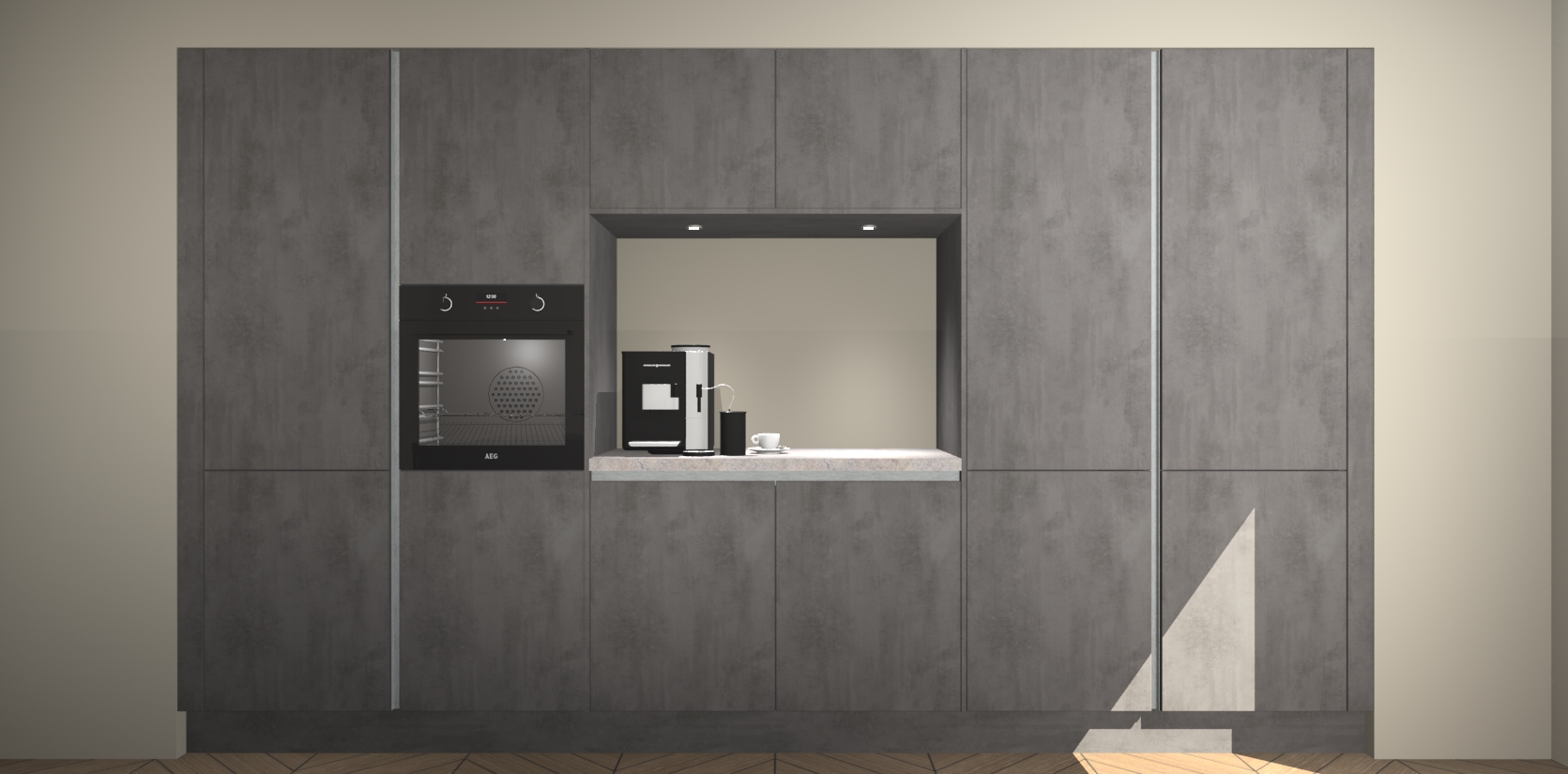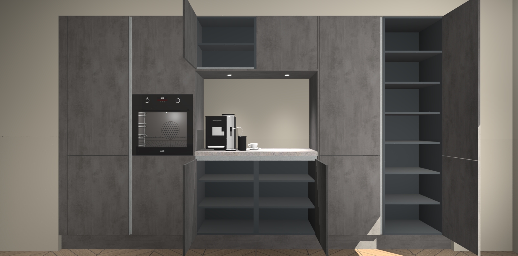 De Beton Antraciet greeploze keuken Lodz wordt geleverd met een set van 5 ingebouwde apparaten: Een oven, inductiekookplaat, afzuigkap, vaatwasser en koelkast. Deze kunnen gemakkelijk worden opgewaardeerd naar AEG. Met de gegarandeerde lage prijs en de snelle levering van 7 weken kan u er op rekenen dat de Beton Antraciet greeploze keuken Lodz zo snel mogelijk uw huis bereikt!