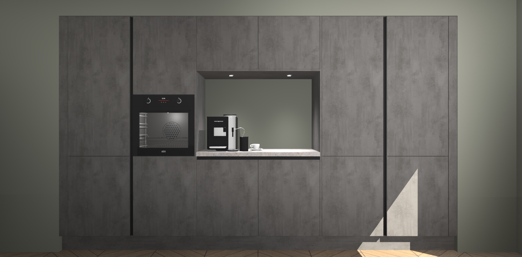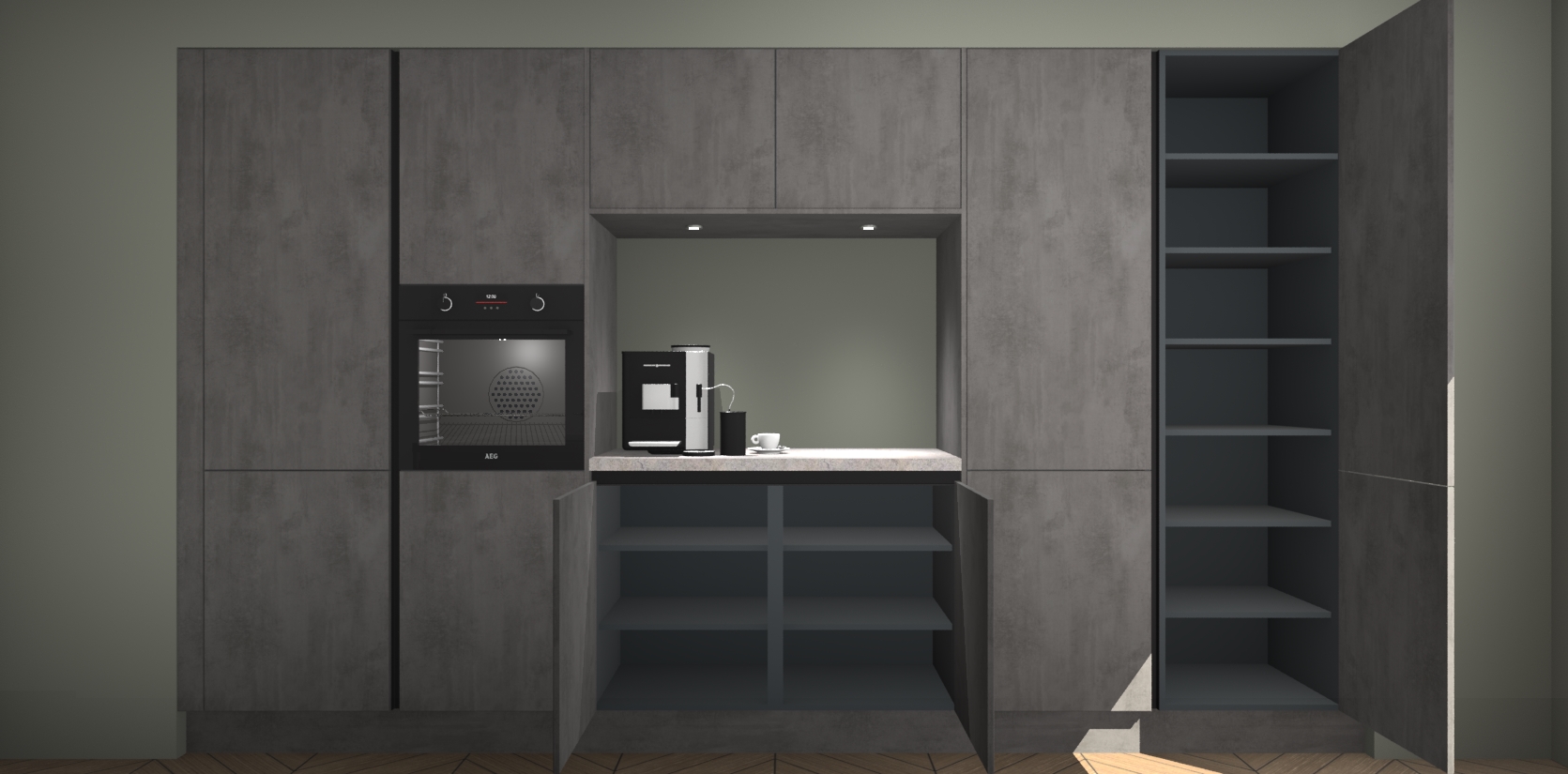 De Beton Antraciet greeploze keuken Lodz wordt geleverd met een set van 5 ingebouwde apparaten: Een oven, inductiekookplaat, afzuigkap, vaatwasser en koelkast. Deze kunnen gemakkelijk worden opgewaardeerd naar AEG. Met de gegarandeerde lage prijs en de snelle levering van 7 weken kan u er op rekenen dat de Beton Antraciet greeploze keuken Lodz zo snel mogelijk uw huis bereikt!