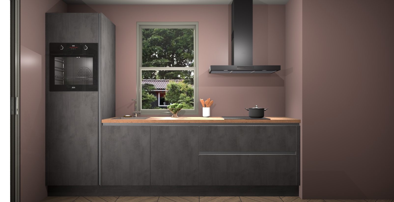 Een stijlvolle en praktische keuken als deze mag gezien worden. Dankzij de prachtige Beton Antraciet afwerking wordt de keuken gemakkelijk het middelpunt van uw huis - hij ziet er geweldig uit onder allerlei lichtomstandigheden, van dag tot nacht!