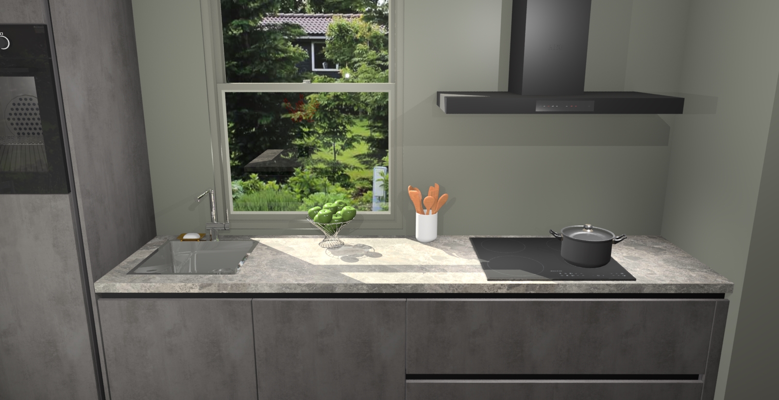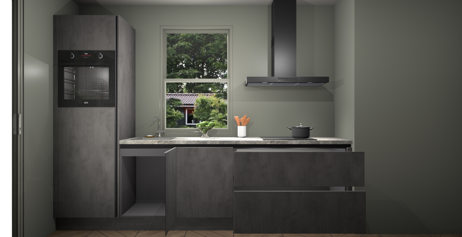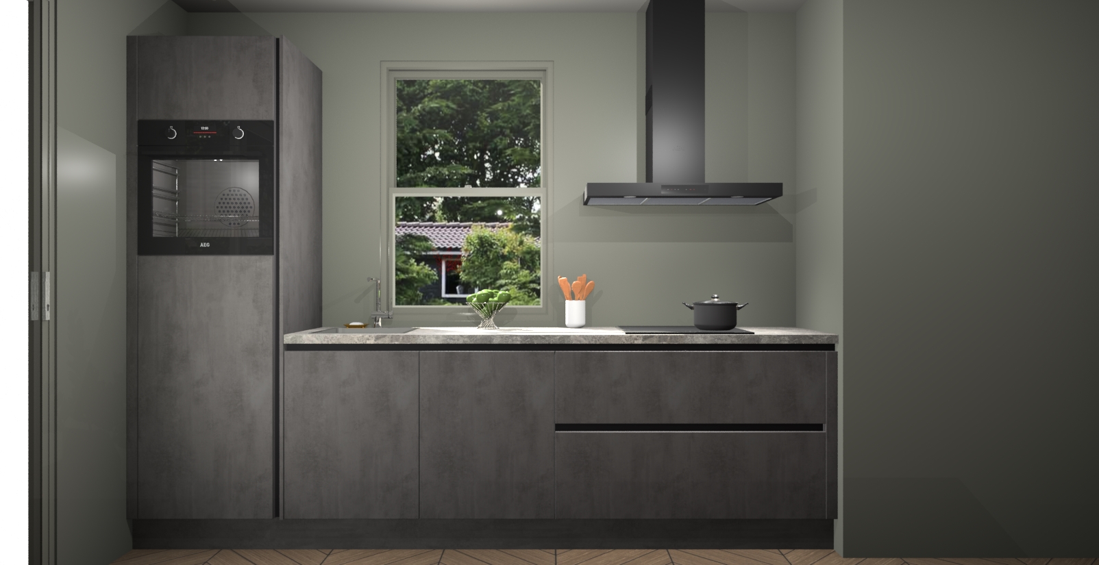 Een stijlvolle en praktische keuken als deze mag gezien worden. Dankzij de prachtige Beton Antraciet afwerking wordt de keuken gemakkelijk het middelpunt van uw huis - hij ziet er geweldig uit onder allerlei lichtomstandigheden, van dag tot nacht!