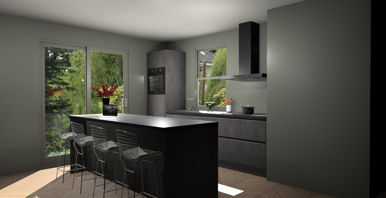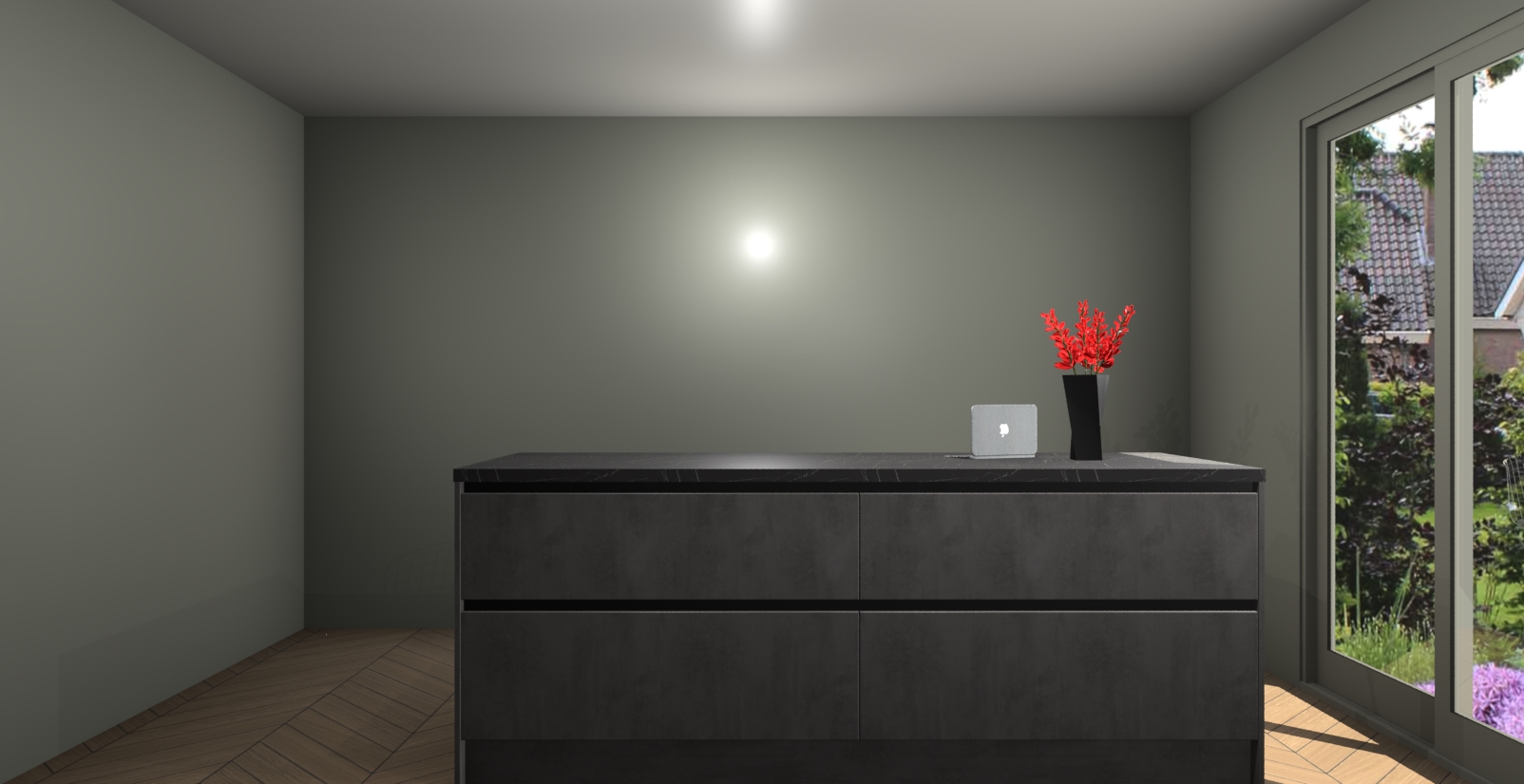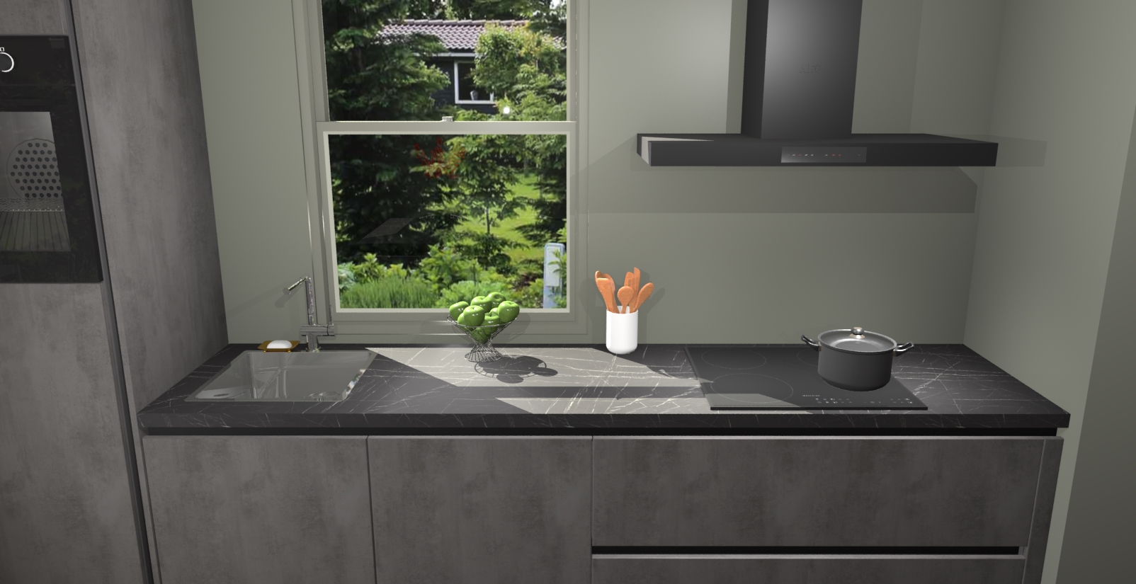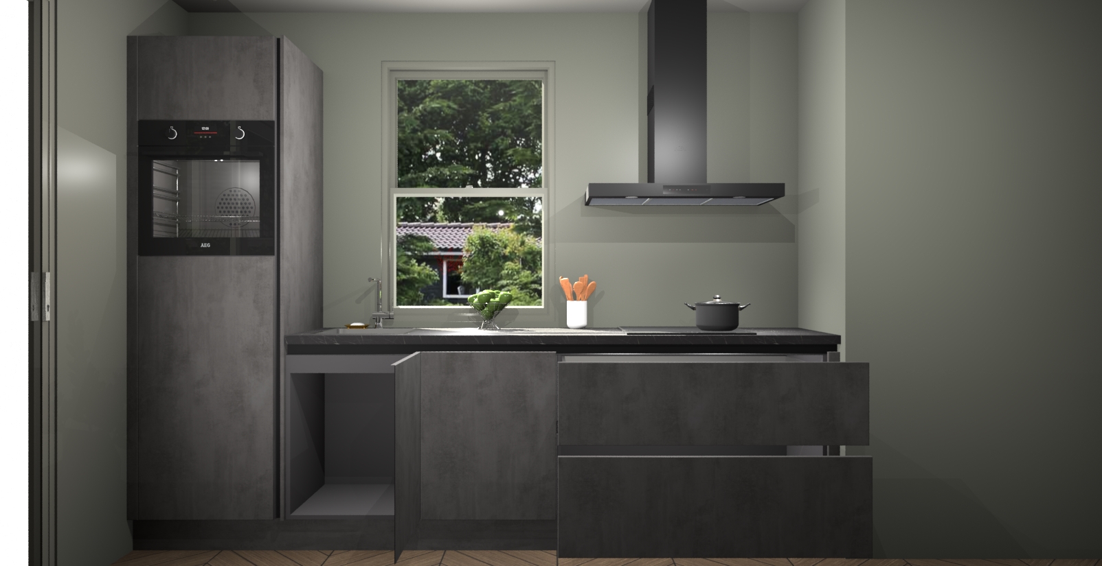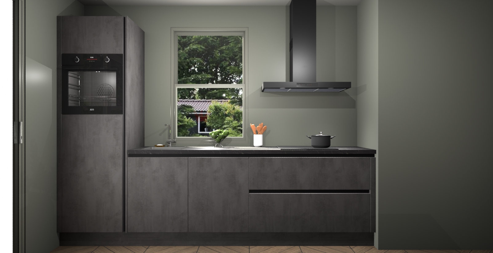 Een stijlvolle en praktische keuken als deze mag gezien worden. Dankzij de prachtige Beton Antraciet afwerking wordt de keuken gemakkelijk het middelpunt van uw huis - hij ziet er geweldig uit onder allerlei lichtomstandigheden, van dag tot nacht!