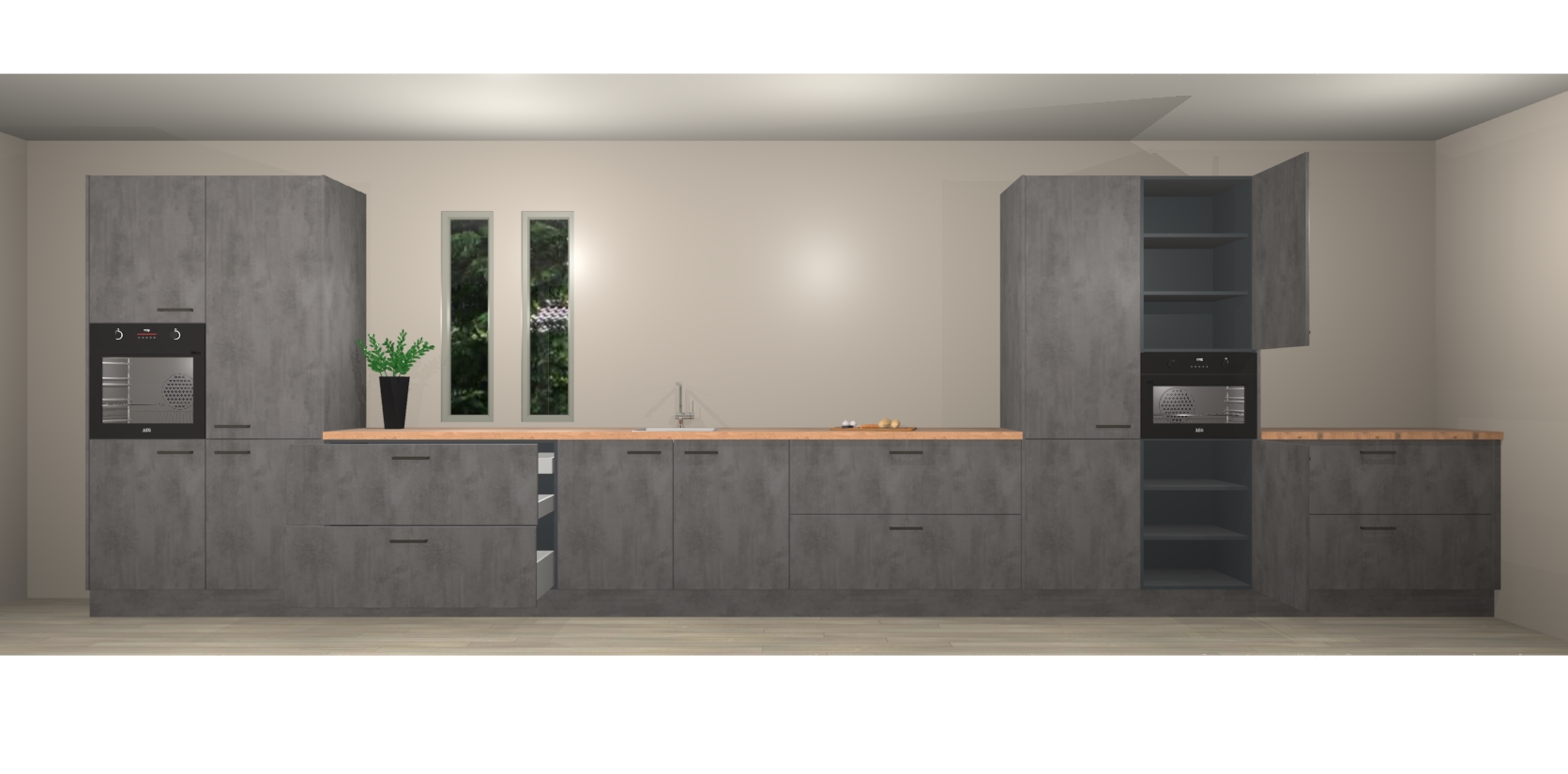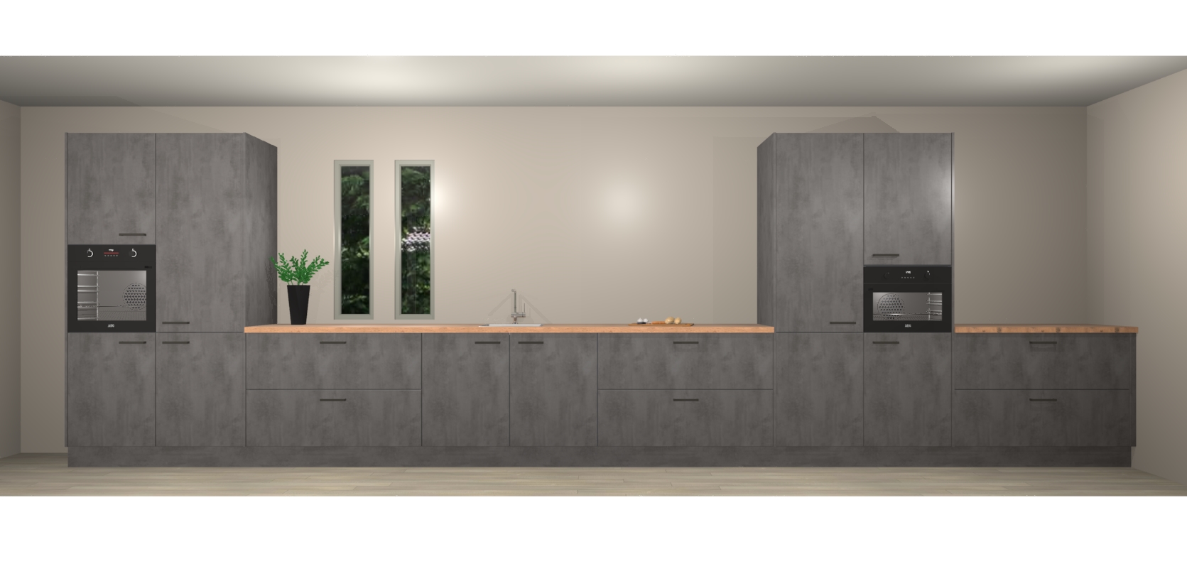 De perfecte toevoeging aan uw droomkeuken! De beton antraciet keuken Krakor is een opmerkelijke en verfijnde keuken. Hij is ontworpen met moderne lijnen en tijdloze schoonheid die garant staan voor een luxe uitstraling. Deze uiterst functionele en mooie keuken heeft een reeks verbazingwekkende functies: de overvloedige opbergruimte bevat soft close deuren, terwijl vijf inbouwapparaten zijn inbegrepen in de vaste lage prijs. Beter nog, uw beton antraciet keuken Krakor bestellen duurt slechts 7 weken met levering van voorgemonteerde kasten.