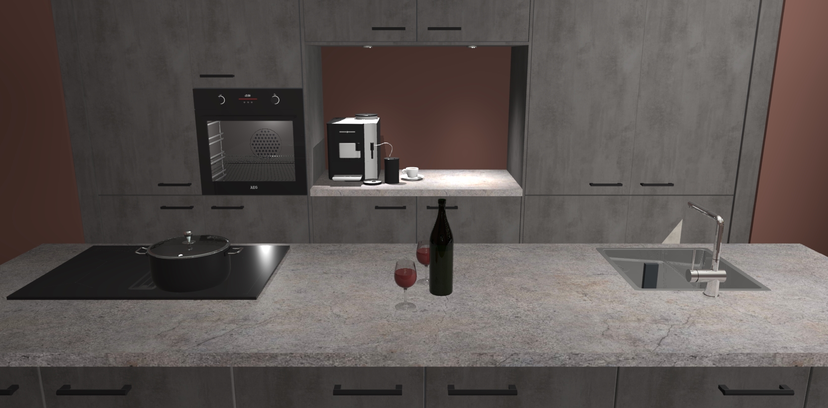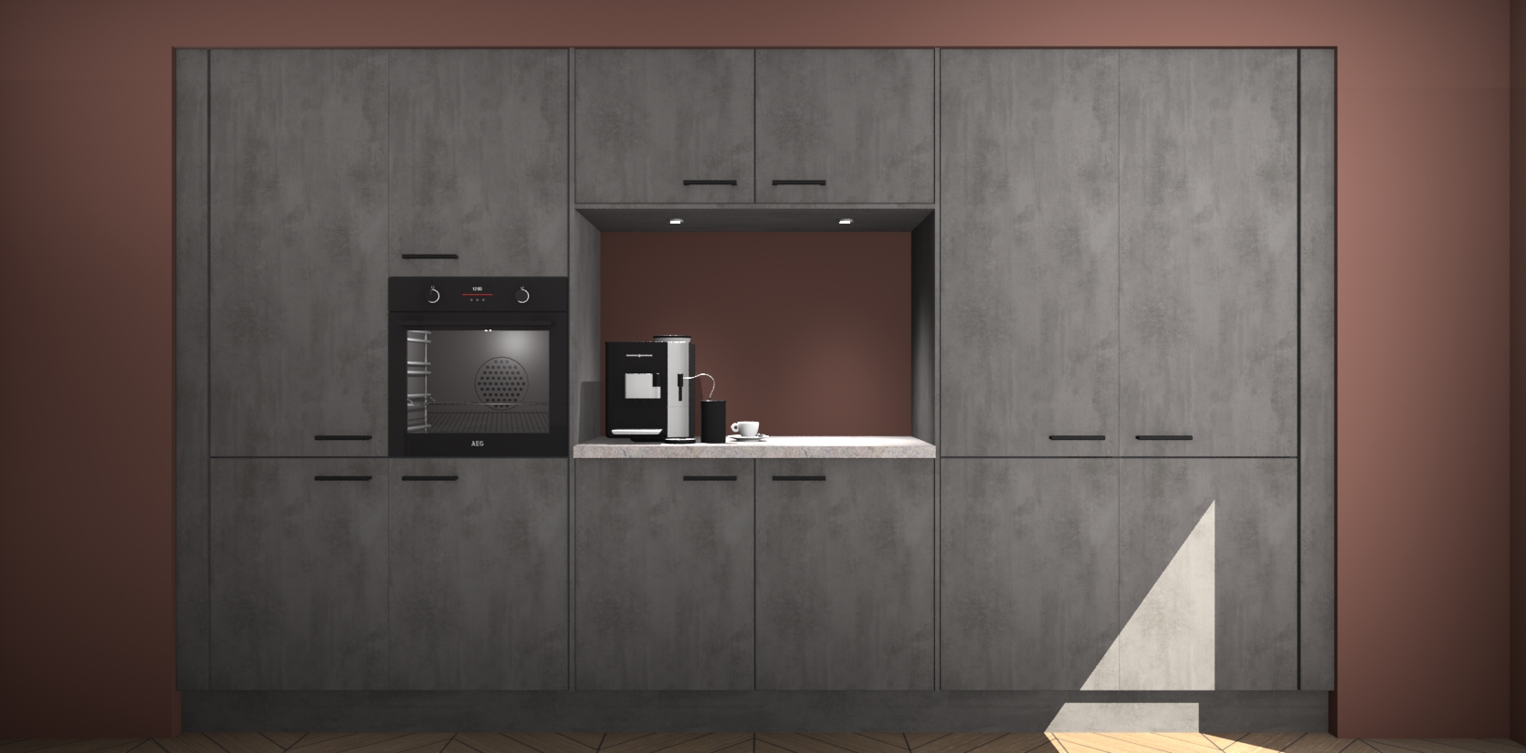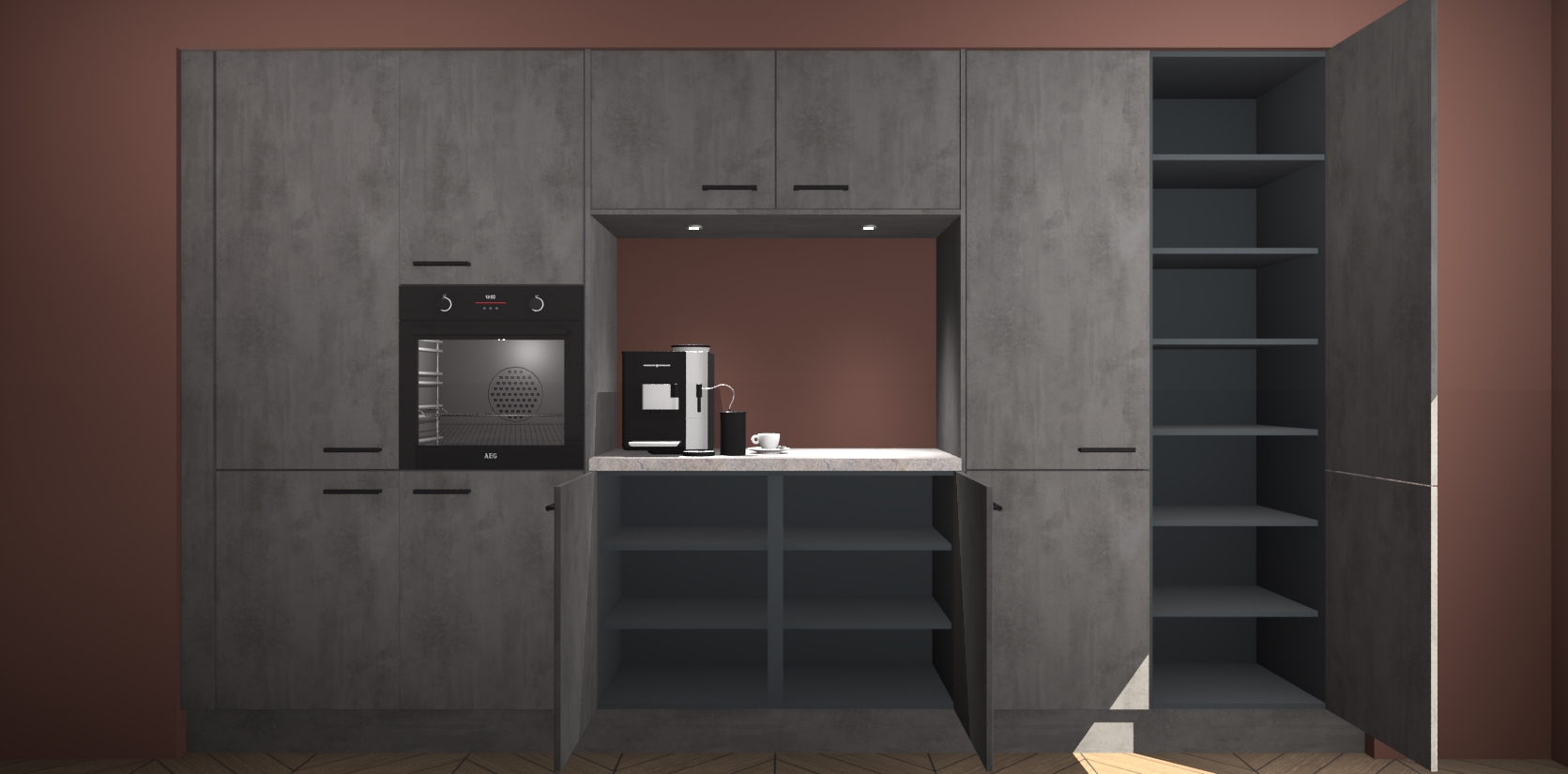 De Beton Antraciet keuken Lodz wordt geleverd met een set van 5 ingebouwde apparaten: Een oven, inductiekookplaat, afzuigkap, vaatwasser en koelkast. Deze kunnen gemakkelijk worden opgewaardeerd naar AEG. Met de gegarandeerde lage prijs en de snelle levering van 7 weken kan u er op rekenen dat de Beton Antraciet keuken Lodz zo snel mogelijk uw huis bereikt!