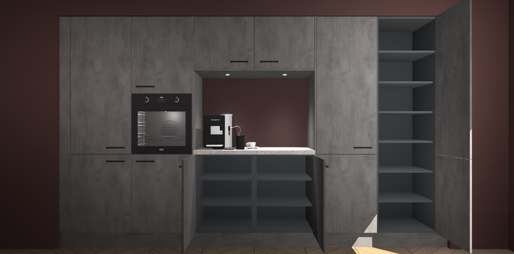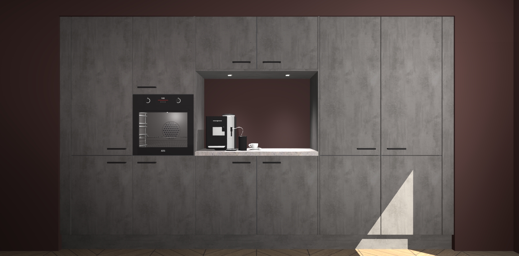 De Beton Antraciet keuken Lodz wordt geleverd met een set van 5 ingebouwde apparaten: Een oven, inductiekookplaat, afzuigkap, vaatwasser en koelkast. Deze kunnen gemakkelijk worden opgewaardeerd naar AEG. Met de gegarandeerde lage prijs en de snelle levering van 7 weken kan u er op rekenen dat de Beton Antraciet keuken Lodz zo snel mogelijk uw huis bereikt!