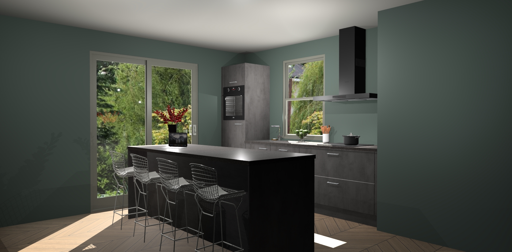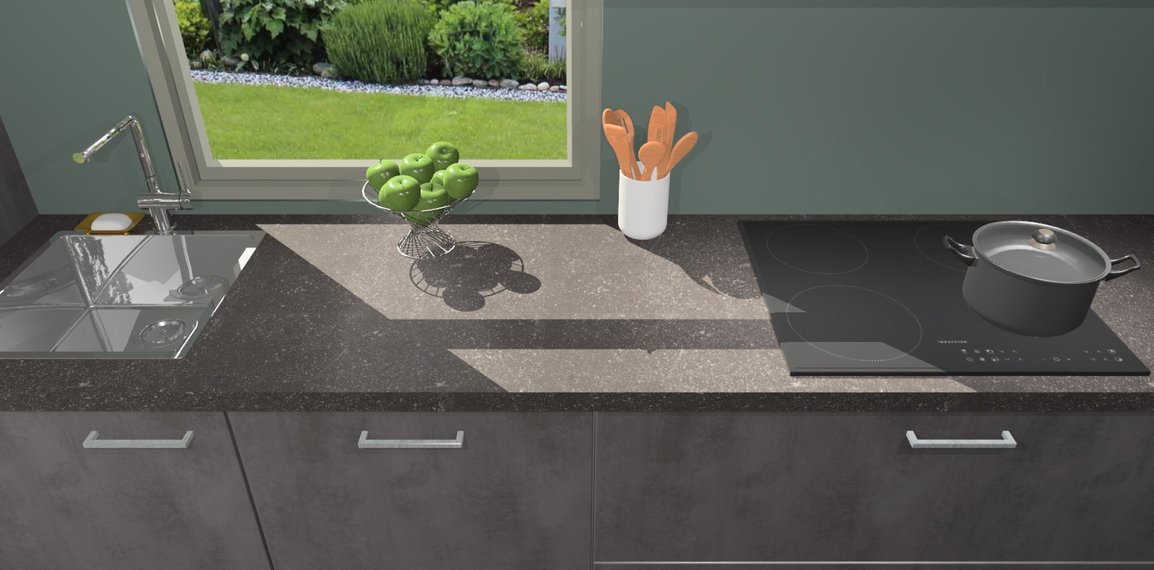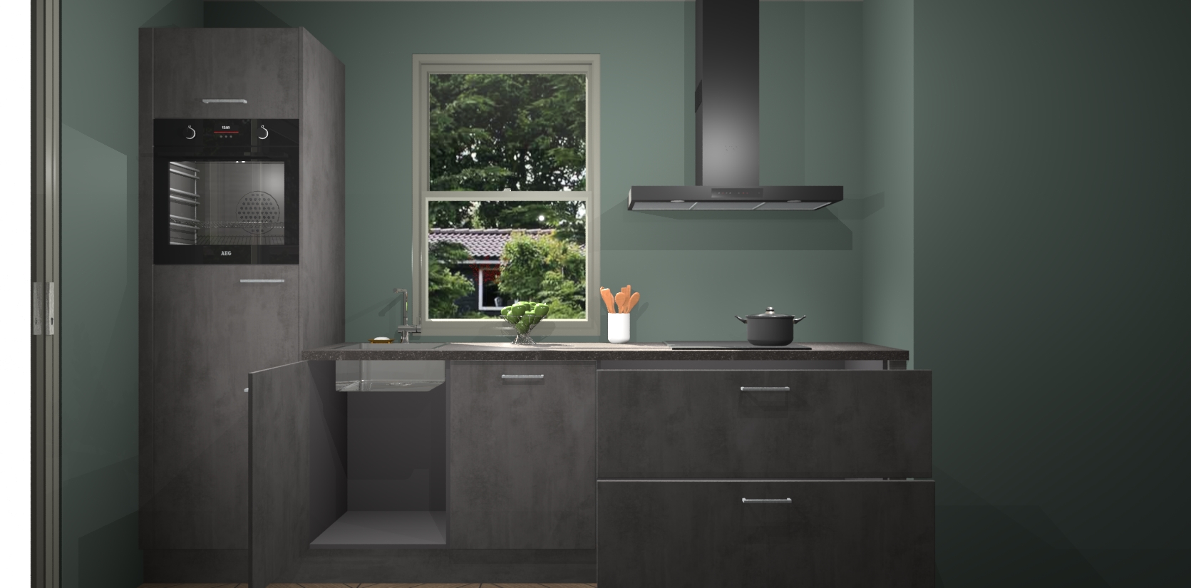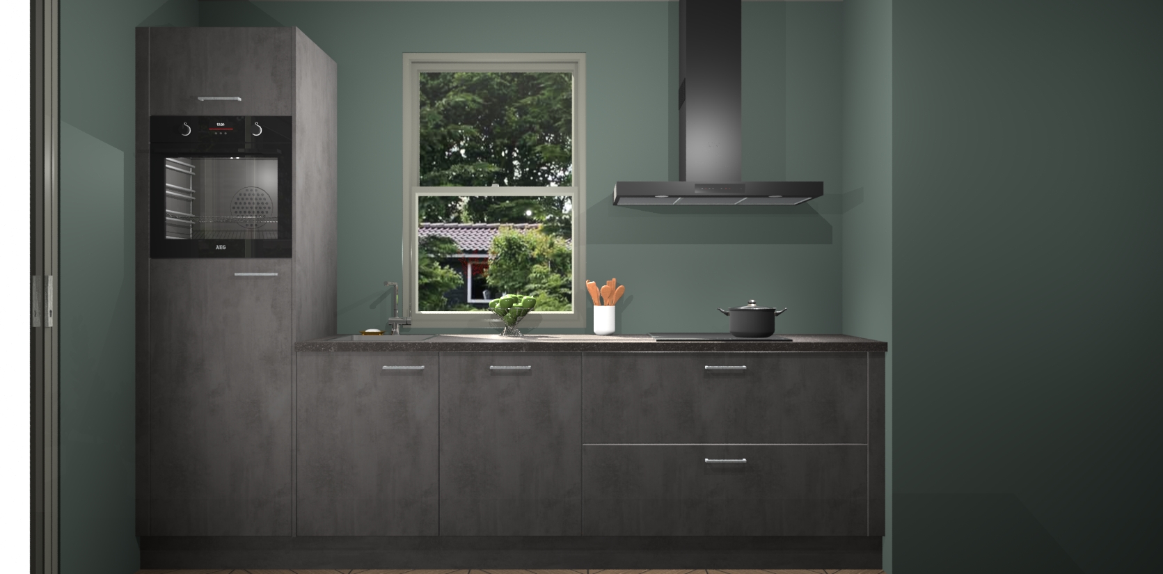Een stijlvolle en praktische keuken als deze mag gezien worden. Dankzij de prachtige Beton Antraciet afwerking wordt de keuken gemakkelijk het middelpunt van uw huis - hij ziet er geweldig uit onder allerlei lichtomstandigheden, van dag tot nacht!