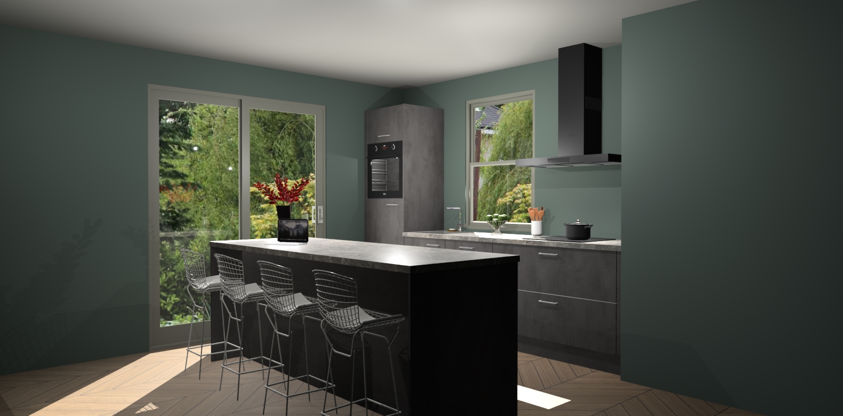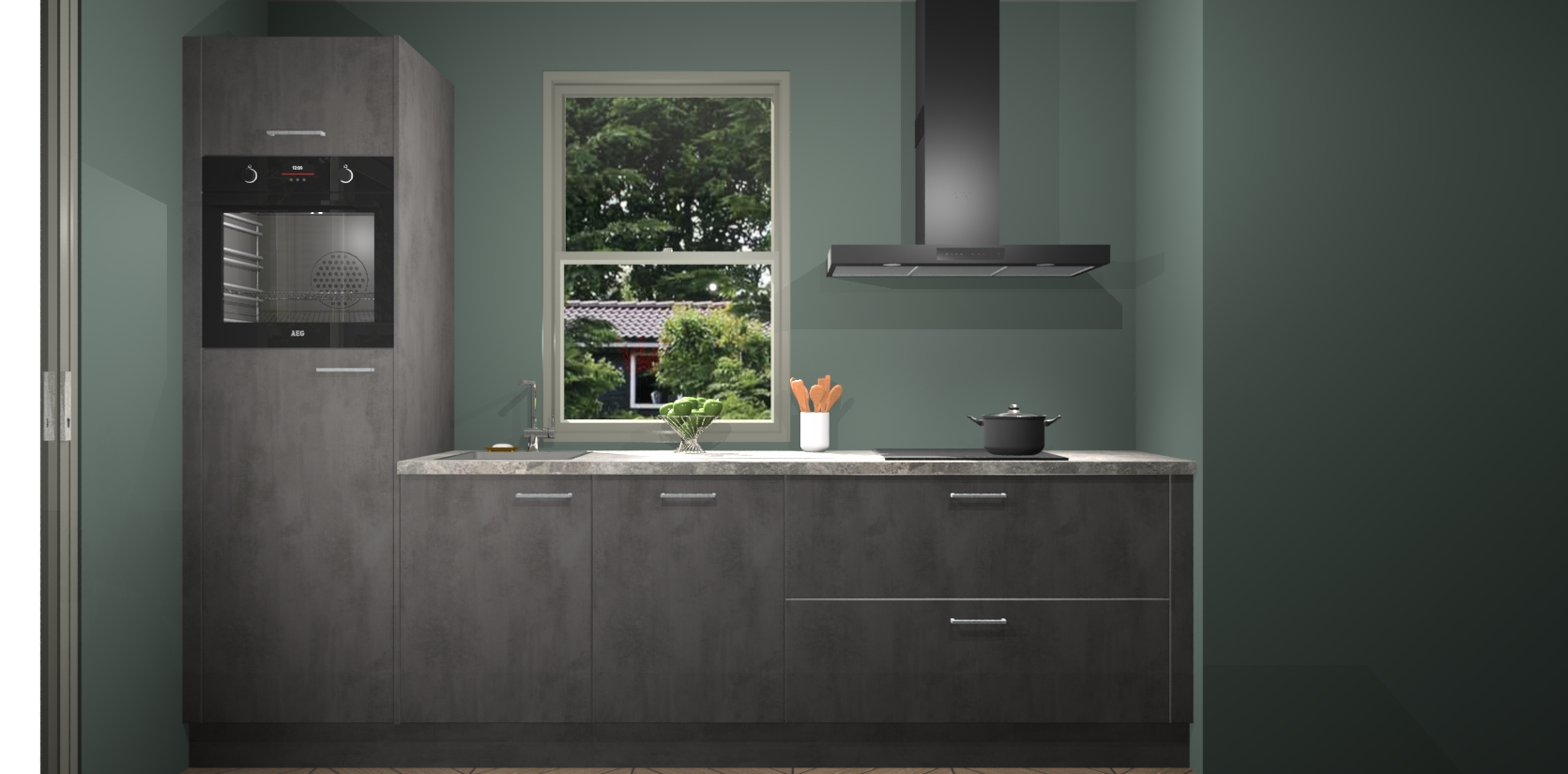 Een stijlvolle en praktische keuken als deze mag gezien worden. Dankzij de prachtige Beton Antraciet afwerking wordt de keuken gemakkelijk het middelpunt van uw huis - hij ziet er geweldig uit onder allerlei lichtomstandigheden, van dag tot nacht!