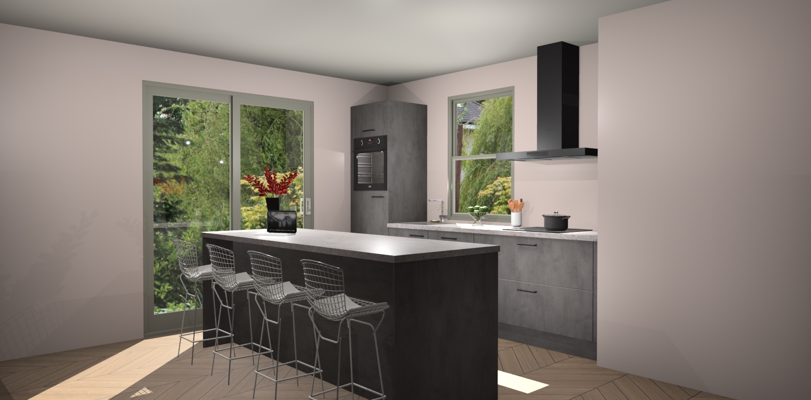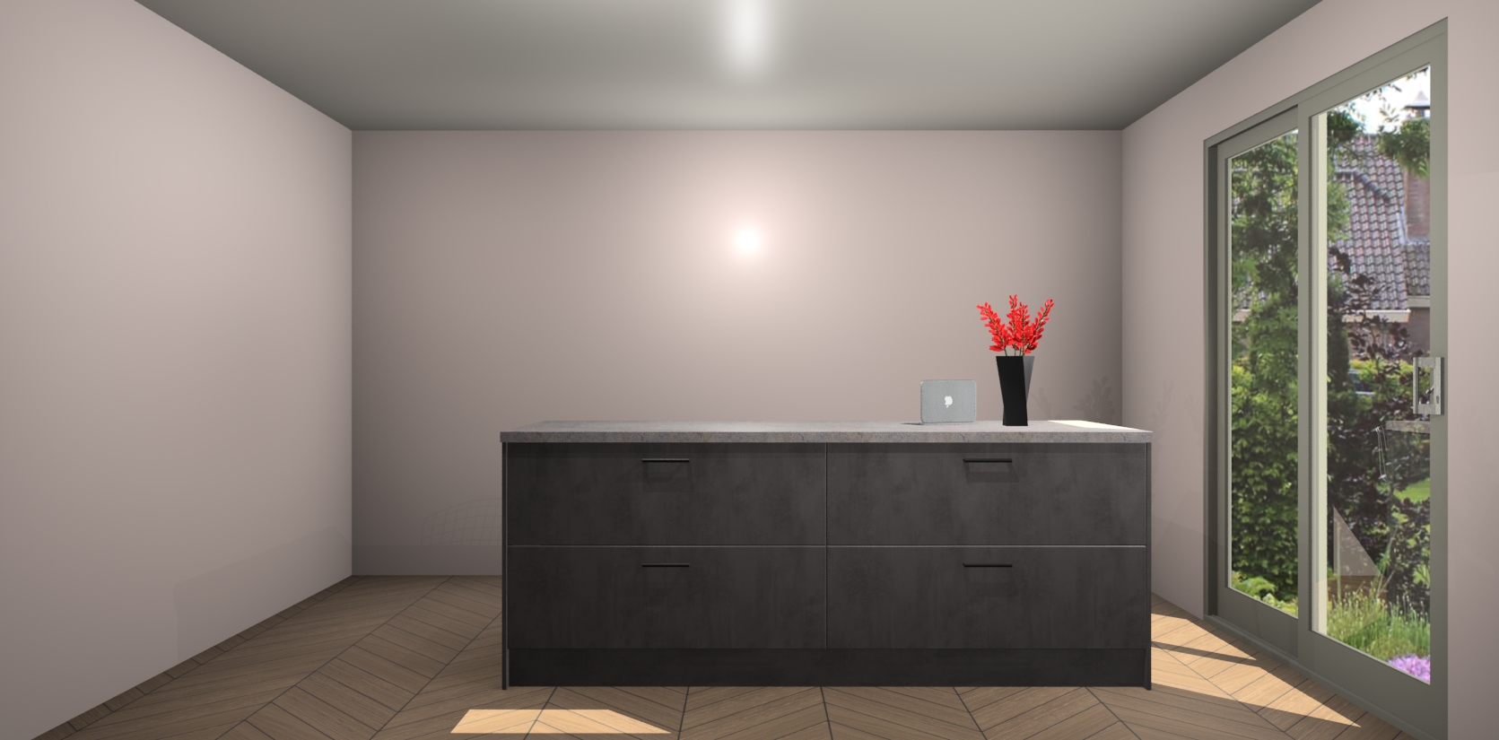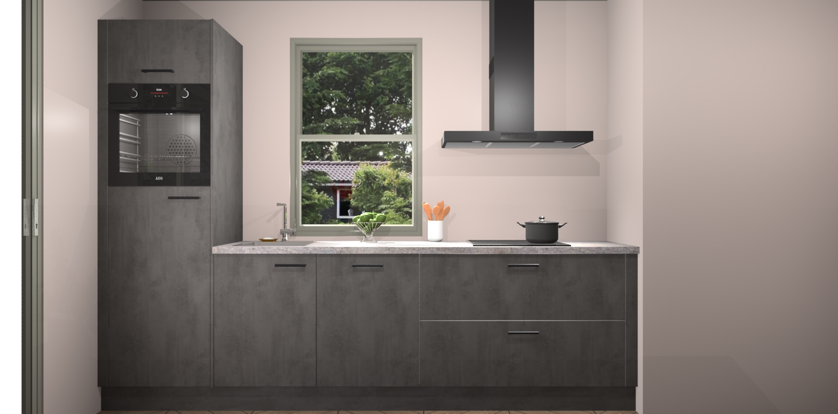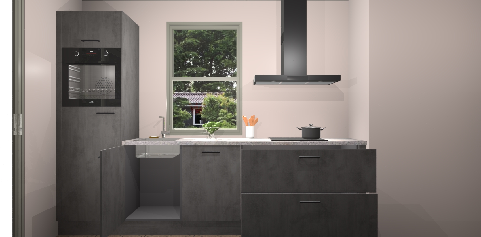 Een stijlvolle en praktische keuken als deze mag gezien worden. Dankzij de prachtige Beton Antraciet afwerking wordt de keuken gemakkelijk het middelpunt van uw huis - hij ziet er geweldig uit onder allerlei lichtomstandigheden, van dag tot nacht!