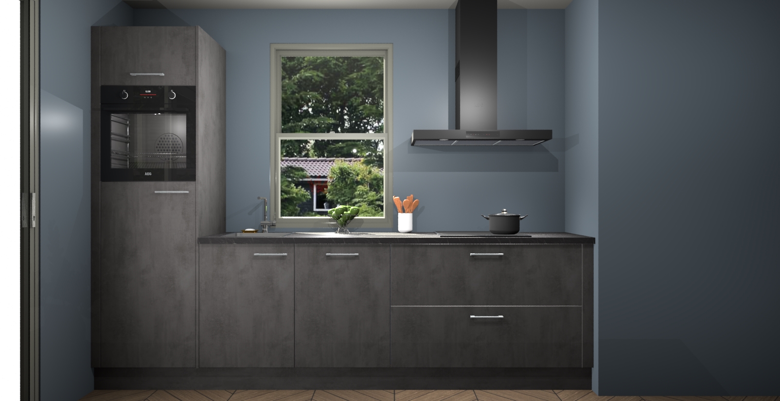 Een stijlvolle en praktische keuken als deze mag gezien worden. Dankzij de prachtige Beton Antraciet afwerking wordt de keuken gemakkelijk het middelpunt van uw huis - hij ziet er geweldig uit onder allerlei lichtomstandigheden, van dag tot nacht!