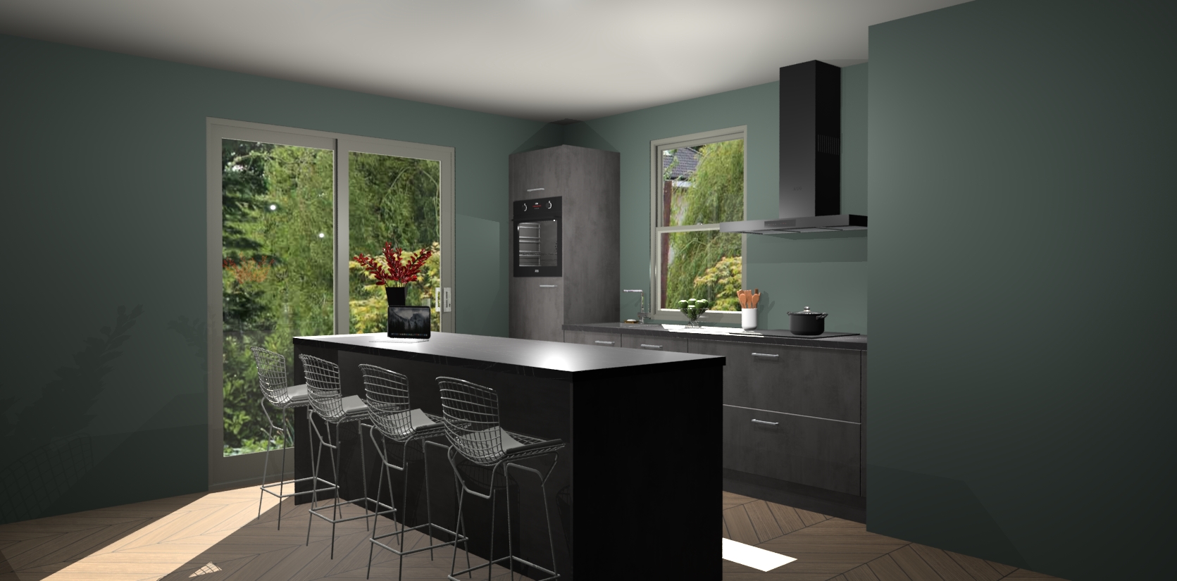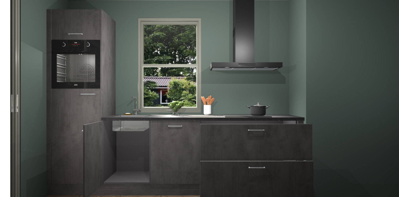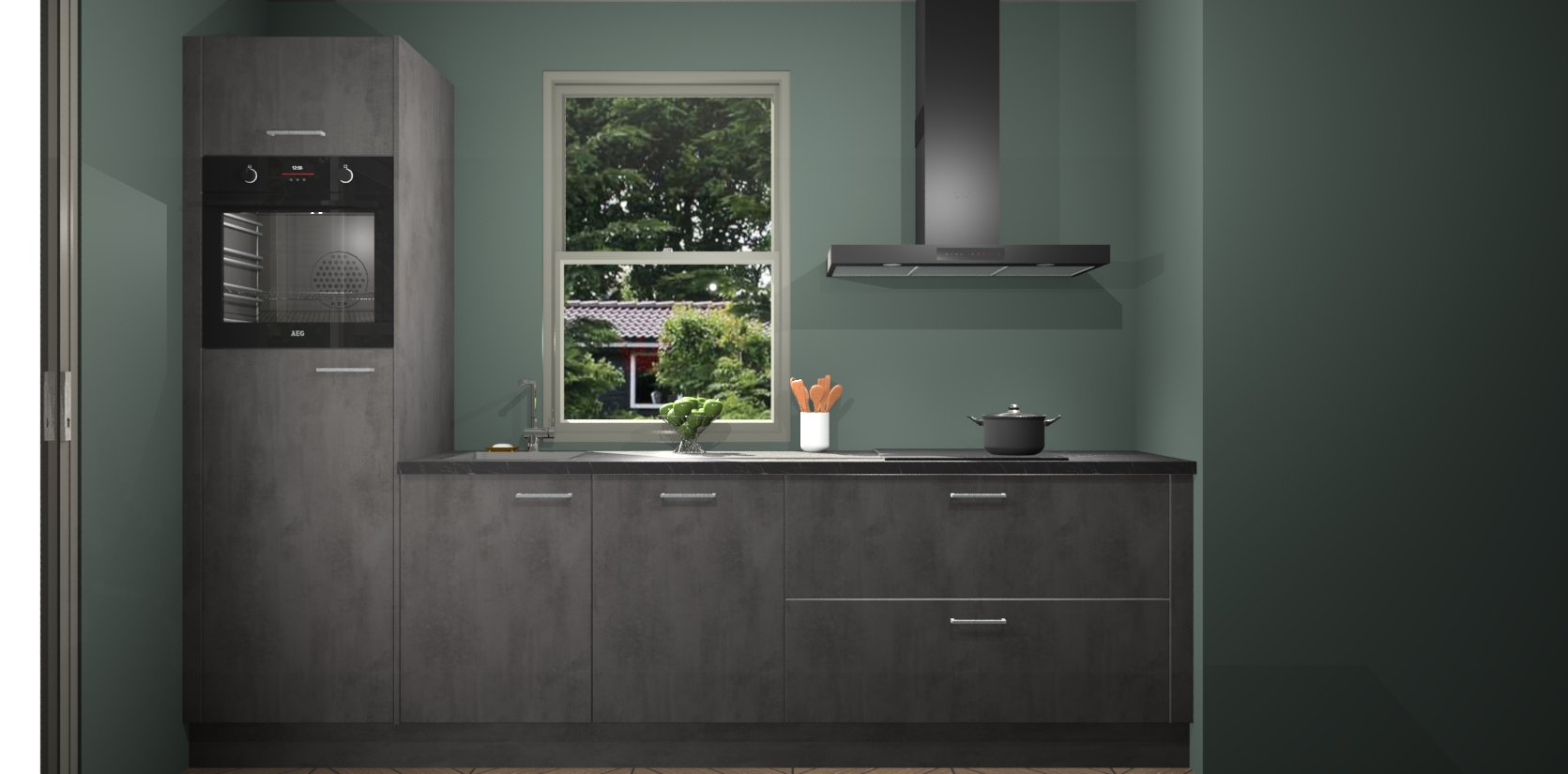 Een stijlvolle en praktische keuken als deze mag gezien worden. Dankzij de prachtige Beton Antraciet afwerking wordt de keuken gemakkelijk het middelpunt van uw huis - hij ziet er geweldig uit onder allerlei lichtomstandigheden, van dag tot nacht!