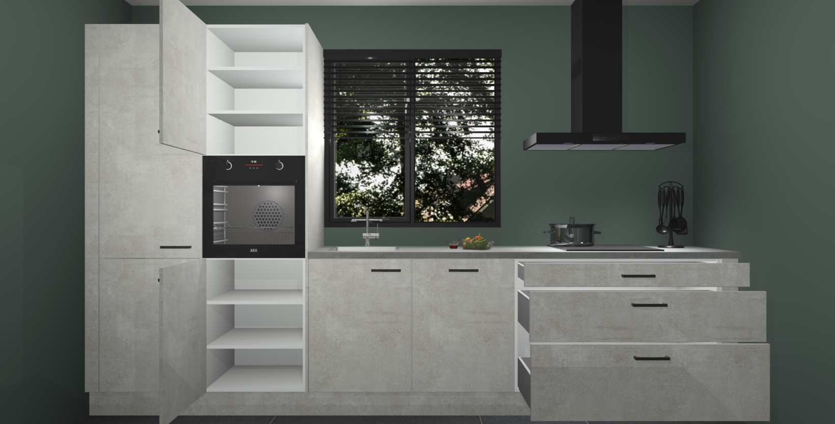 Maak kennis met de beton opaal keuken Bonaire: de perfecte balans tussen tijdloos en modern. Met voldoende opbergruimte zal deze keuken de afgunst van uw vrienden en familie zijn, terwijl uw leven moeiteloos georganiseerd en rommelvrij blijft.
