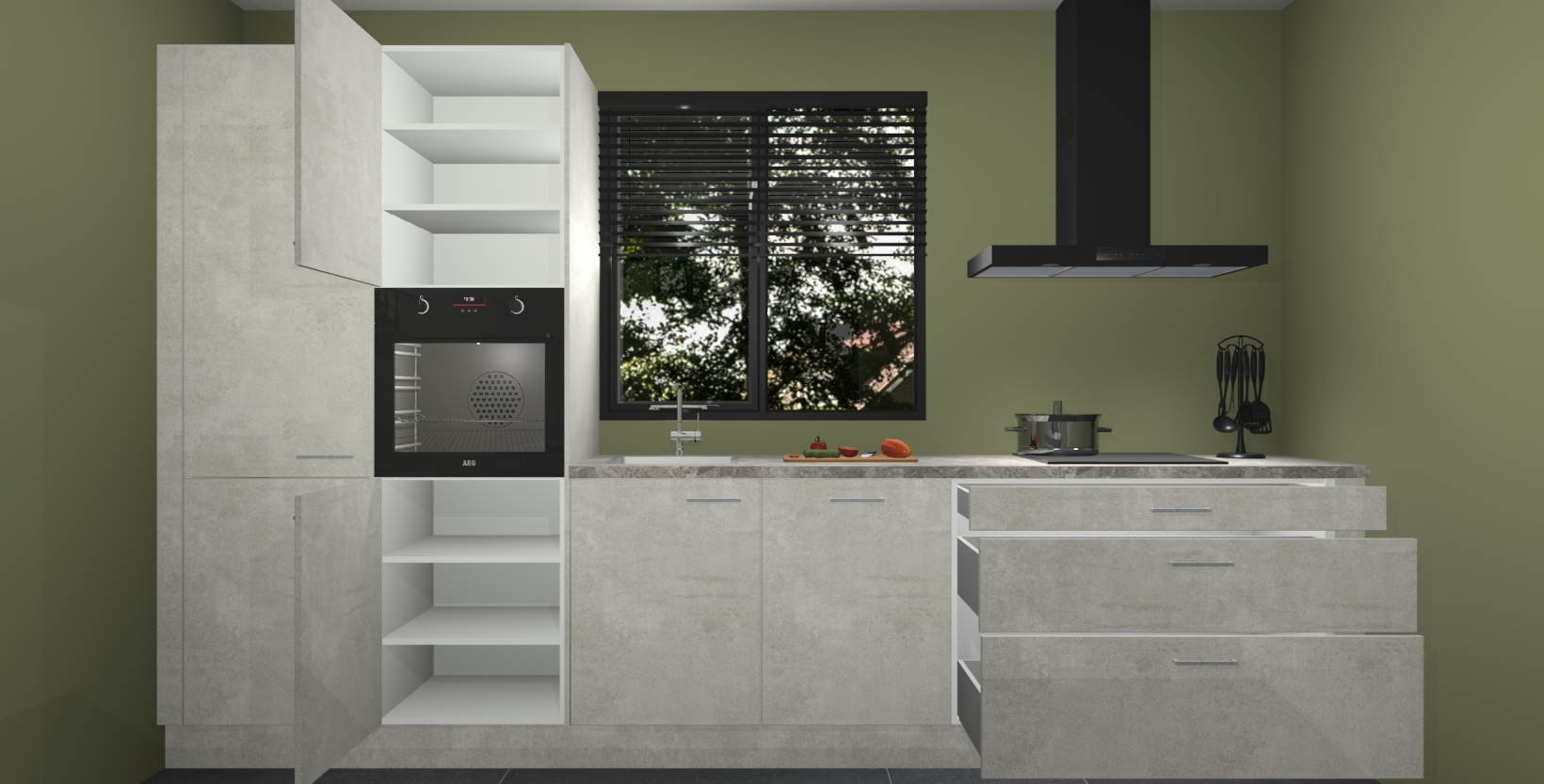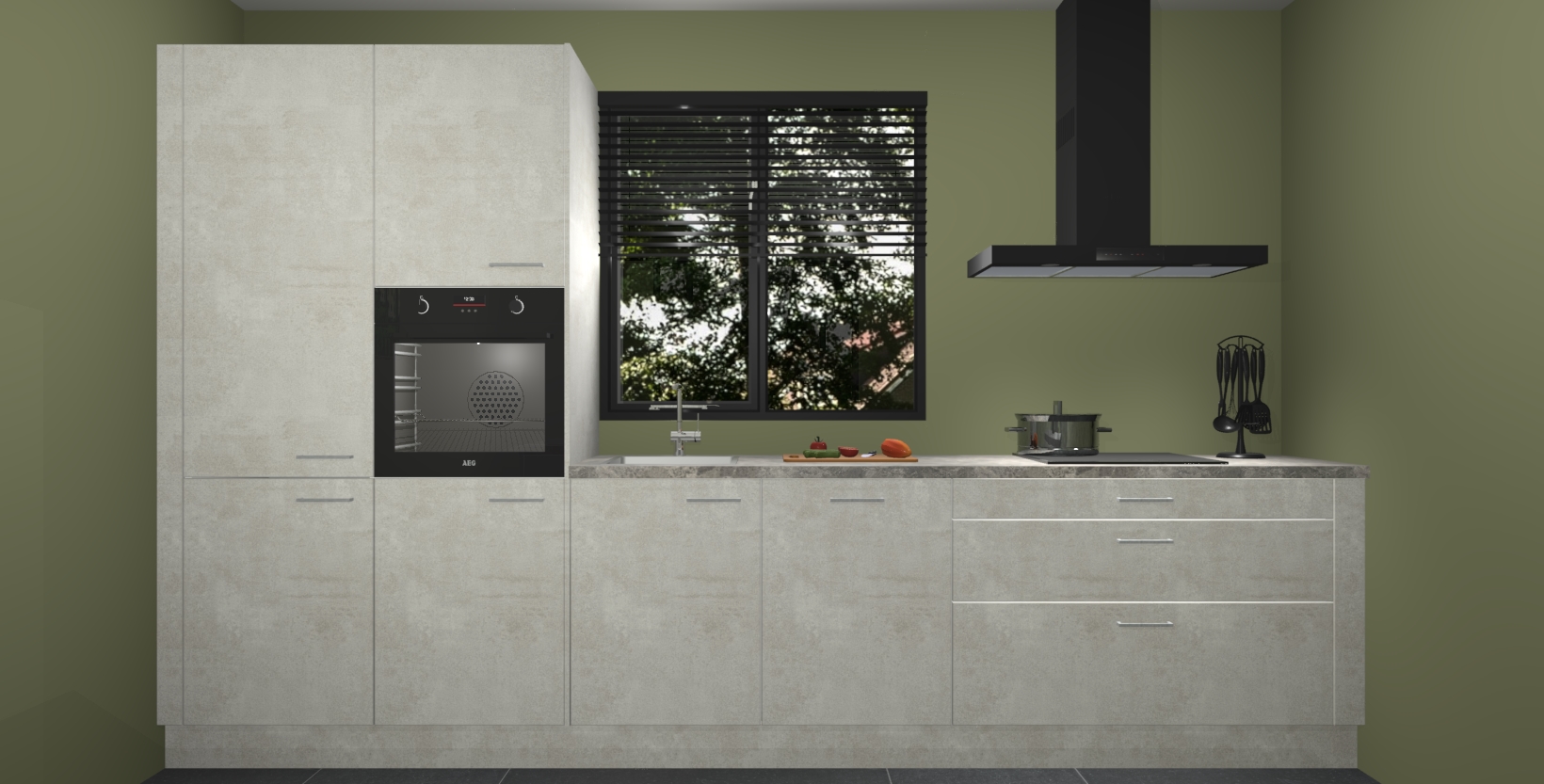 Maak kennis met de beton opaal keuken Bonaire: de perfecte balans tussen tijdloos en modern. Met voldoende opbergruimte zal deze keuken de afgunst van uw vrienden en familie zijn, terwijl uw leven moeiteloos georganiseerd en rommelvrij blijft.