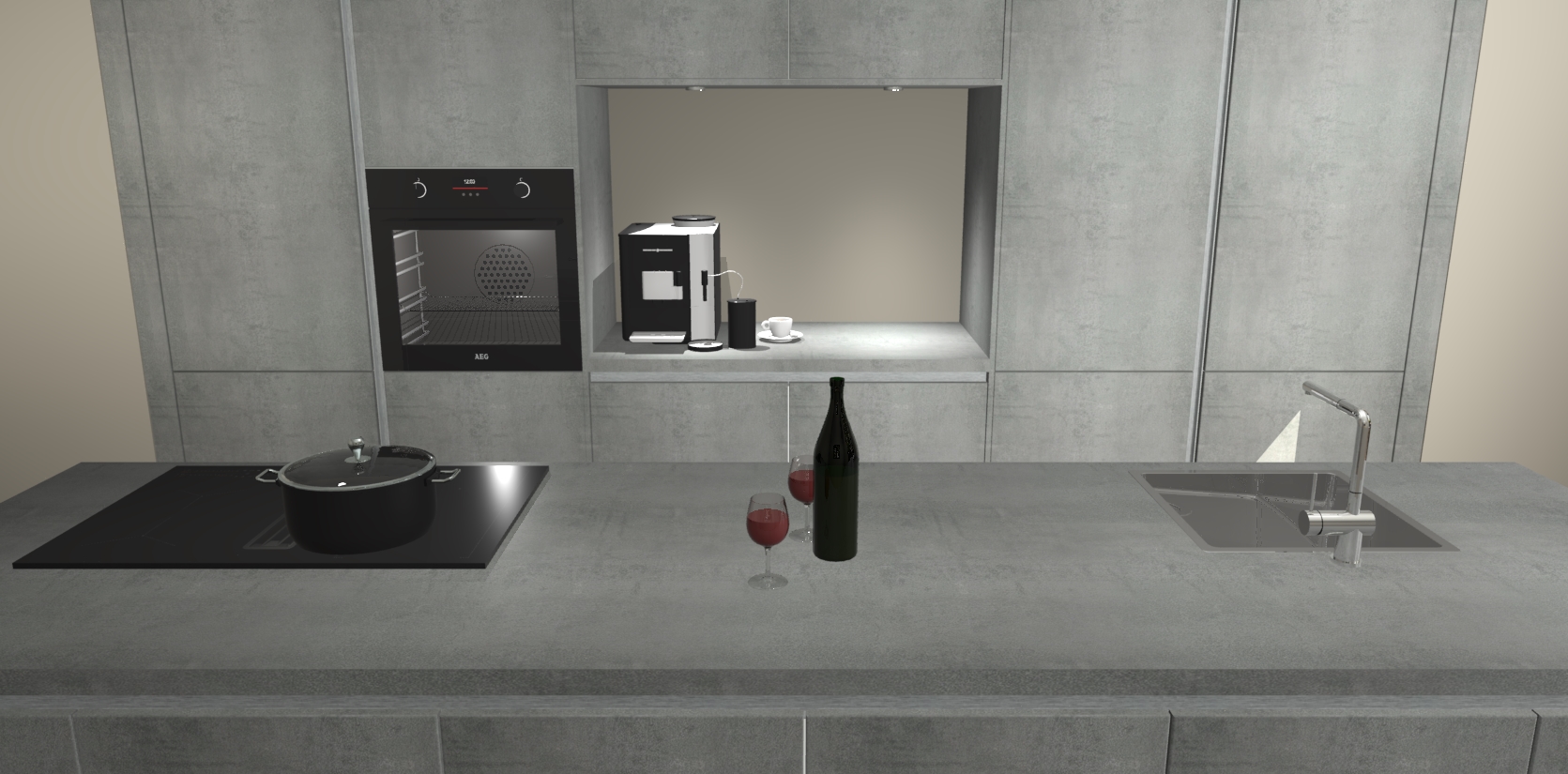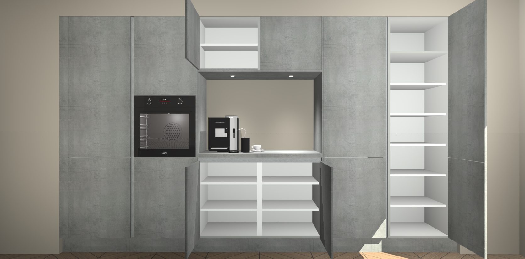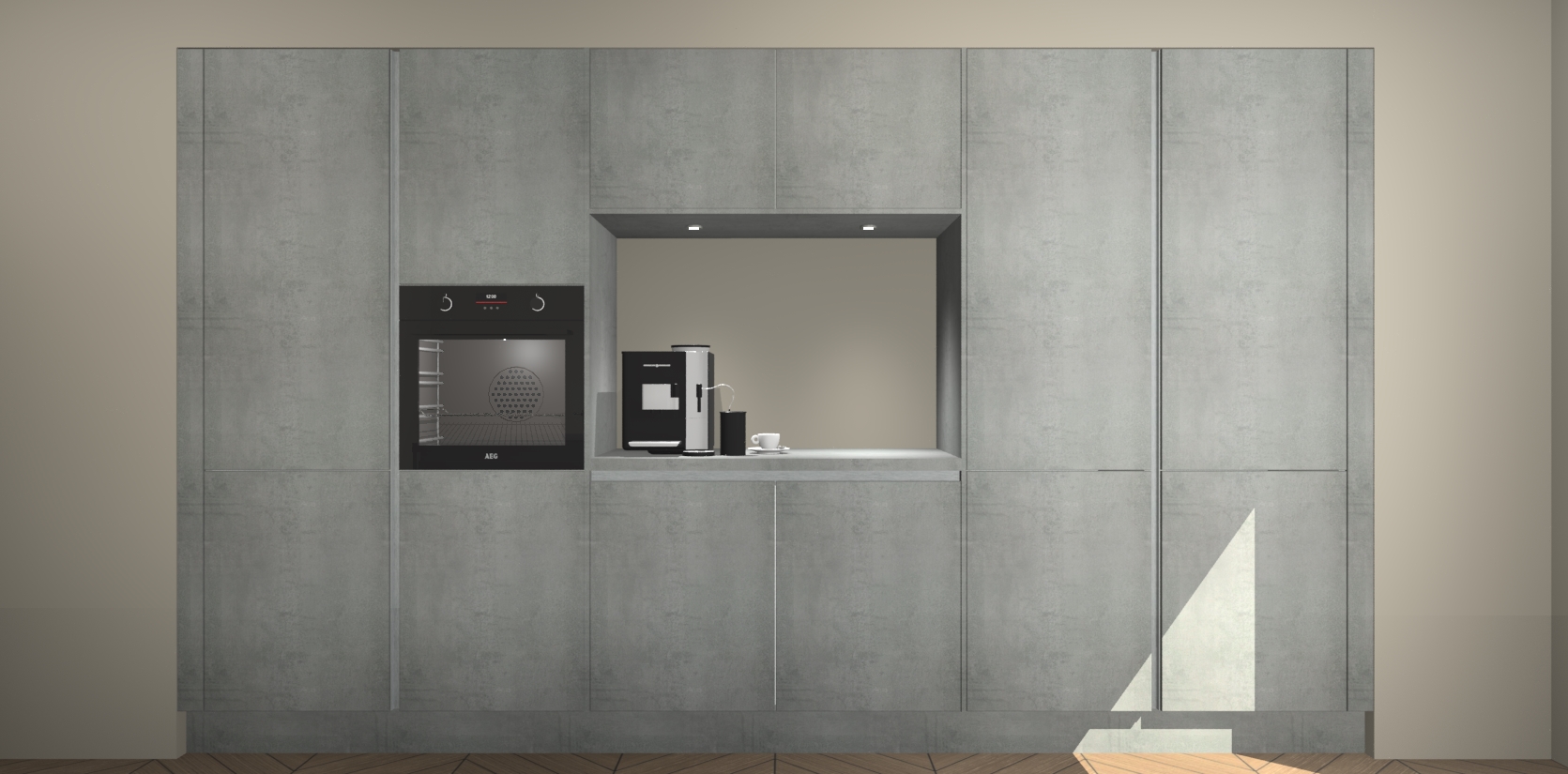 De Beton Parelgrijs greeploze keuken Lodz wordt geleverd met een set van 5 ingebouwde apparaten: Een oven, inductiekookplaat, afzuigkap, vaatwasser en koelkast. Deze kunnen gemakkelijk worden opgewaardeerd naar AEG. Met de gegarandeerde lage prijs en de snelle levering van 7 weken kan u er op rekenen dat de Beton Parelgrijs greeploze keuken Lodz zo snel mogelijk uw huis bereikt!
