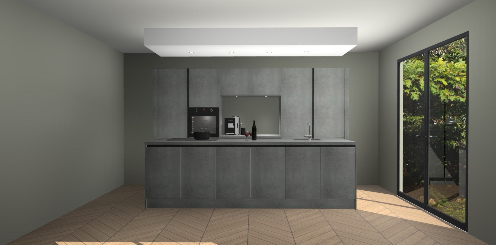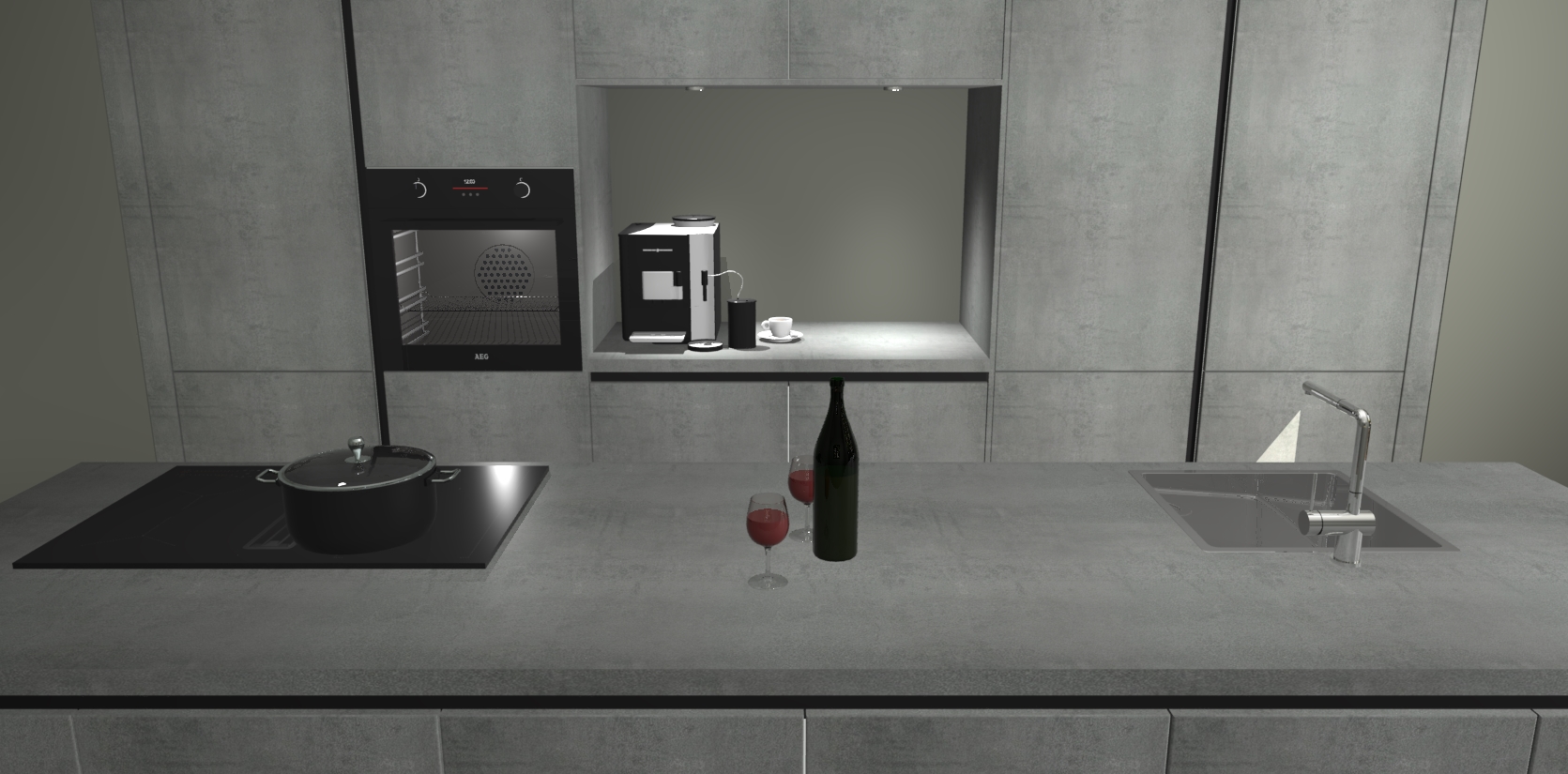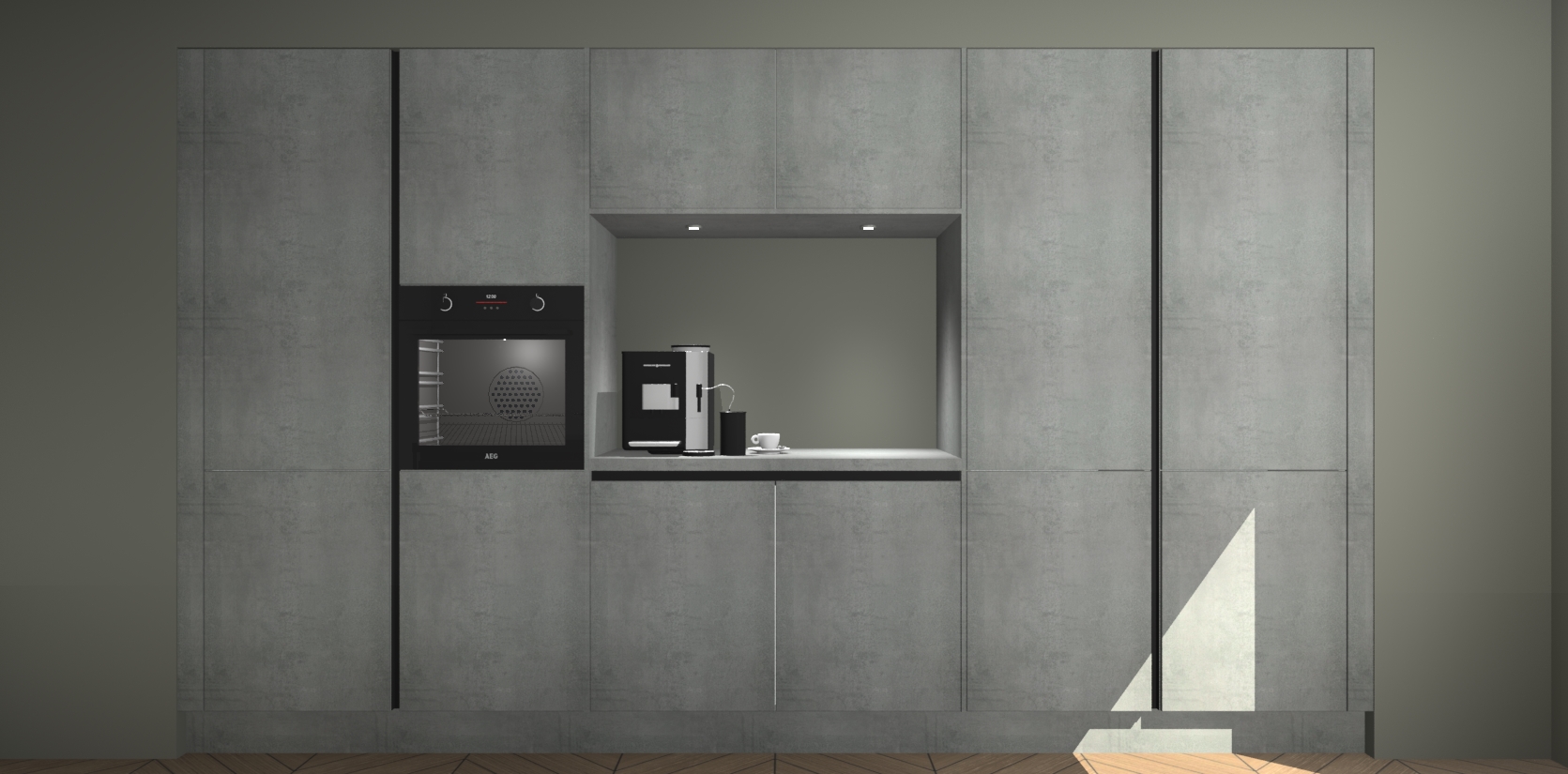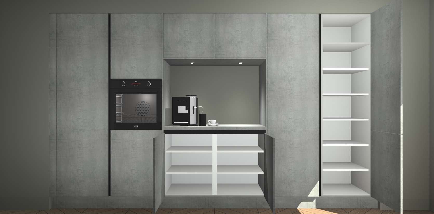 De Beton Parelgrijs greeploze keuken Lodz wordt geleverd met een set van 5 ingebouwde apparaten: Een oven, inductiekookplaat, afzuigkap, vaatwasser en koelkast. Deze kunnen gemakkelijk worden opgewaardeerd naar AEG. Met de gegarandeerde lage prijs en de snelle levering van 7 weken kan u er op rekenen dat de Beton Parelgrijs greeploze keuken Lodz zo snel mogelijk uw huis bereikt!