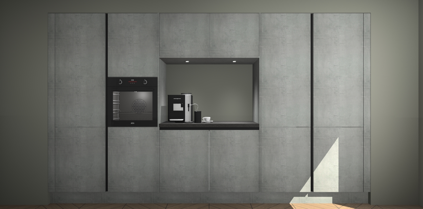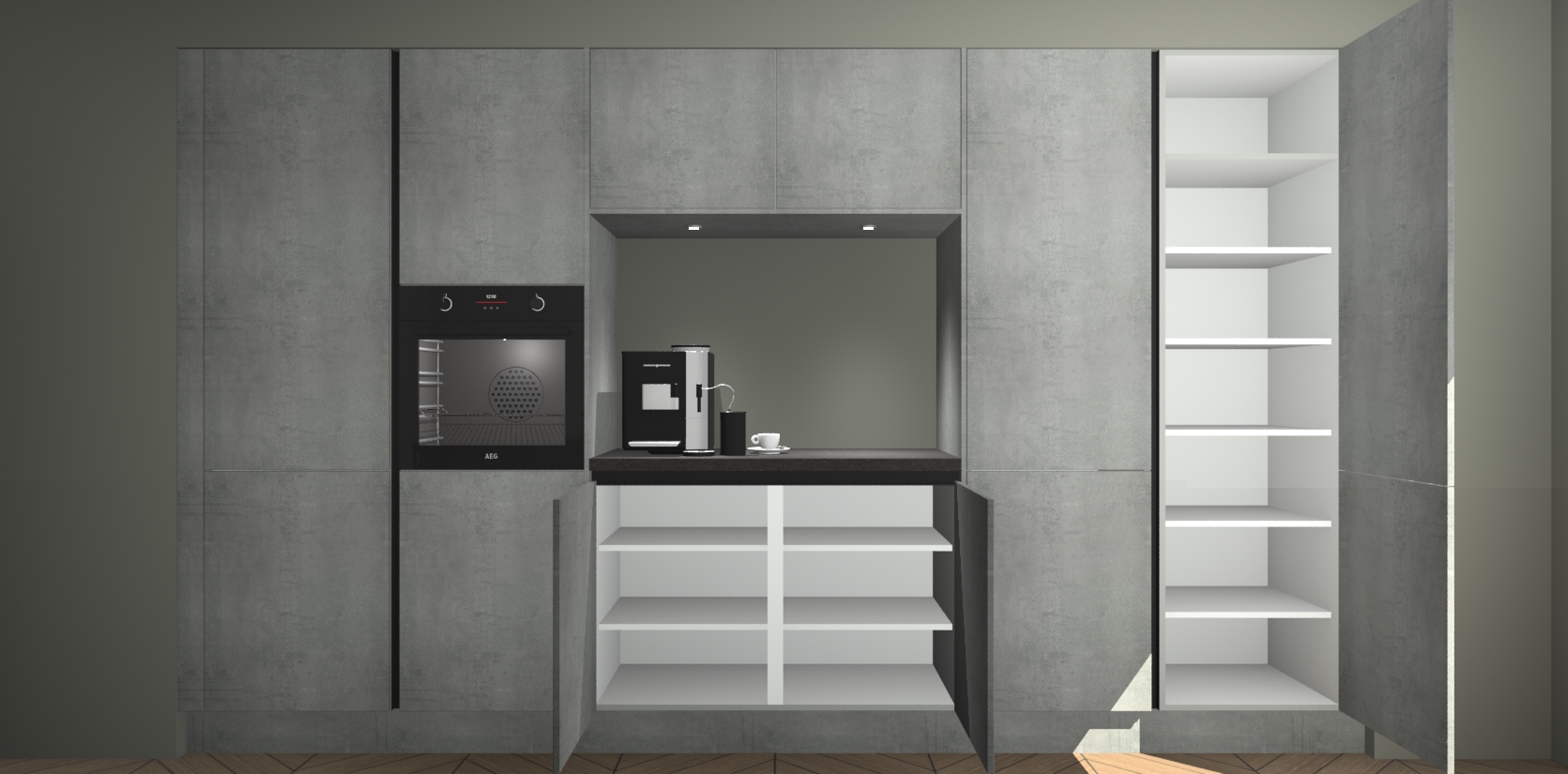De Beton Parelgrijs greeploze keuken Lodz wordt geleverd met een set van 5 ingebouwde apparaten: Een oven, inductiekookplaat, afzuigkap, vaatwasser en koelkast. Deze kunnen gemakkelijk worden opgewaardeerd naar AEG. Met de gegarandeerde lage prijs en de snelle levering van 7 weken kan u er op rekenen dat de Beton Parelgrijs greeploze keuken Lodz zo snel mogelijk uw huis bereikt!