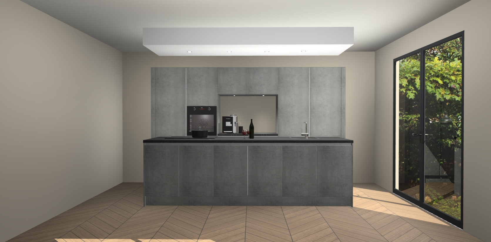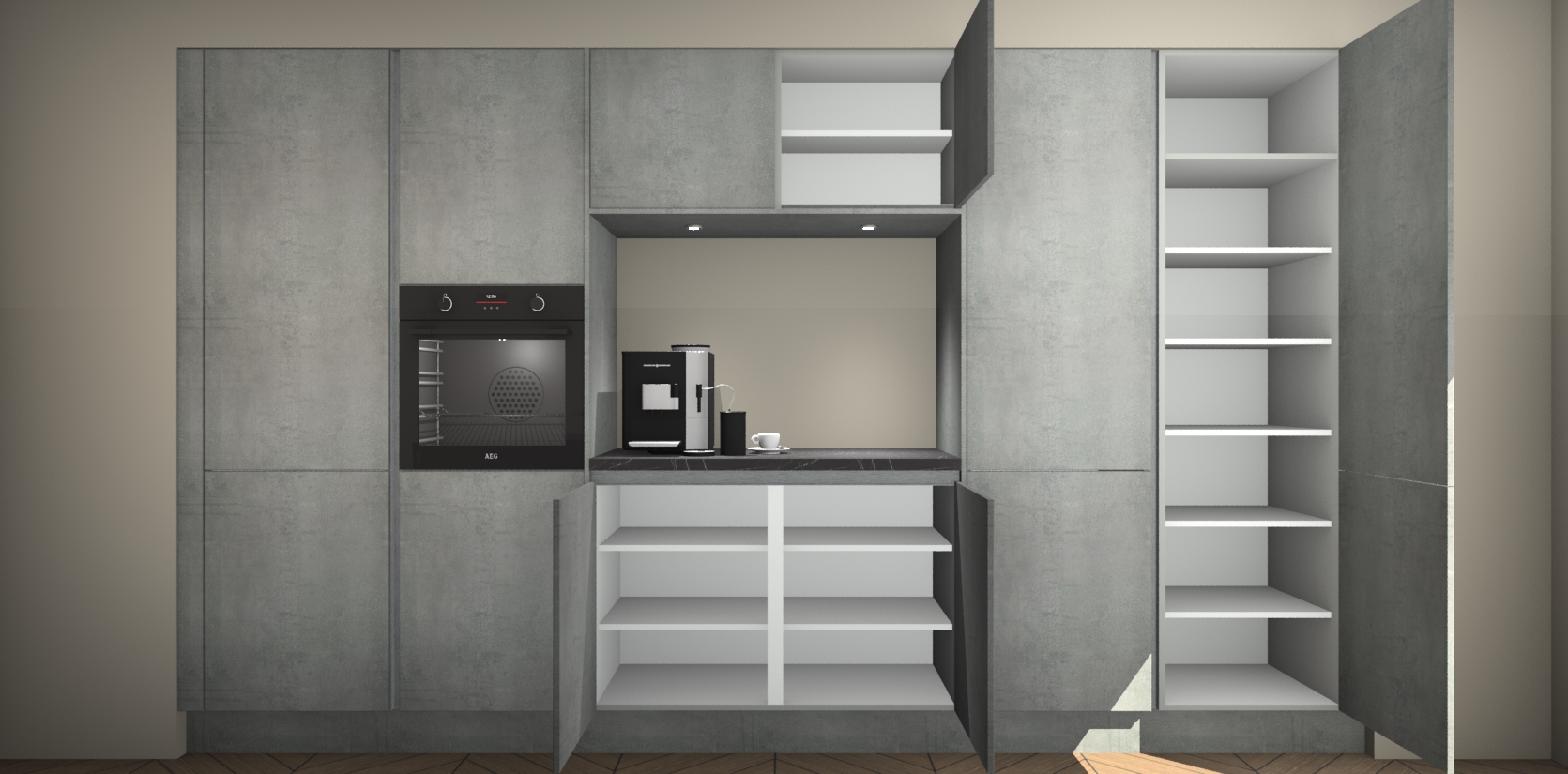 De Beton Parelgrijs greeploze keuken Lodz wordt geleverd met een set van 5 ingebouwde apparaten: Een oven, inductiekookplaat, afzuigkap, vaatwasser en koelkast. Deze kunnen gemakkelijk worden opgewaardeerd naar AEG. Met de gegarandeerde lage prijs en de snelle levering van 7 weken kan u er op rekenen dat de Beton Parelgrijs greeploze keuken Lodz zo snel mogelijk uw huis bereikt!