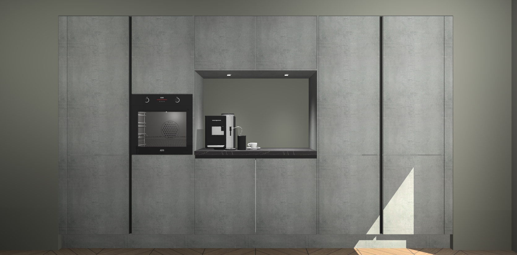 De Beton Parelgrijs greeploze keuken Lodz wordt geleverd met een set van 5 ingebouwde apparaten: Een oven, inductiekookplaat, afzuigkap, vaatwasser en koelkast. Deze kunnen gemakkelijk worden opgewaardeerd naar AEG. Met de gegarandeerde lage prijs en de snelle levering van 7 weken kan u er op rekenen dat de Beton Parelgrijs greeploze keuken Lodz zo snel mogelijk uw huis bereikt!