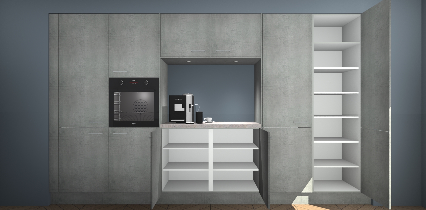 De Beton Parelgrijs keuken Lodz wordt geleverd met een set van 5 ingebouwde apparaten: Een oven, inductiekookplaat, afzuigkap, vaatwasser en koelkast. Deze kunnen gemakkelijk worden opgewaardeerd naar AEG. Met de gegarandeerde lage prijs en de snelle levering van 7 weken kan u er op rekenen dat de Beton Parelgrijs keuken Lodz zo snel mogelijk uw huis bereikt!