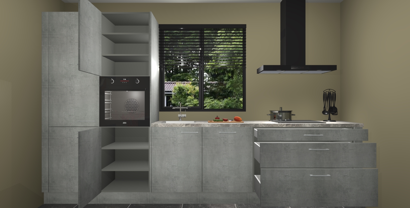 Maak kennis met de beton parelgrijze keuken Bonaire: de perfecte balans tussen tijdloos en modern. Met voldoende opbergruimte zal deze keuken de afgunst van uw vrienden en familie zijn, terwijl uw leven moeiteloos georganiseerd en rommelvrij blijft.