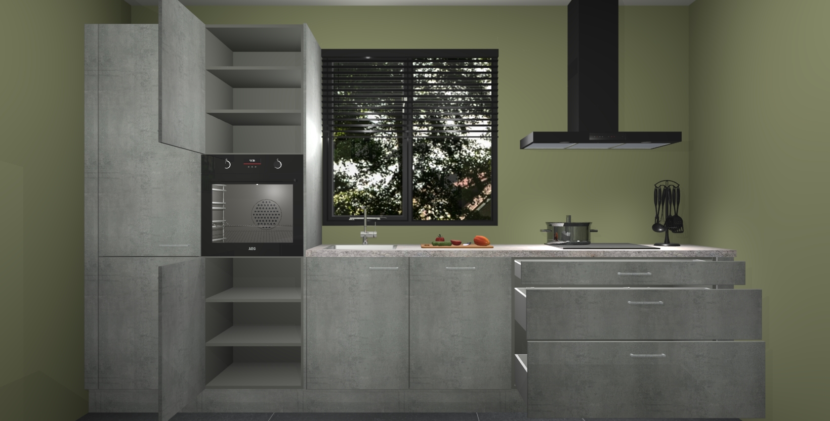 Maak kennis met de beton parelgrijze keuken Bonaire: de perfecte balans tussen tijdloos en modern. Met voldoende opbergruimte zal deze keuken de afgunst van uw vrienden en familie zijn, terwijl uw leven moeiteloos georganiseerd en rommelvrij blijft.