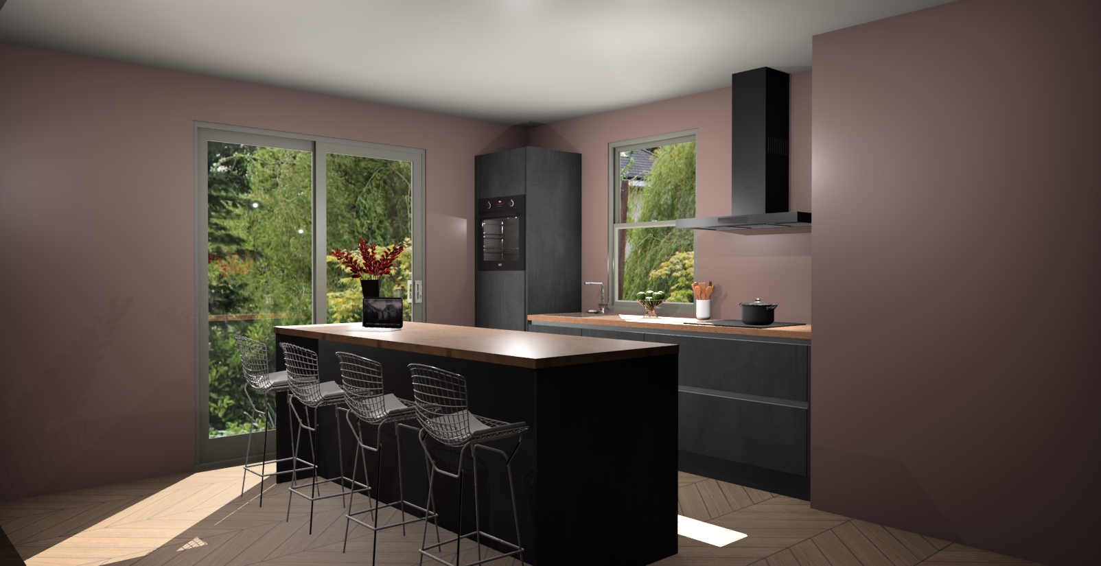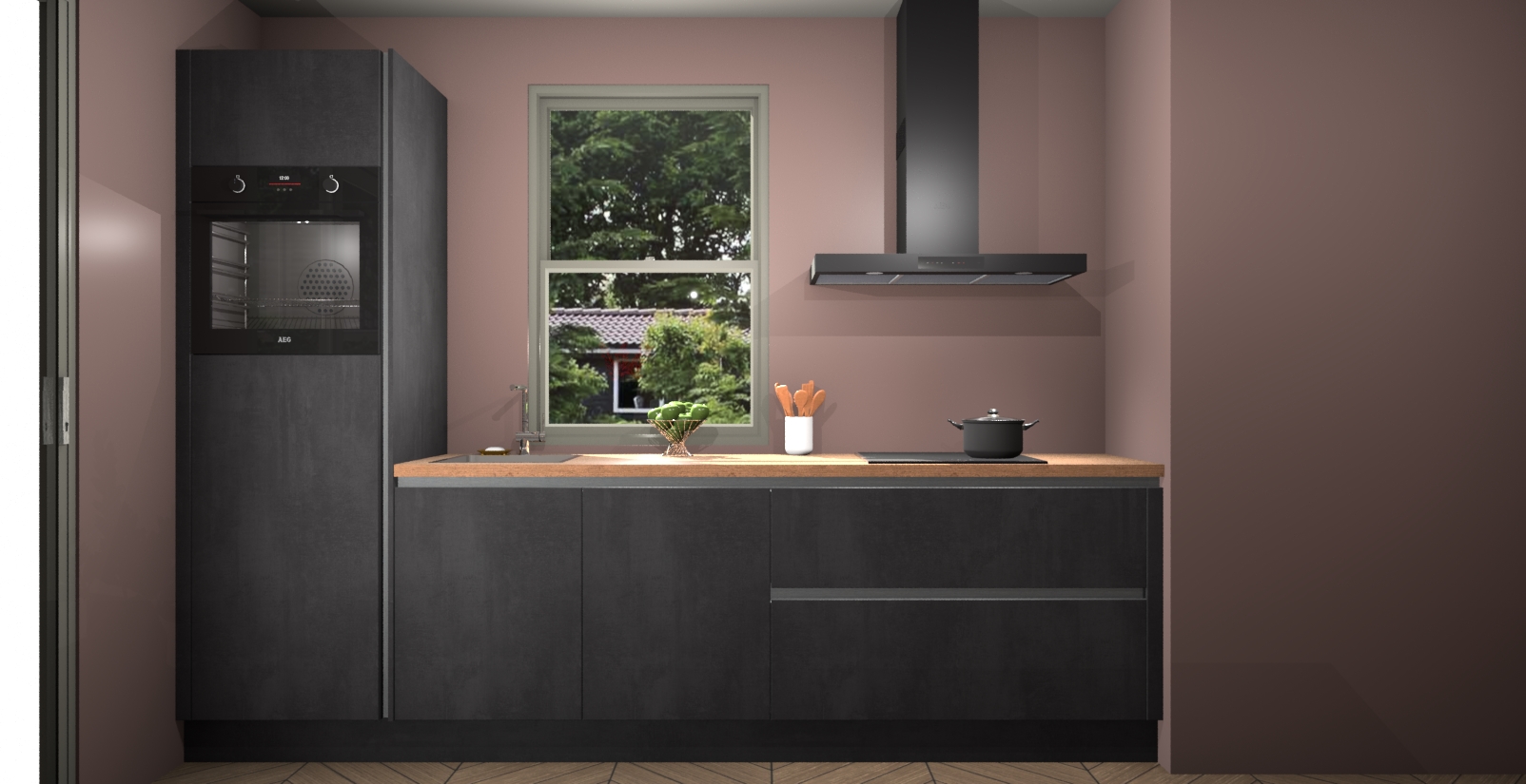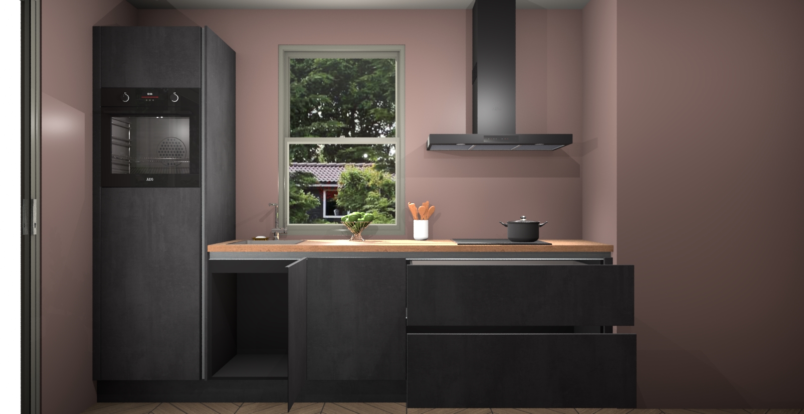 Een stijlvolle en praktische keuken als deze mag gezien worden. Dankzij de prachtige Beton Zwarte afwerking wordt de keuken gemakkelijk het middelpunt van uw huis - hij ziet er geweldig uit onder allerlei lichtomstandigheden, van dag tot nacht!