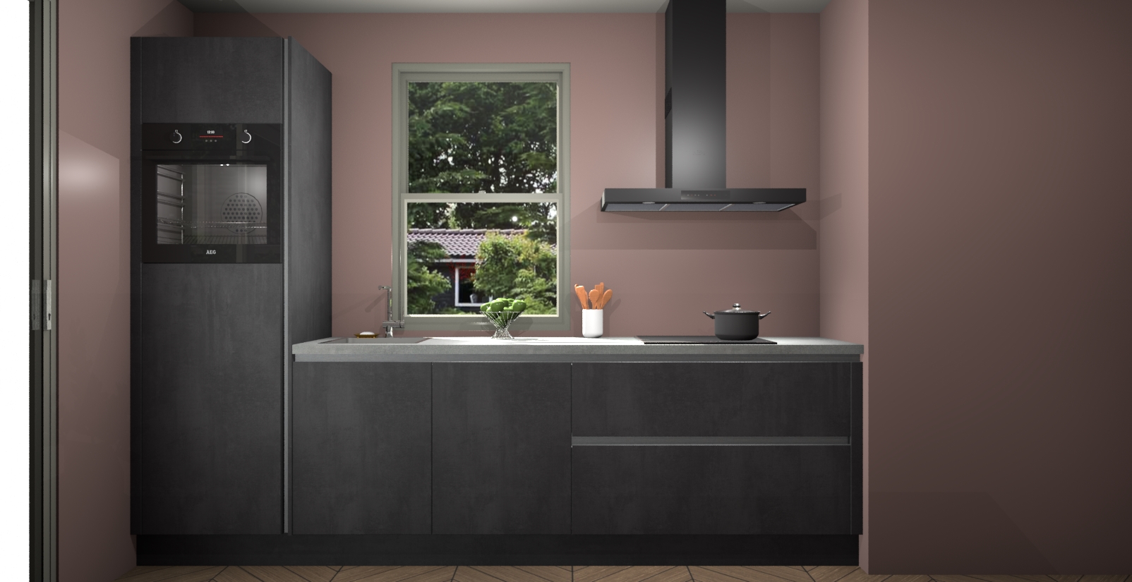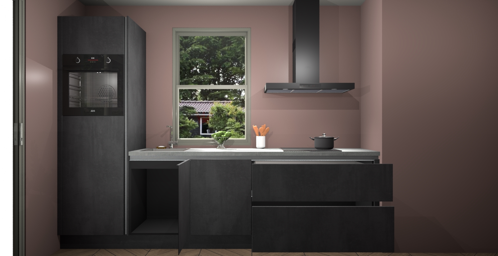 Een stijlvolle en praktische keuken als deze mag gezien worden. Dankzij de prachtige Beton Zwarte afwerking wordt de keuken gemakkelijk het middelpunt van uw huis - hij ziet er geweldig uit onder allerlei lichtomstandigheden, van dag tot nacht!