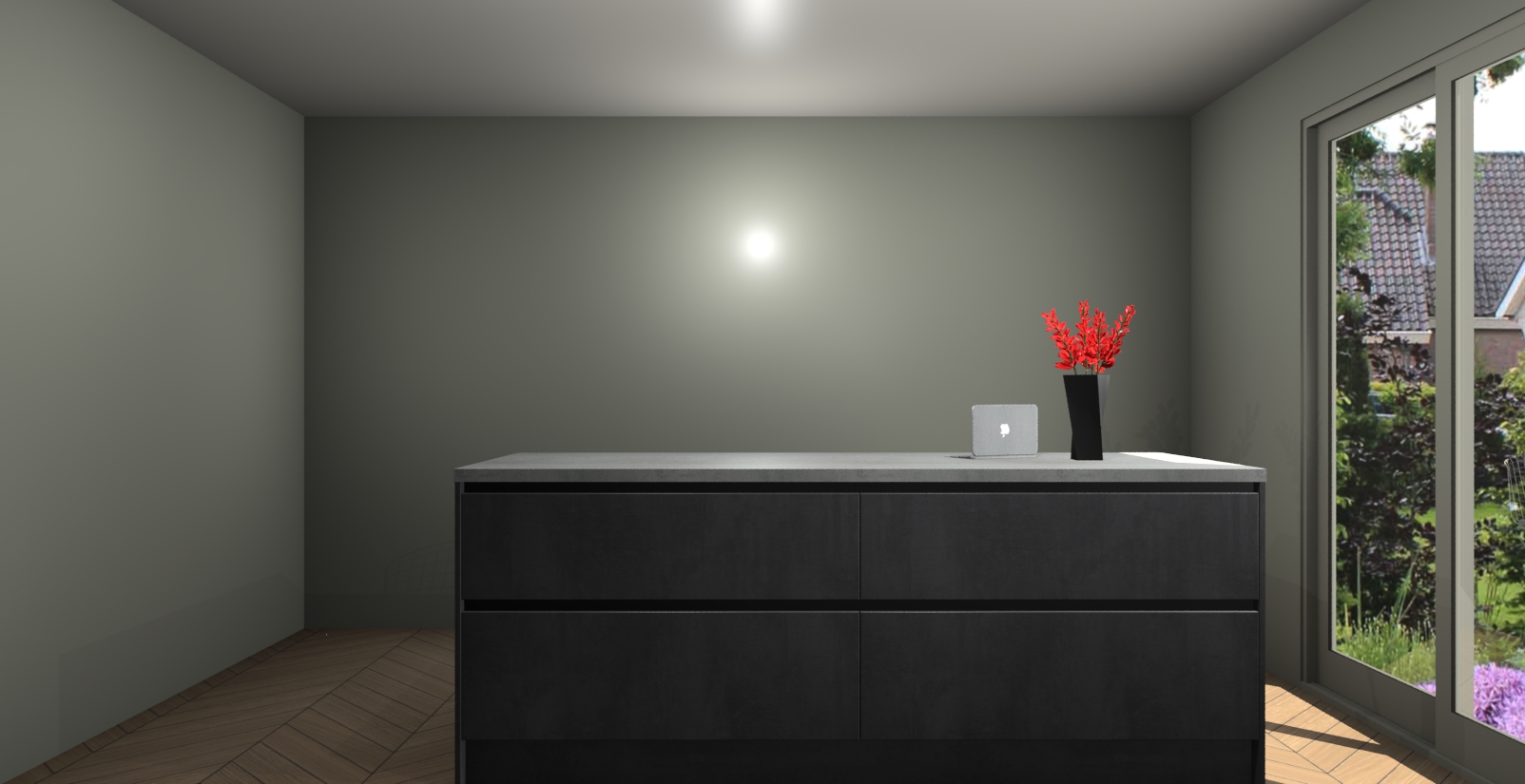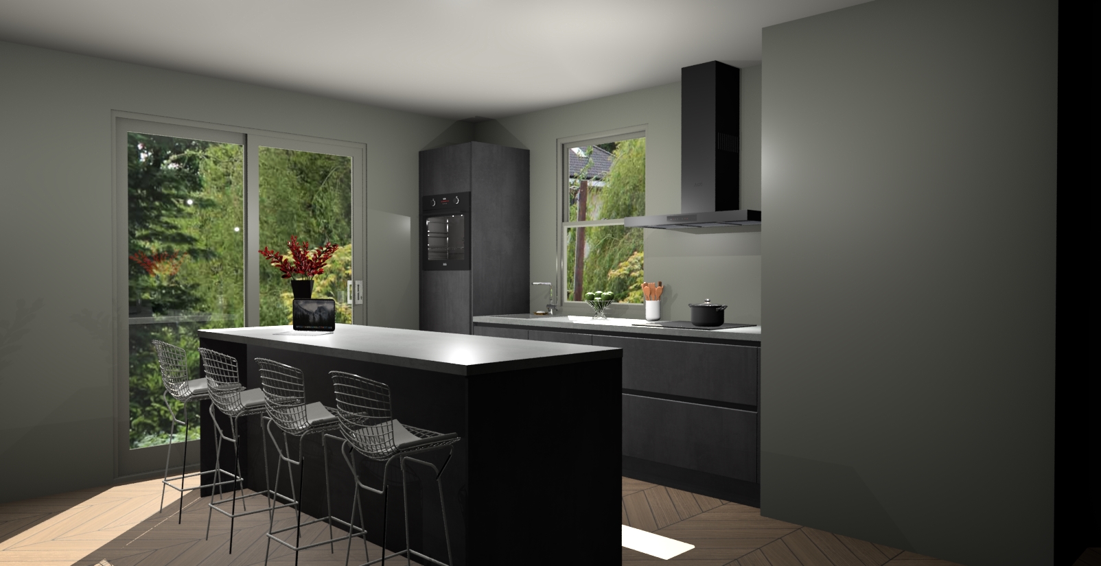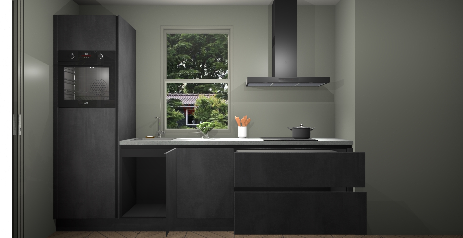 Een stijlvolle en praktische keuken als deze mag gezien worden. Dankzij de prachtige Beton Zwarte afwerking wordt de keuken gemakkelijk het middelpunt van uw huis - hij ziet er geweldig uit onder allerlei lichtomstandigheden, van dag tot nacht!