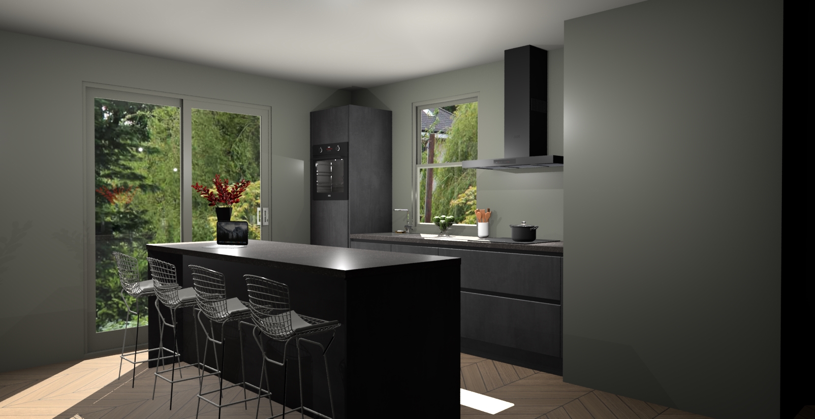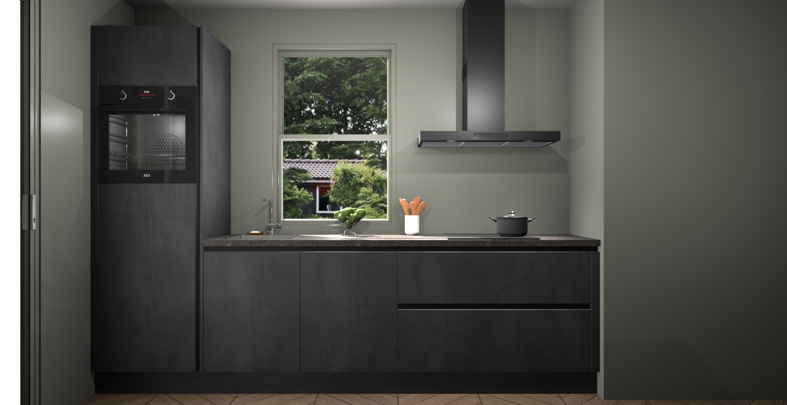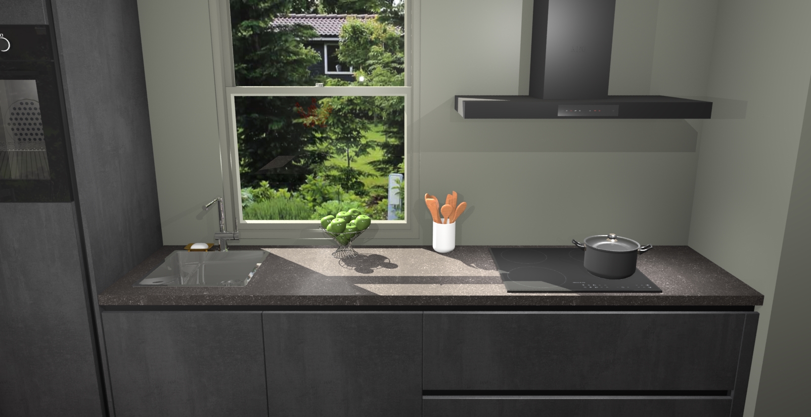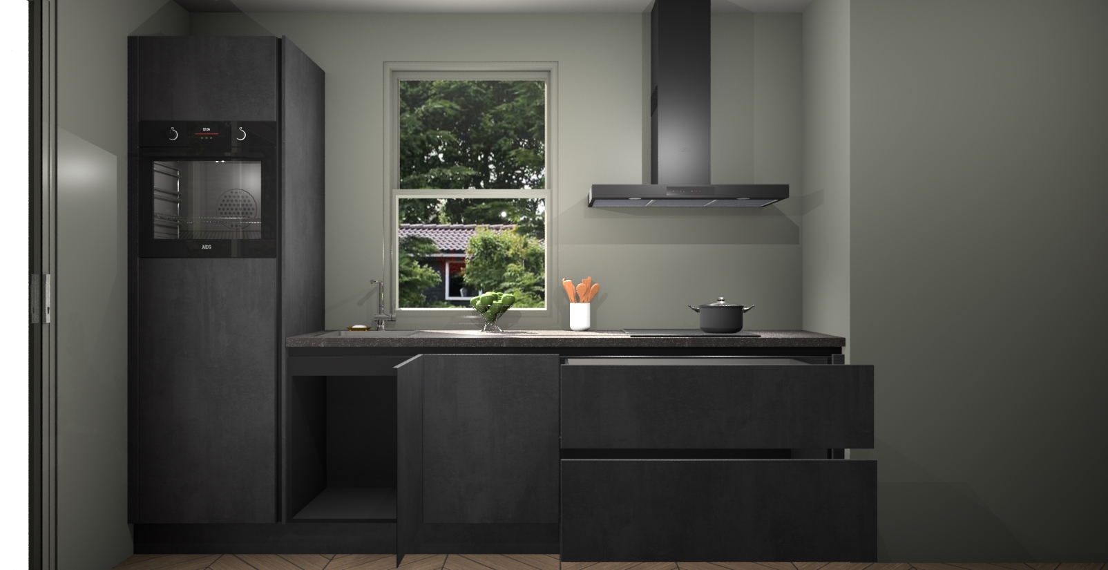 Een stijlvolle en praktische keuken als deze mag gezien worden. Dankzij de prachtige Beton Zwarte afwerking wordt de keuken gemakkelijk het middelpunt van uw huis - hij ziet er geweldig uit onder allerlei lichtomstandigheden, van dag tot nacht!