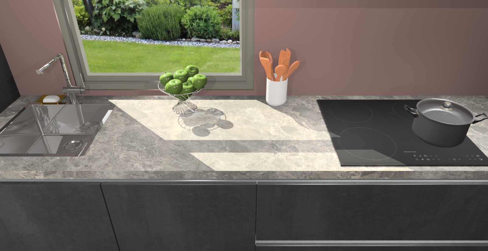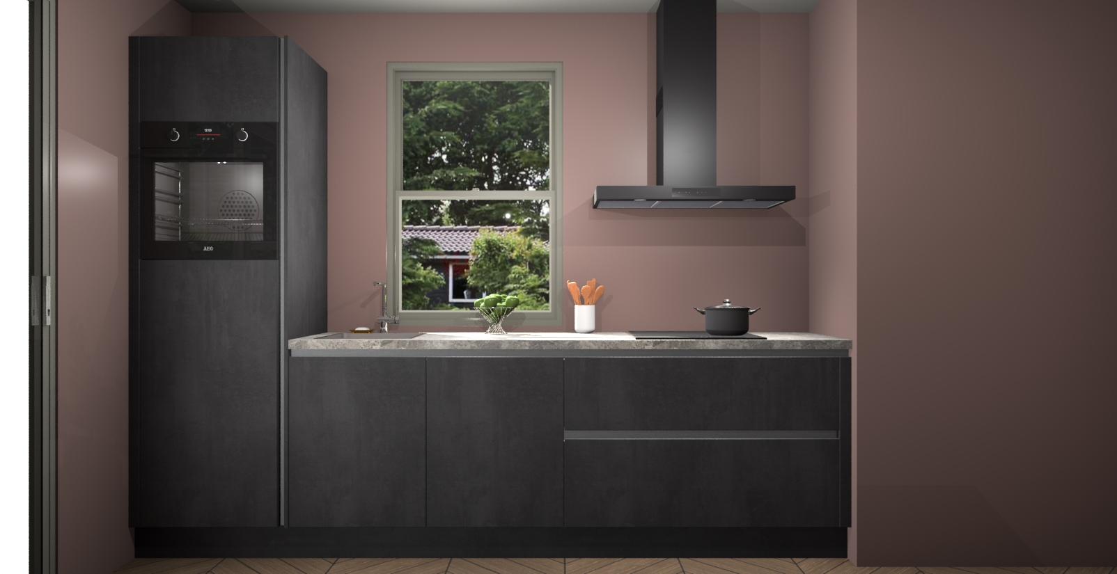 Een stijlvolle en praktische keuken als deze mag gezien worden. Dankzij de prachtige Beton Zwarte afwerking wordt de keuken gemakkelijk het middelpunt van uw huis - hij ziet er geweldig uit onder allerlei lichtomstandigheden, van dag tot nacht!