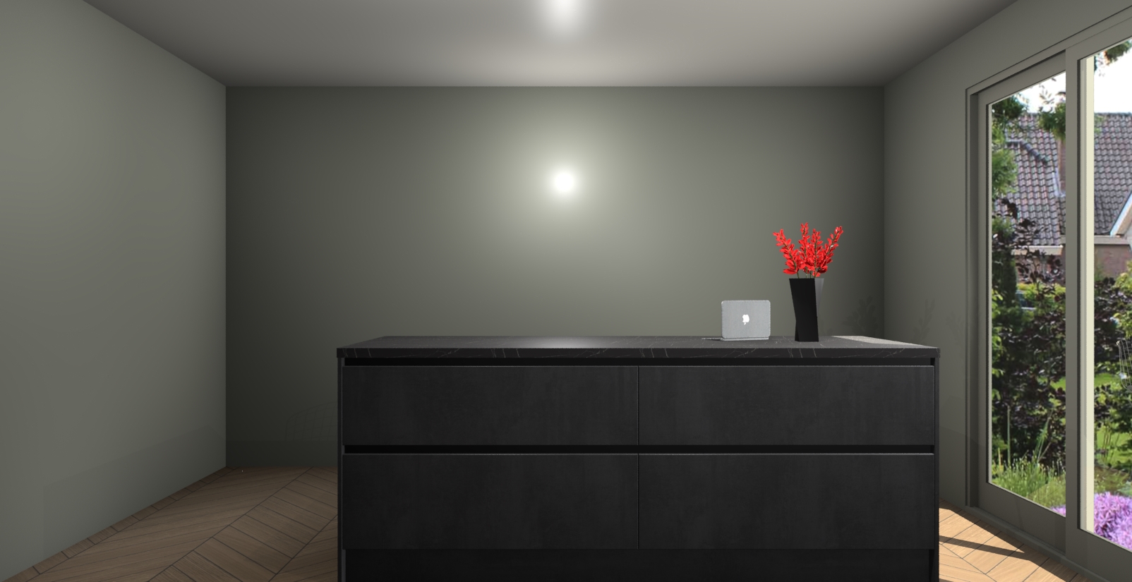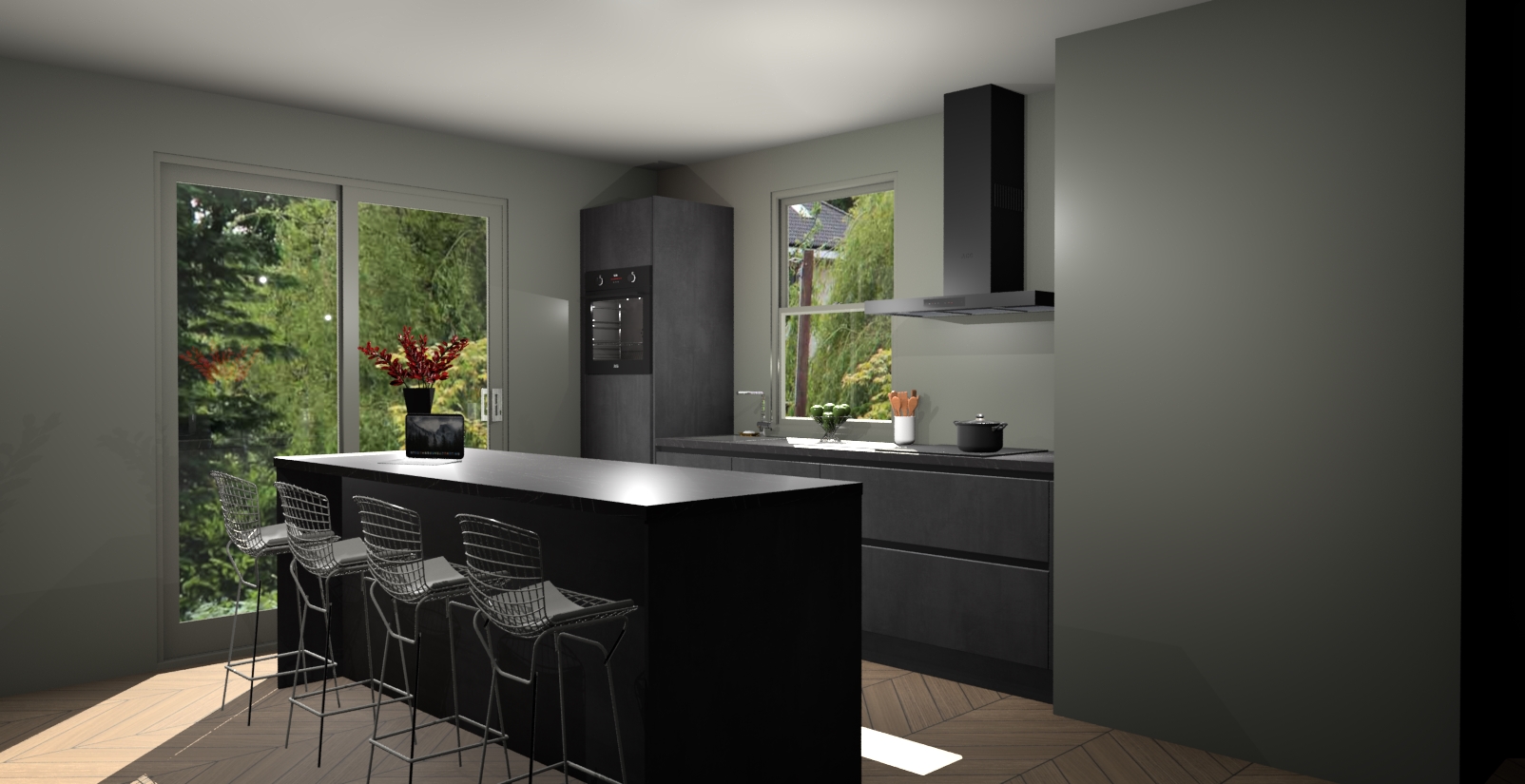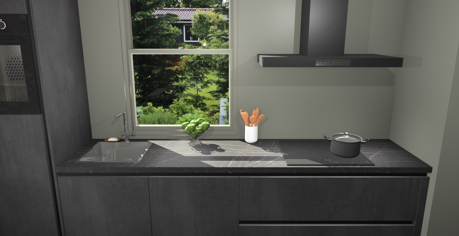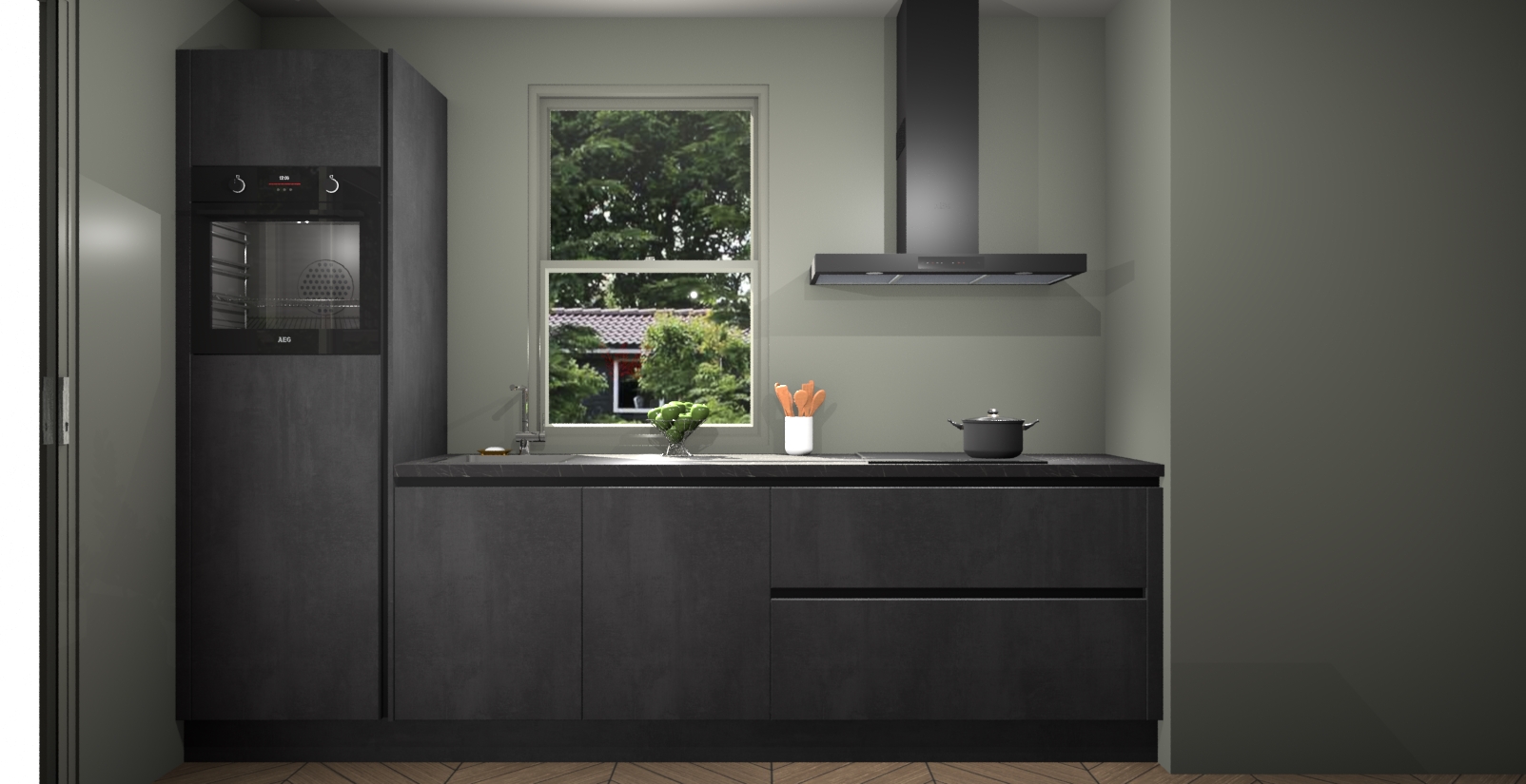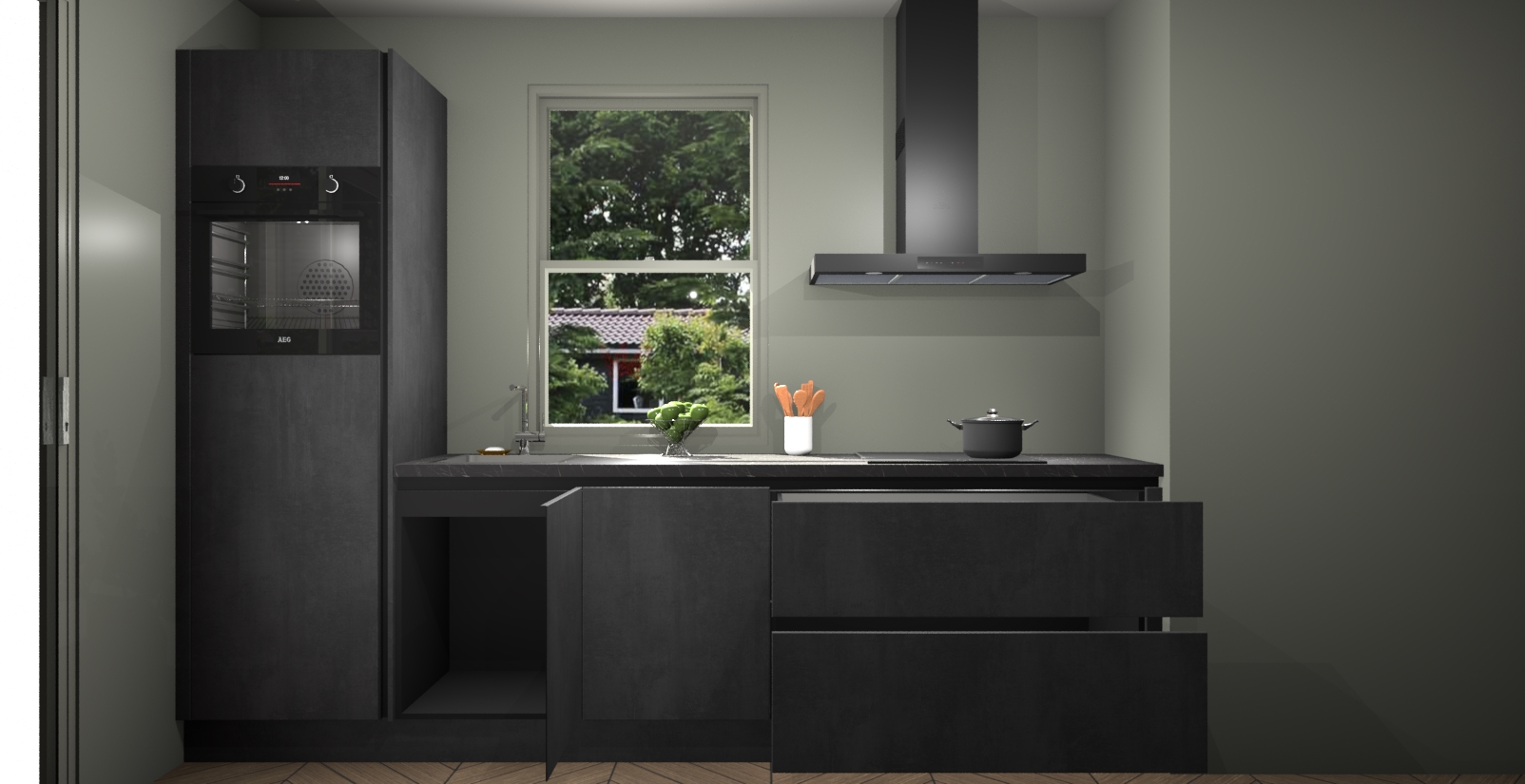 Een stijlvolle en praktische keuken als deze mag gezien worden. Dankzij de prachtige Beton Zwarte afwerking wordt de keuken gemakkelijk het middelpunt van uw huis - hij ziet er geweldig uit onder allerlei lichtomstandigheden, van dag tot nacht!