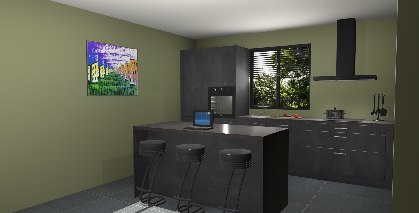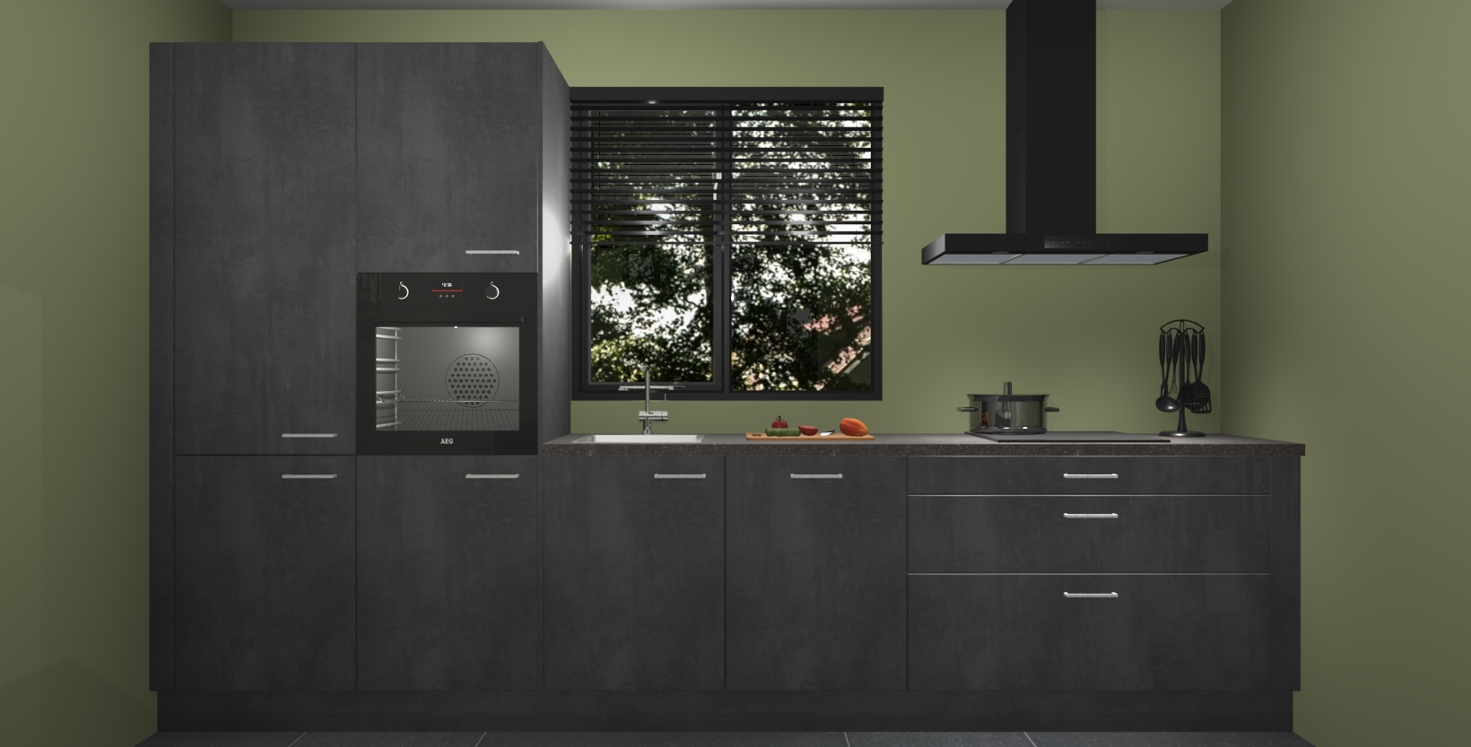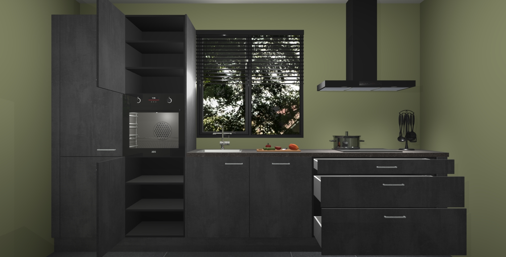Maak kennis met de beton zwarte keuken Bonaire: de perfecte balans tussen tijdloos en modern. Met voldoende opbergruimte zal deze keuken de afgunst van uw vrienden en familie zijn, terwijl uw leven moeiteloos georganiseerd en rommelvrij blijft.