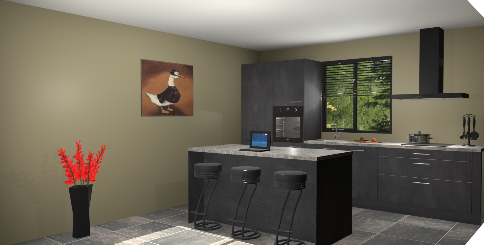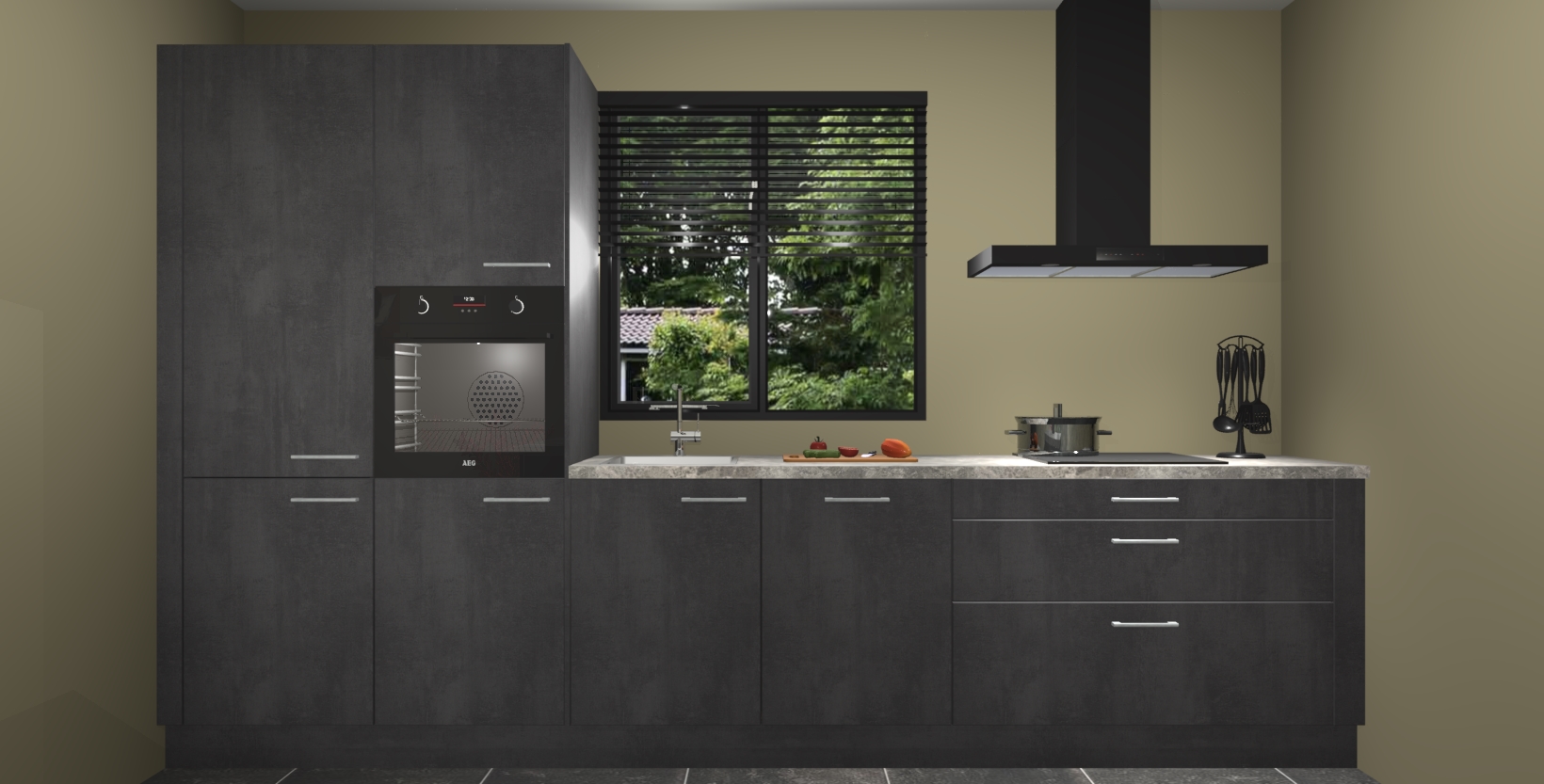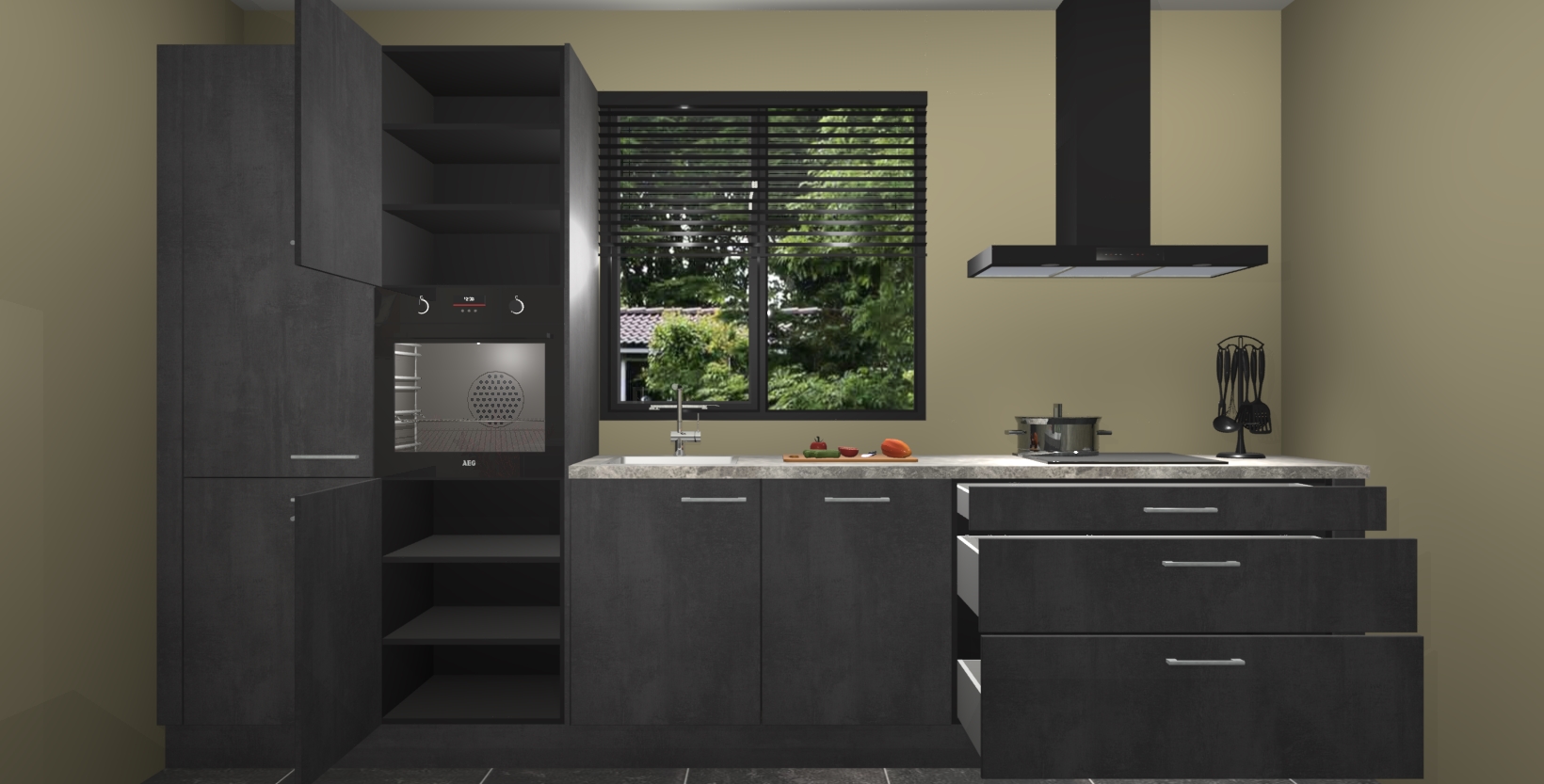 Maak kennis met de beton zwarte keuken Bonaire: de perfecte balans tussen tijdloos en modern. Met voldoende opbergruimte zal deze keuken de afgunst van uw vrienden en familie zijn, terwijl uw leven moeiteloos georganiseerd en rommelvrij blijft.
