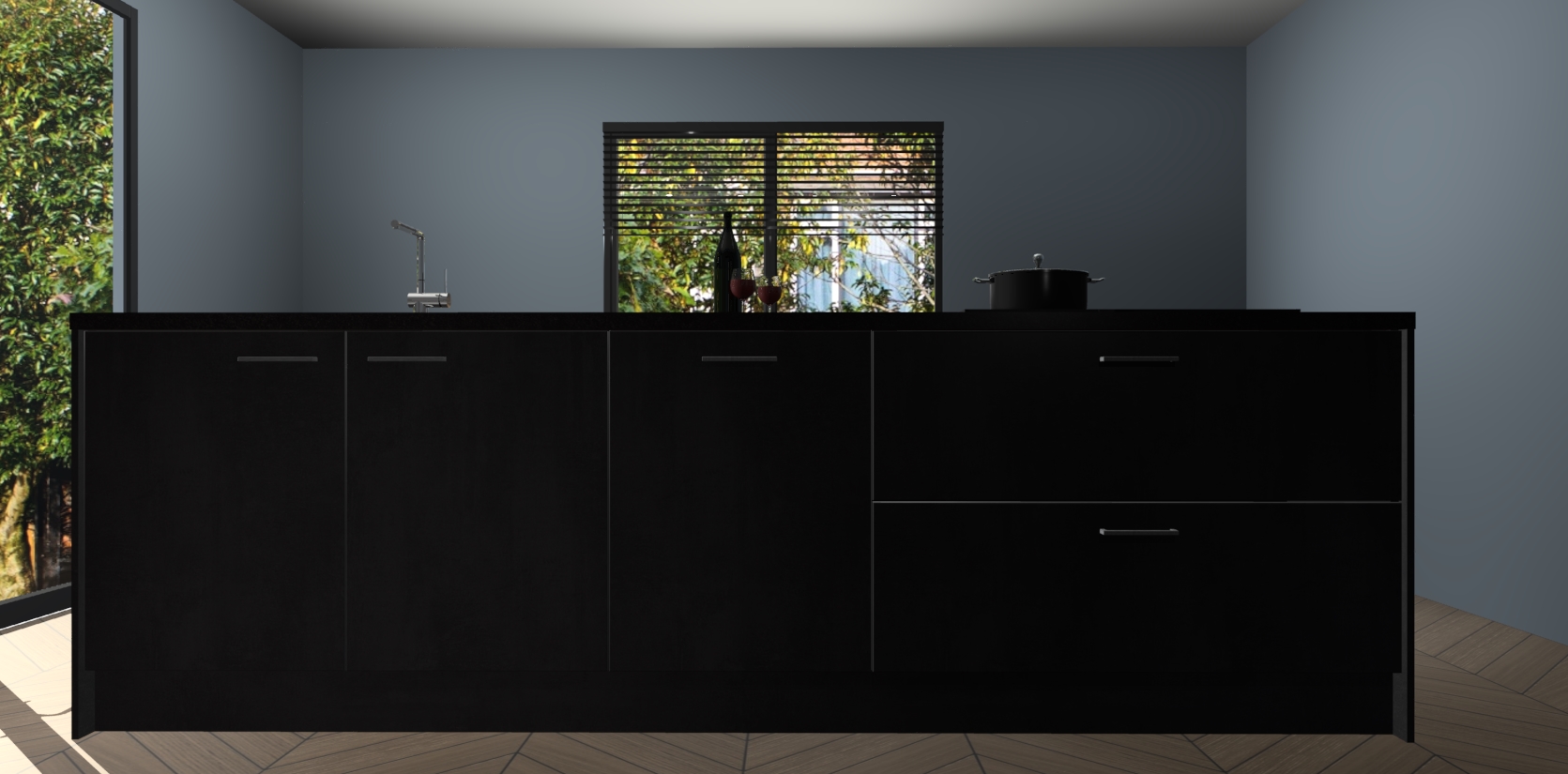 Sfeervol luxe met de Beton Zwarte keuken Lodz! Reken op een moderne look die met zijn schitterende Beton Zwarte kleur en het prachtige keukeneiland echt zal schitteren in uw keuken. Met veel verschillende berging opties zult u alles kunnen opbergen wat u nodig heeft in deze hoopvolle ruimte, waaronder ook soft-close vergrendeling.
