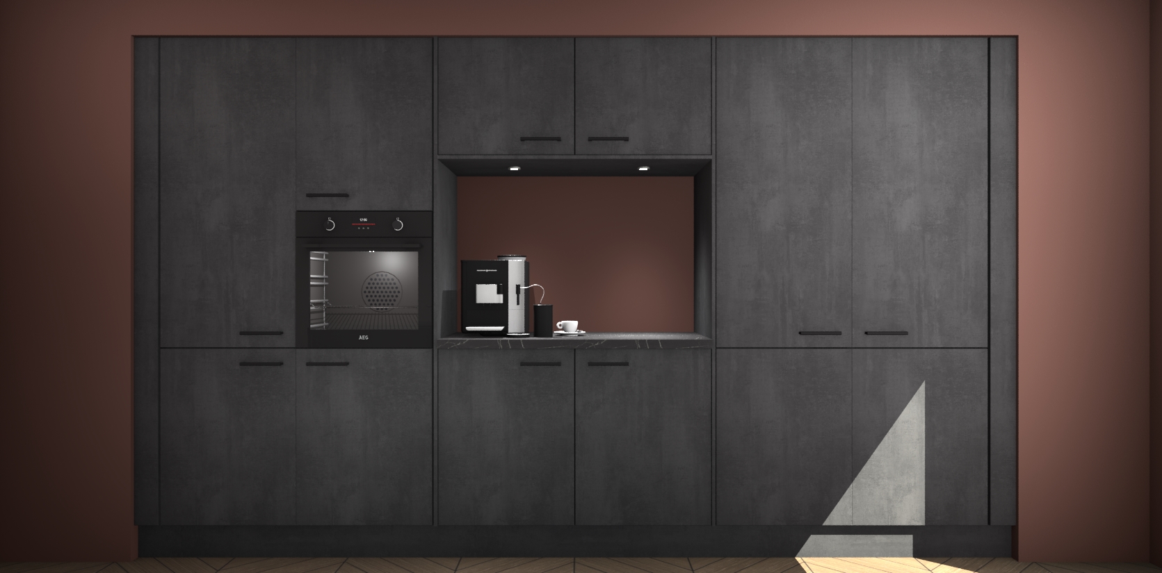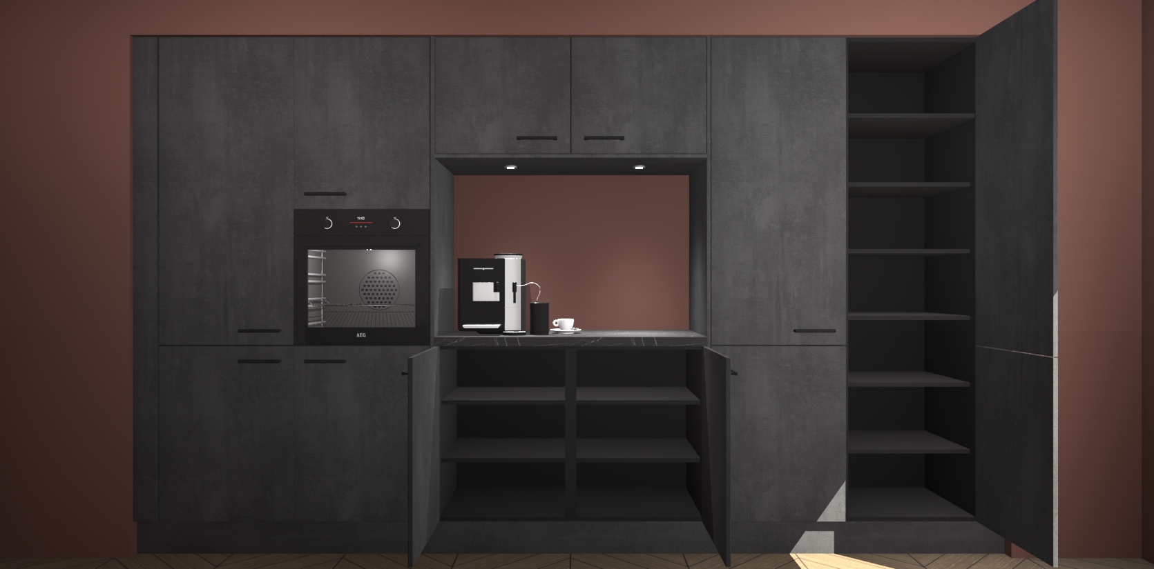 De Beton Zwarte keuken Lodz wordt geleverd met een set van 5 ingebouwde apparaten: Een oven, inductiekookplaat, afzuigkap, vaatwasser en koelkast. Deze kunnen gemakkelijk worden opgewaardeerd naar AEG. Met de gegarandeerde lage prijs en de snelle levering van 7 weken kan u er op rekenen dat de Beton Zwarte keuken Lodz zo snel mogelijk uw huis bereikt!