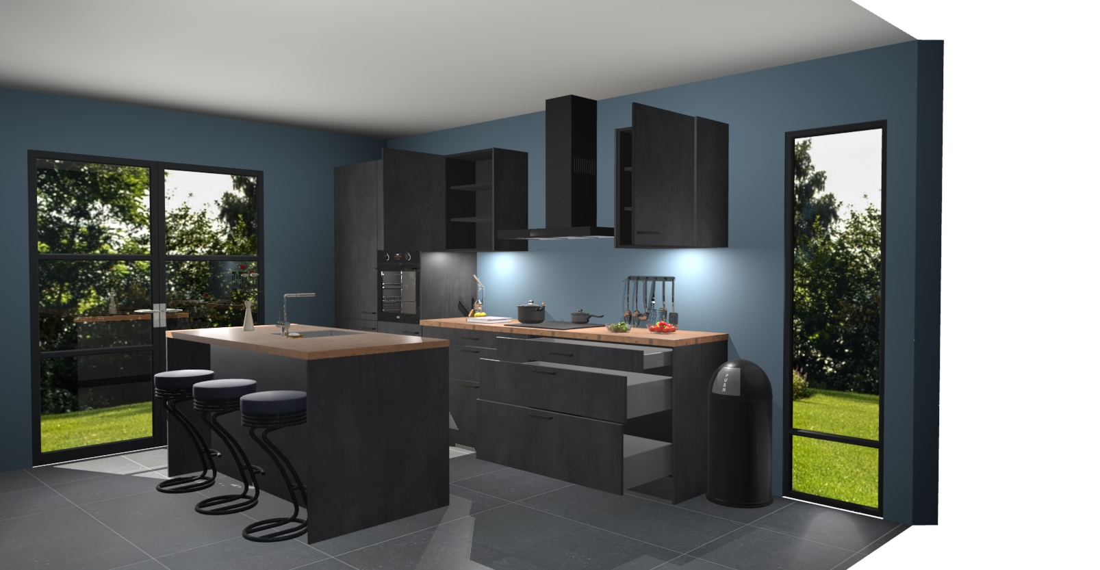 Klaar om een statement te maken in uw keuken? De Beton zwarte keuken Spanje is precies wat u nodig heeft. Dit moderne keuken ontwerp is de perfecte balans tussen esthetiek en functionaliteit in uw huis. Met een sfeervolle afwerking en voldoende opbergruimte kan u er zeker van zijn dat u heerlijke maaltijden bereidt en ze in uw keuken kan bewaren voor de dagen dat u het te druk hebt. Bovendien voegt het mooie spoeleiland een element van klasse en gemak toe aan uw keuken.