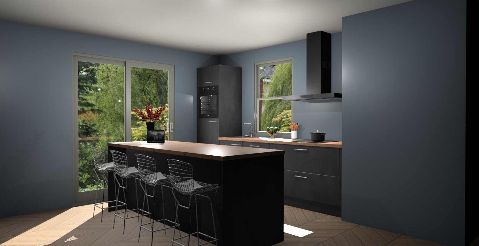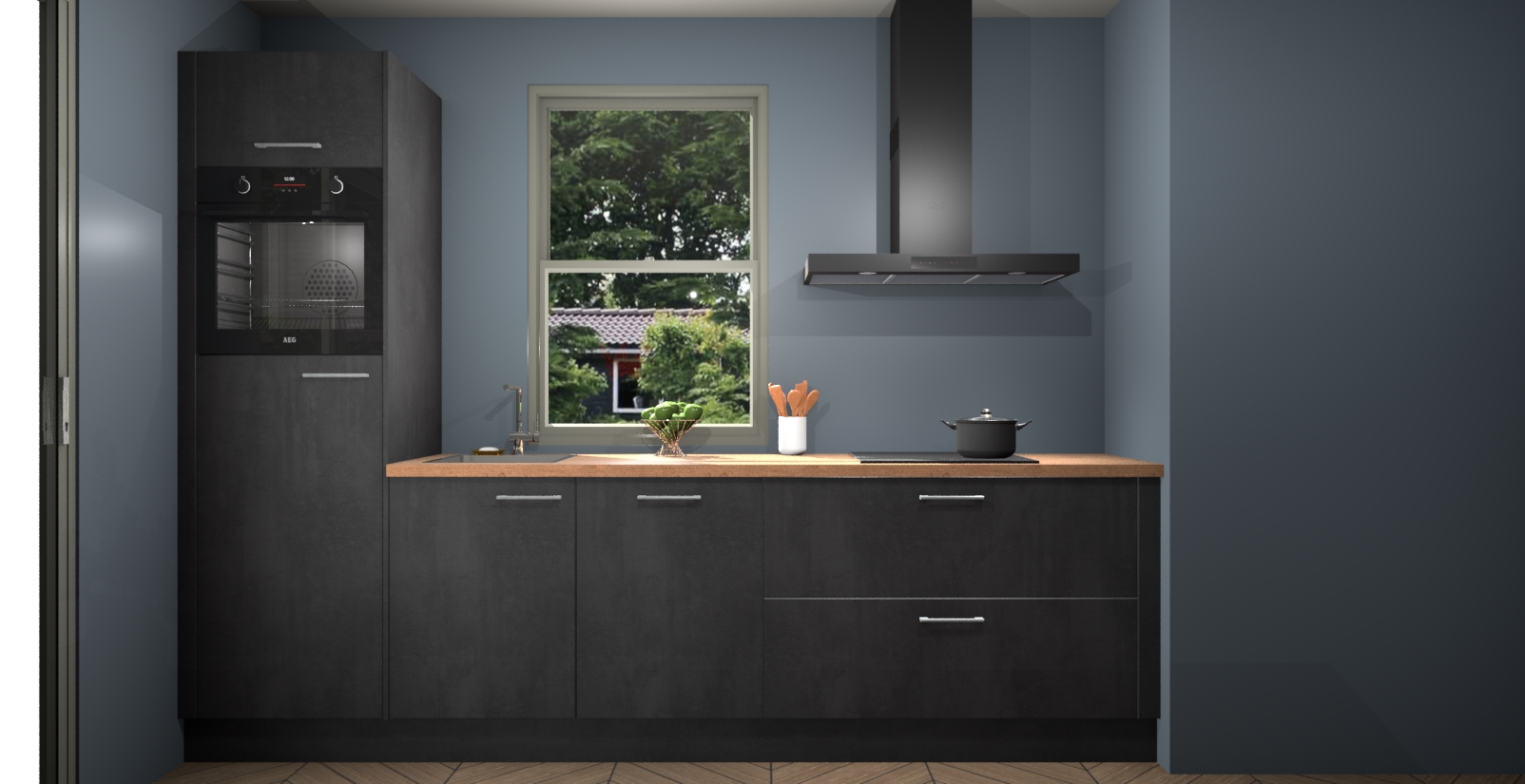 Een stijlvolle en praktische keuken als deze mag gezien worden. Dankzij de prachtige Beton Zwarte afwerking wordt de keuken gemakkelijk het middelpunt van uw huis - hij ziet er geweldig uit onder allerlei lichtomstandigheden, van dag tot nacht!