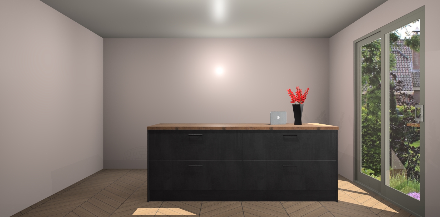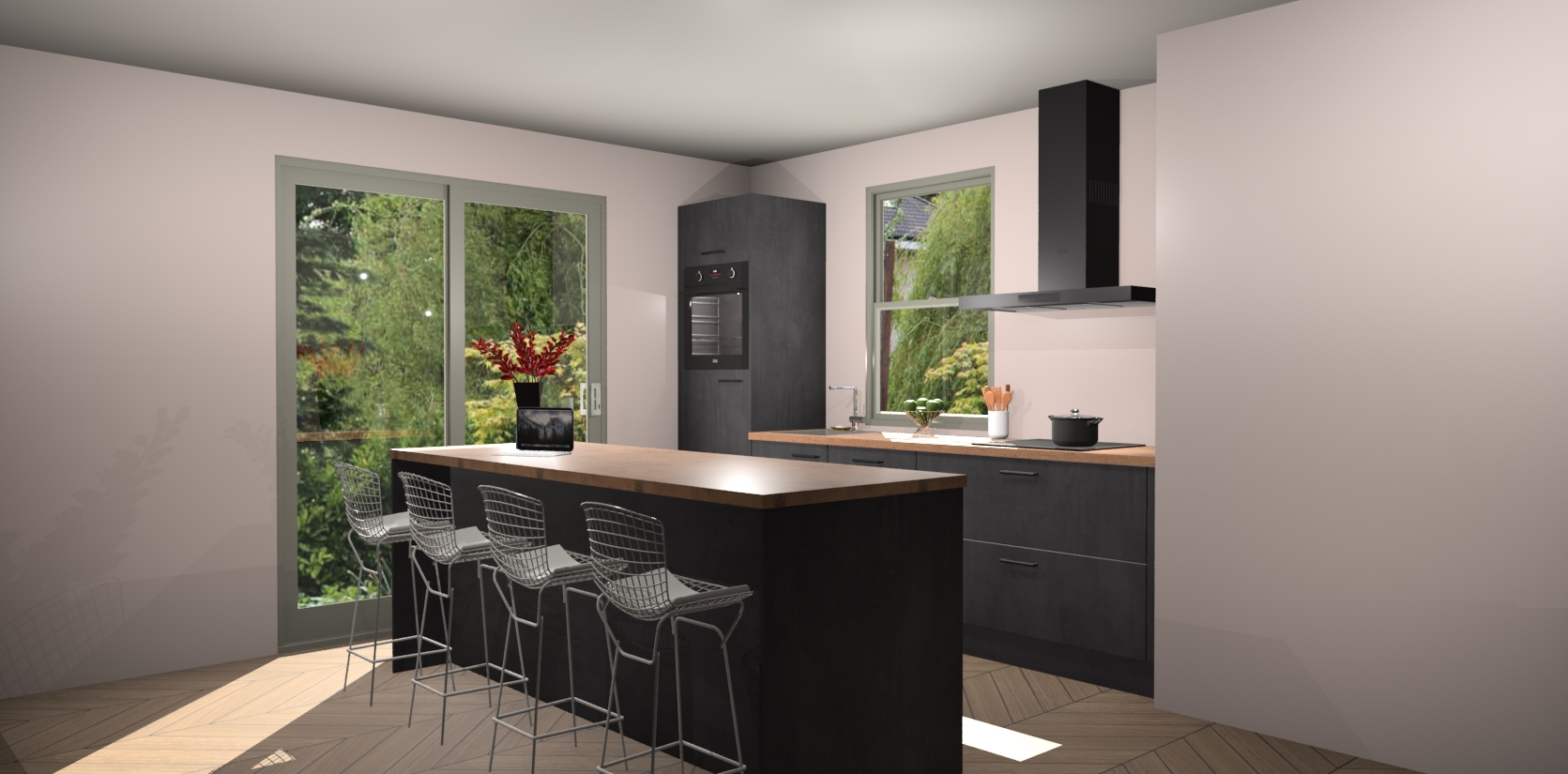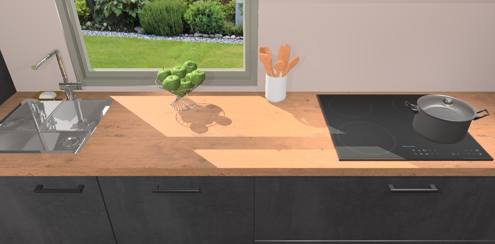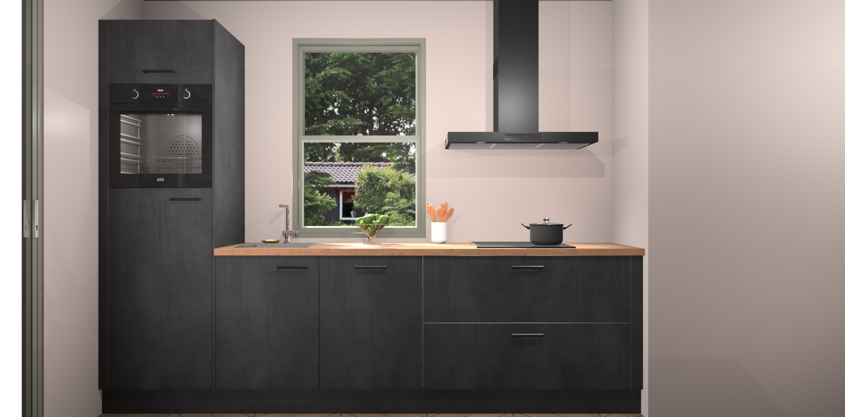 Een stijlvolle en praktische keuken als deze mag gezien worden. Dankzij de prachtige Beton Zwarte afwerking wordt de keuken gemakkelijk het middelpunt van uw huis - hij ziet er geweldig uit onder allerlei lichtomstandigheden, van dag tot nacht!