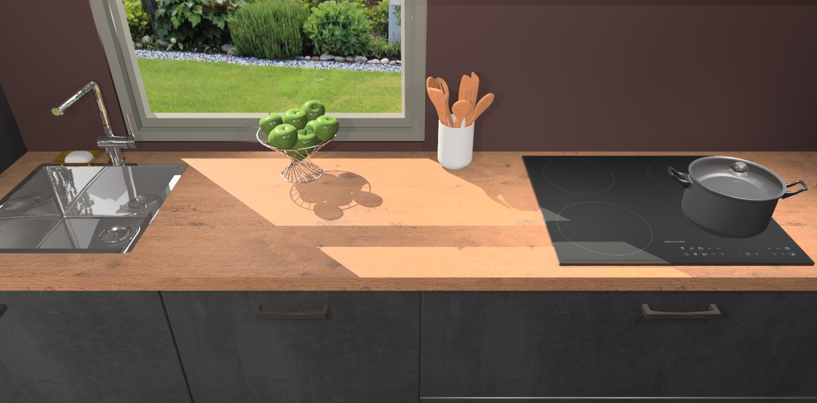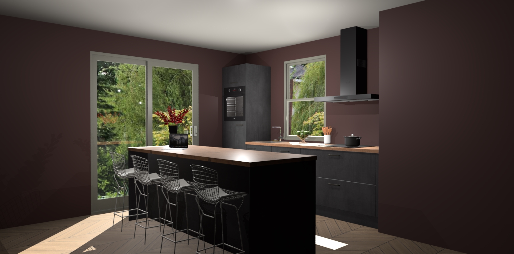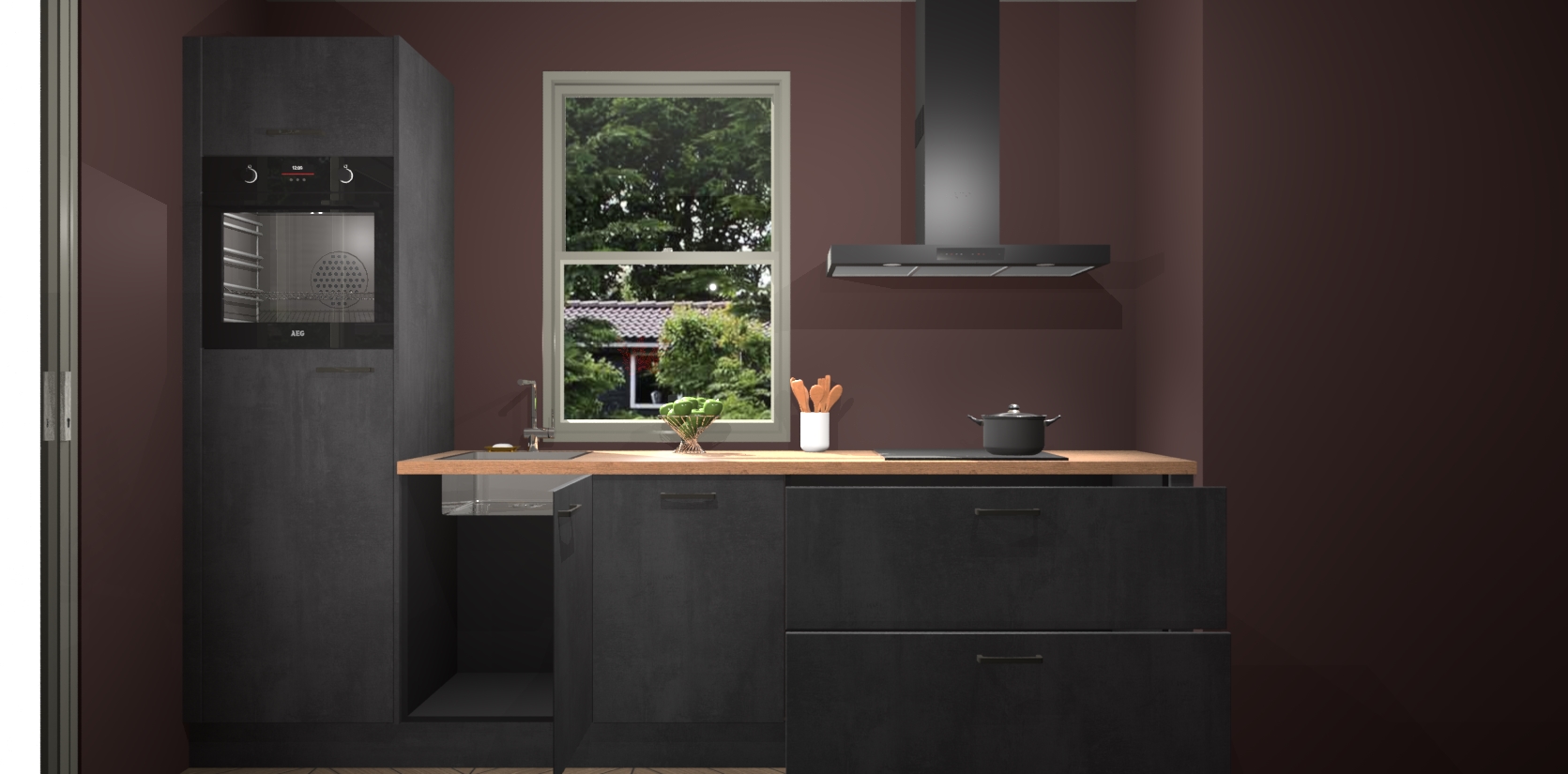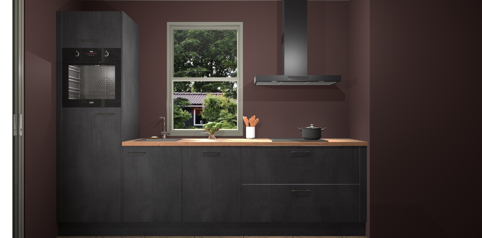 Een stijlvolle en praktische keuken als deze mag gezien worden. Dankzij de prachtige Beton Zwarte afwerking wordt de keuken gemakkelijk het middelpunt van uw huis - hij ziet er geweldig uit onder allerlei lichtomstandigheden, van dag tot nacht!