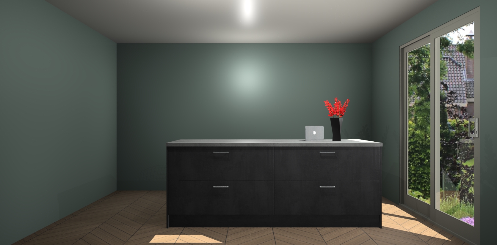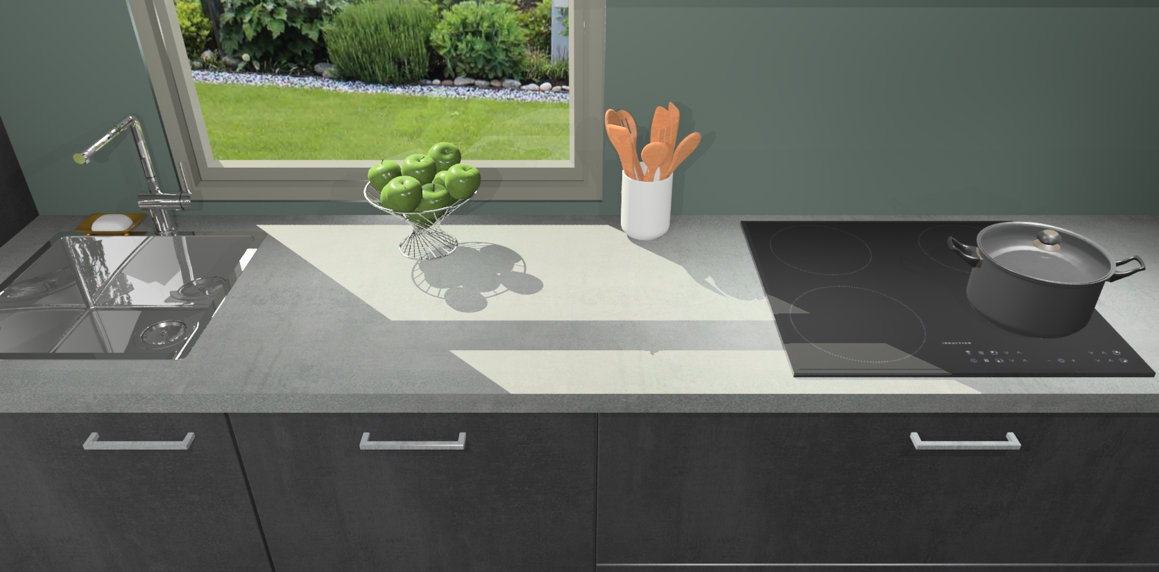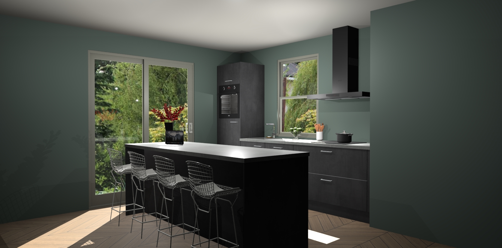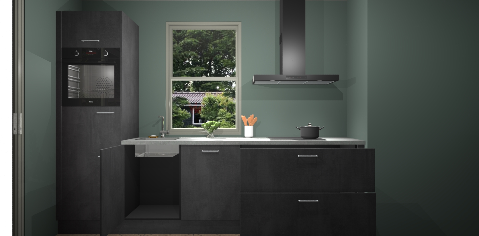 Een stijlvolle en praktische keuken als deze mag gezien worden. Dankzij de prachtige Beton Zwarte afwerking wordt de keuken gemakkelijk het middelpunt van uw huis - hij ziet er geweldig uit onder allerlei lichtomstandigheden, van dag tot nacht!