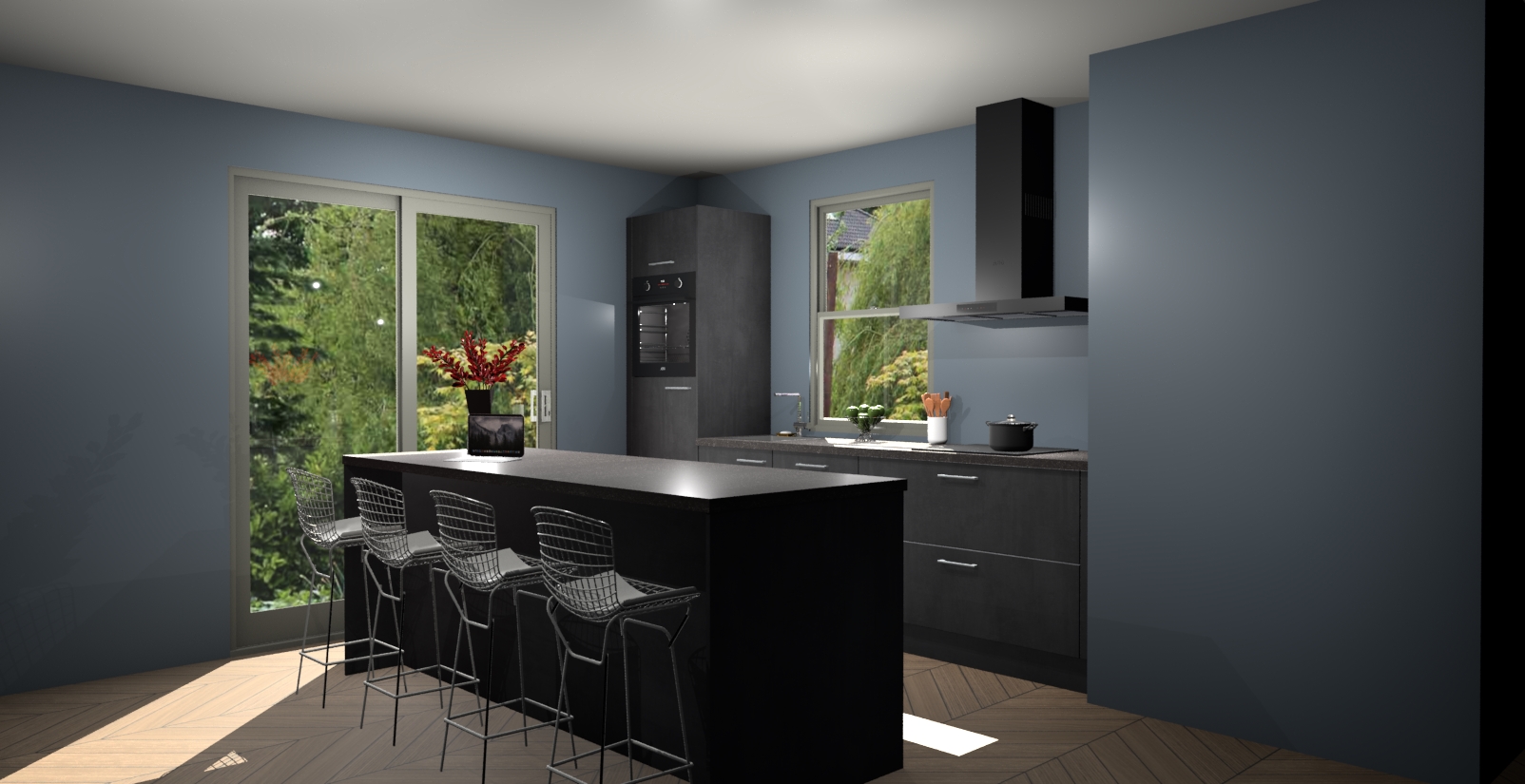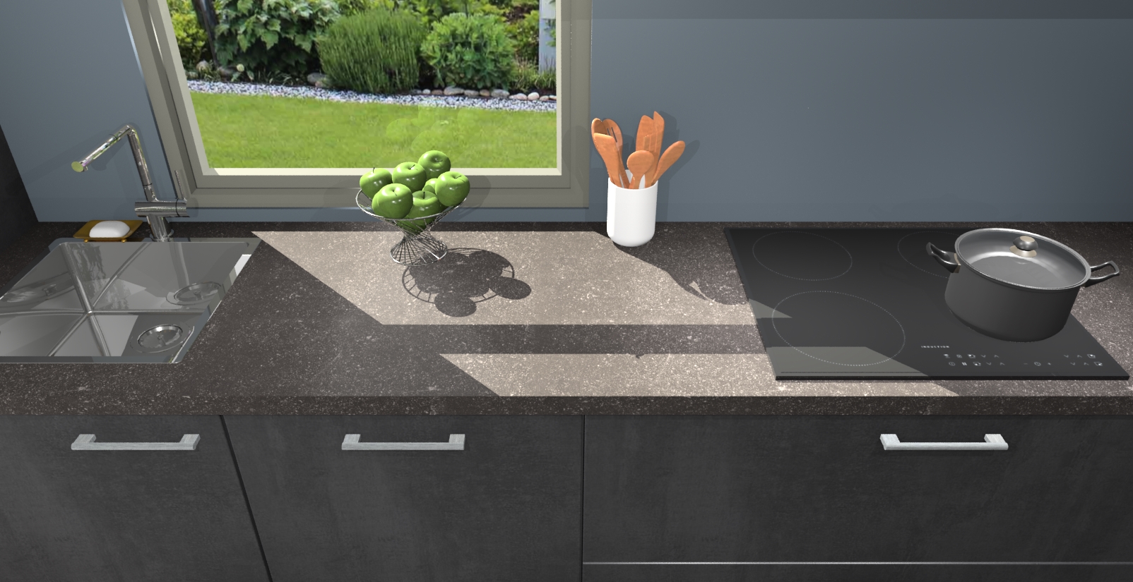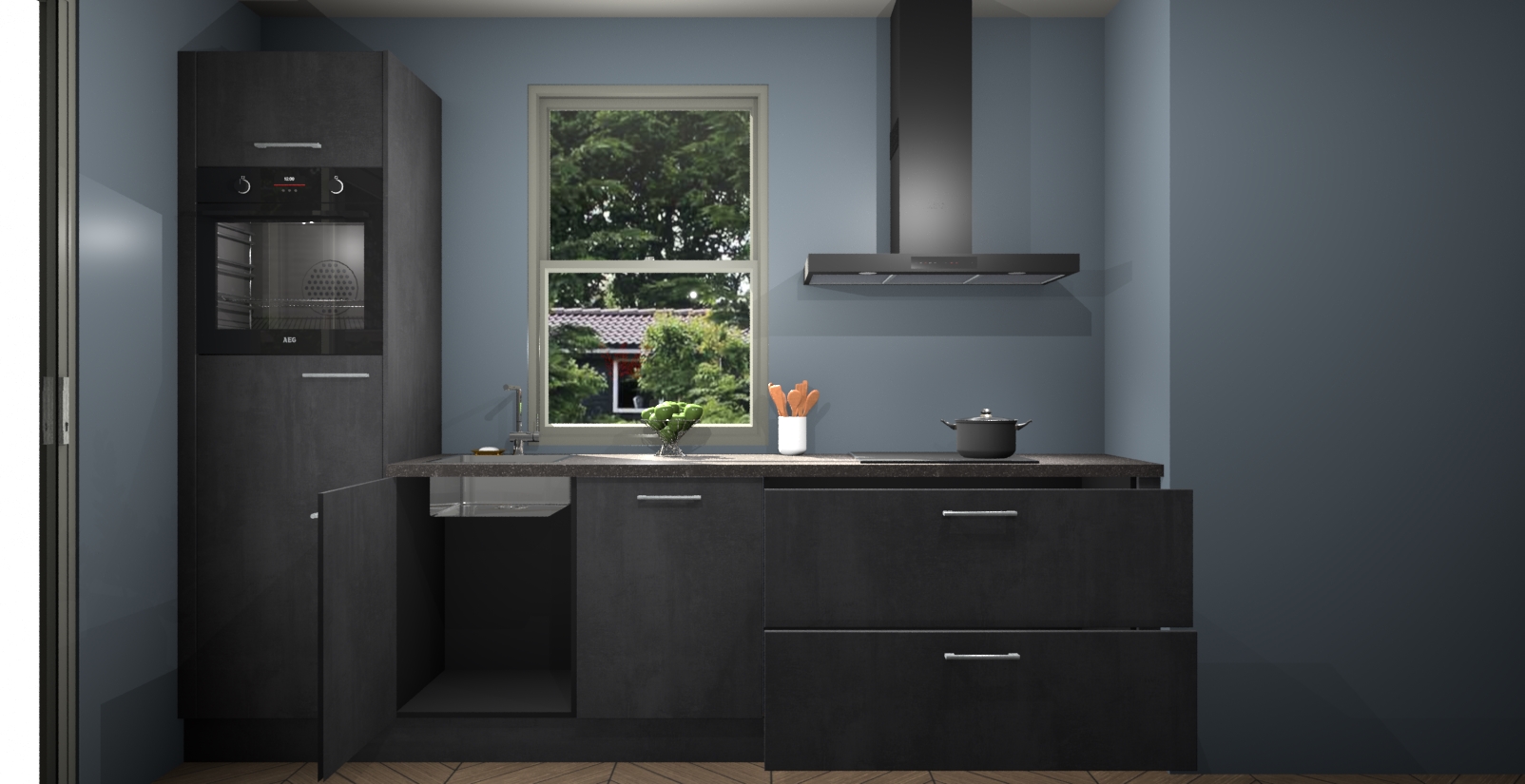 Een stijlvolle en praktische keuken als deze mag gezien worden. Dankzij de prachtige Beton Zwarte afwerking wordt de keuken gemakkelijk het middelpunt van uw huis - hij ziet er geweldig uit onder allerlei lichtomstandigheden, van dag tot nacht!