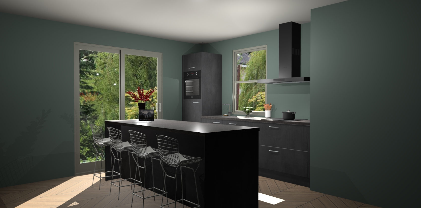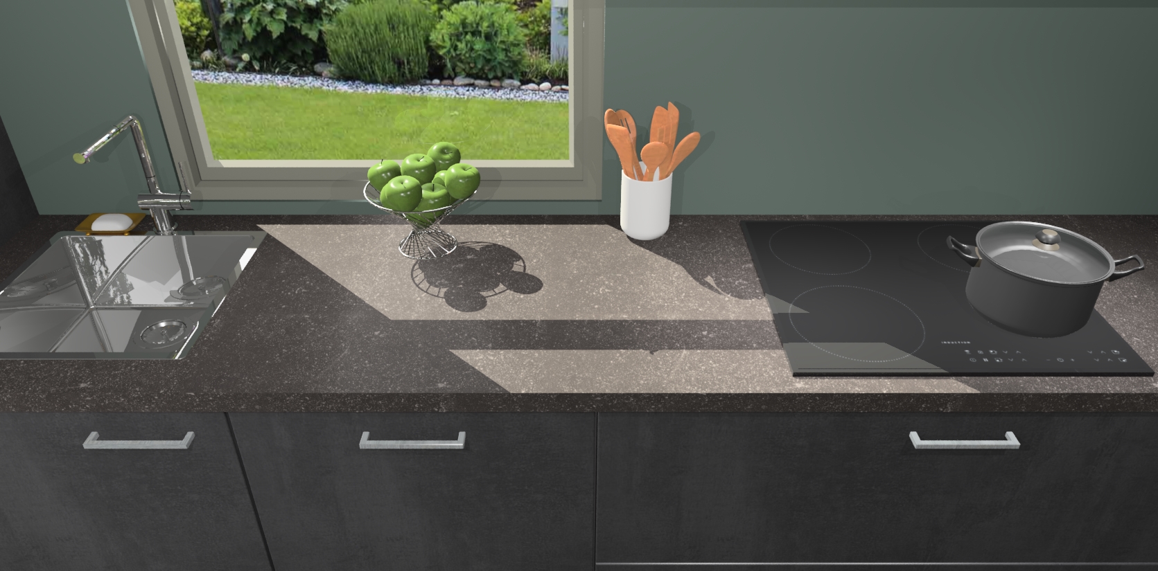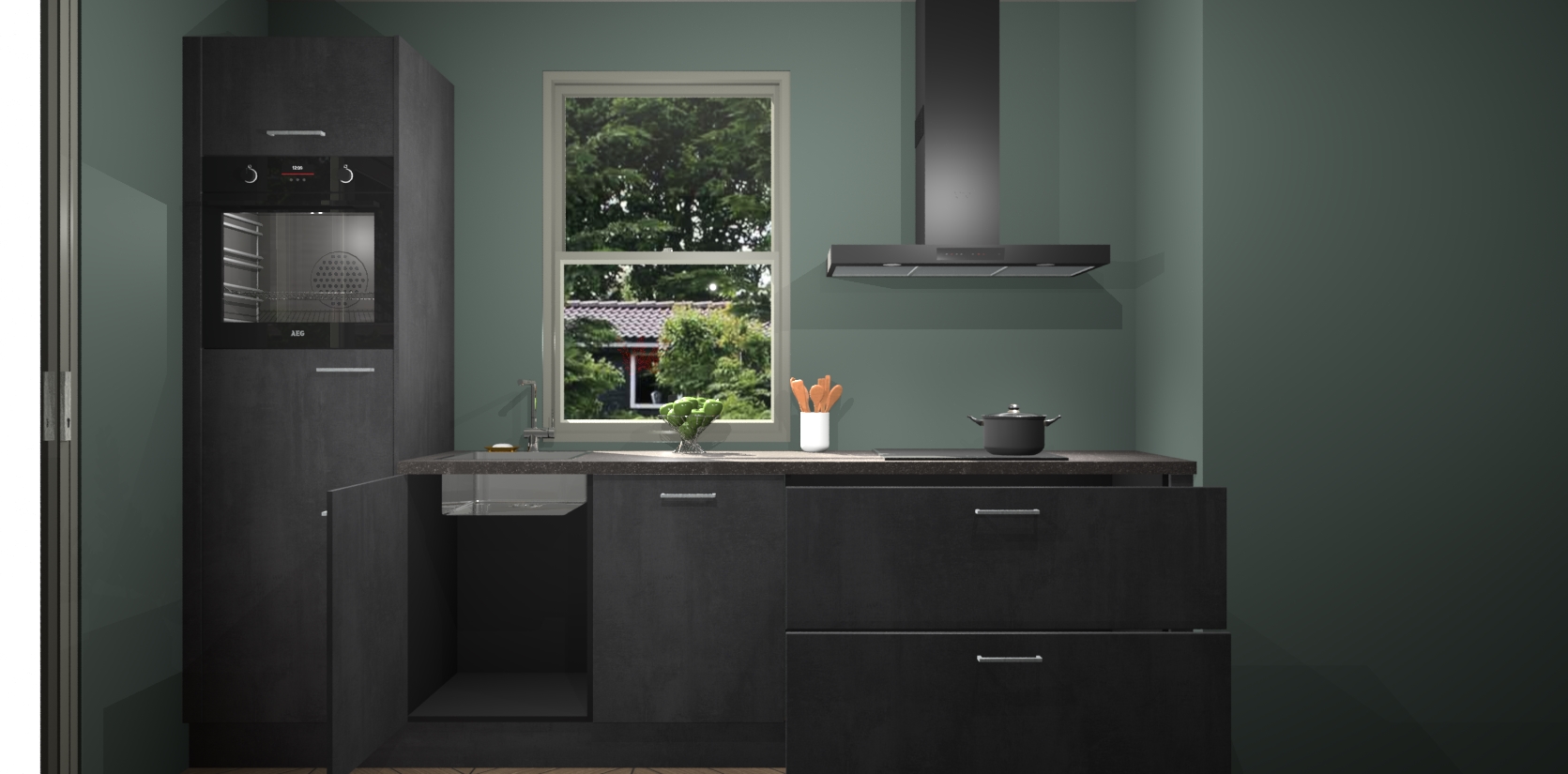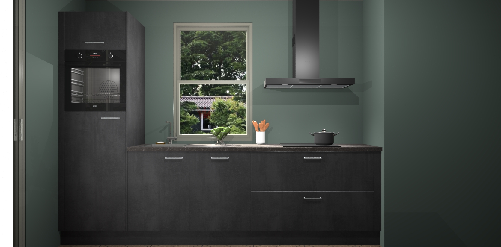 Een stijlvolle en praktische keuken als deze mag gezien worden. Dankzij de prachtige Beton Zwarte afwerking wordt de keuken gemakkelijk het middelpunt van uw huis - hij ziet er geweldig uit onder allerlei lichtomstandigheden, van dag tot nacht!