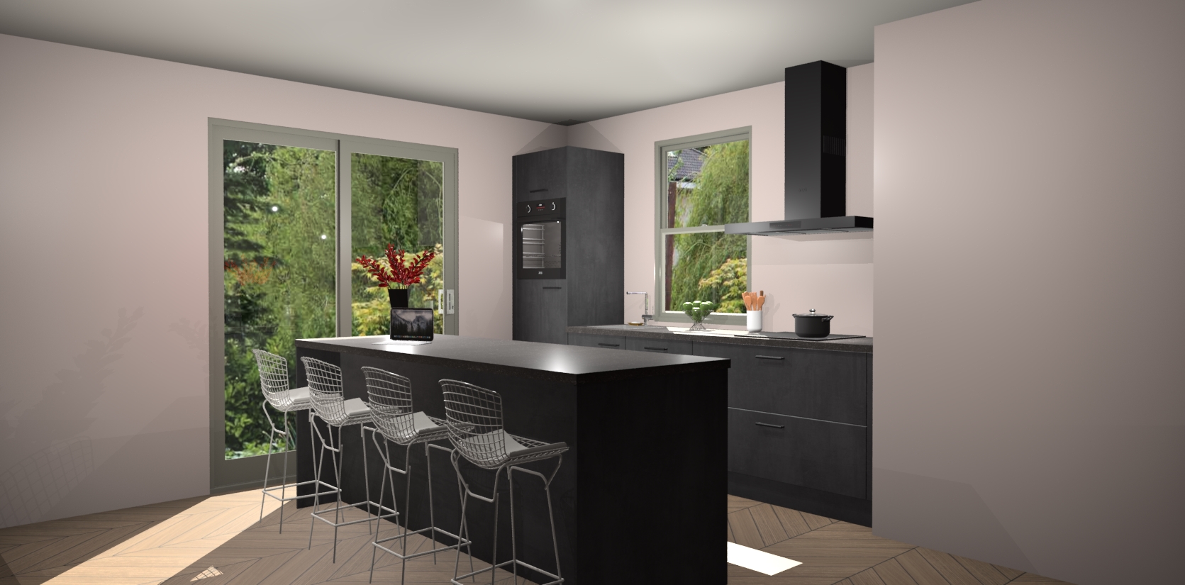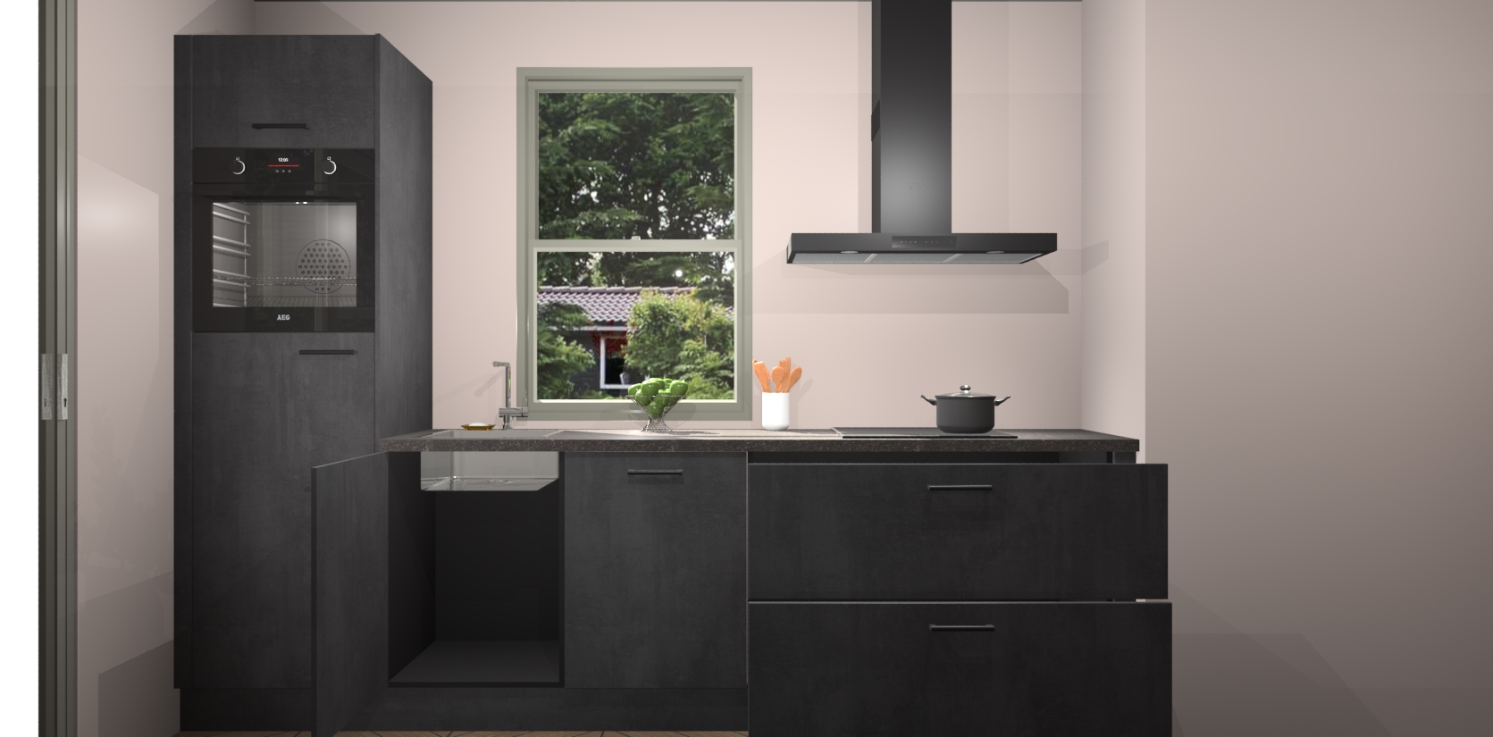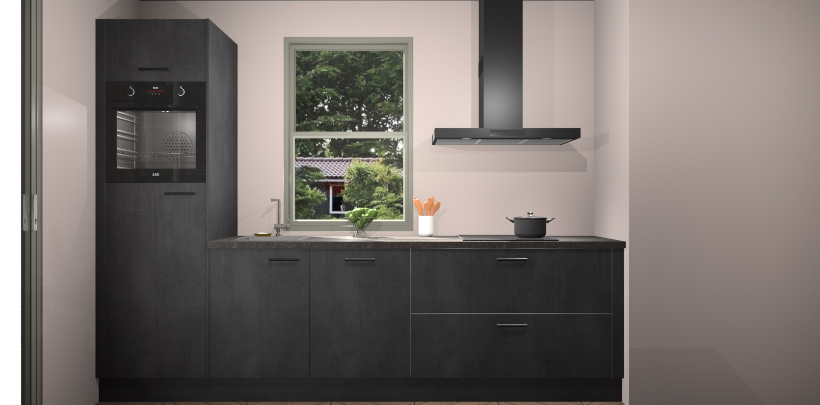 Een stijlvolle en praktische keuken als deze mag gezien worden. Dankzij de prachtige Beton Zwarte afwerking wordt de keuken gemakkelijk het middelpunt van uw huis - hij ziet er geweldig uit onder allerlei lichtomstandigheden, van dag tot nacht!