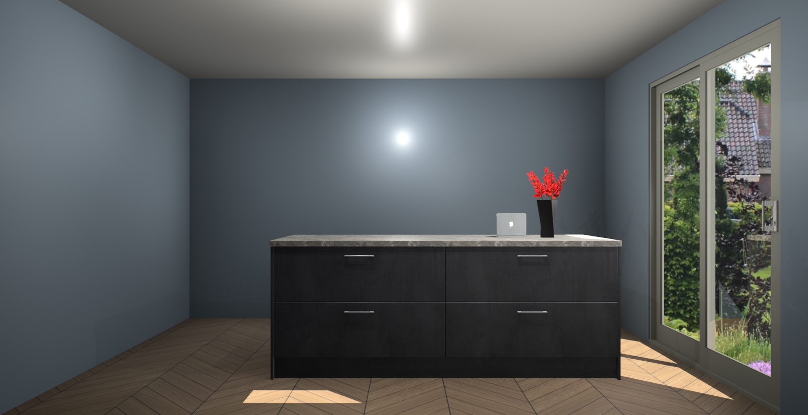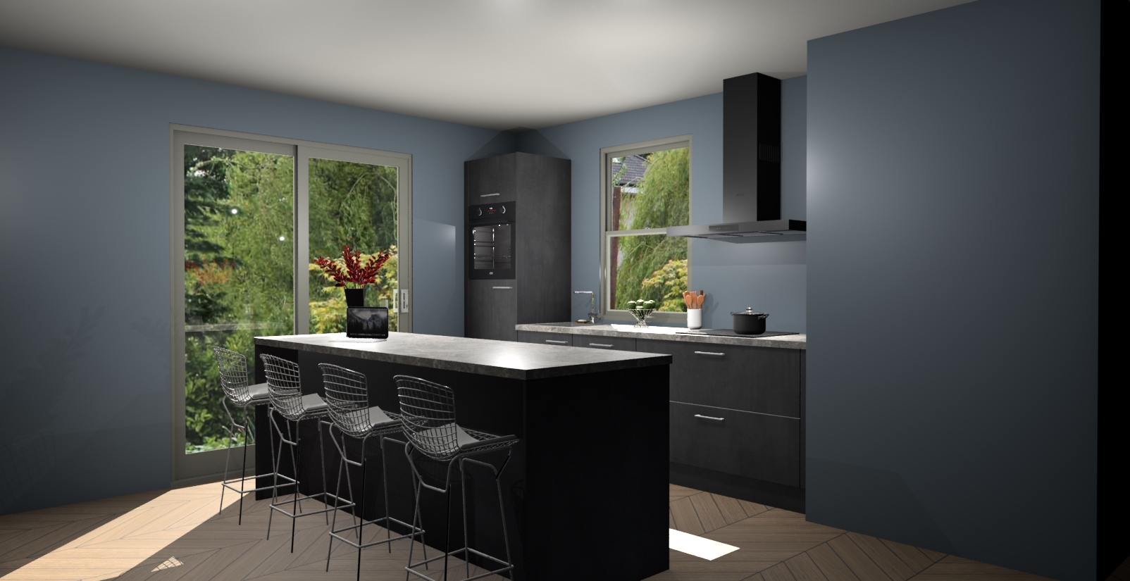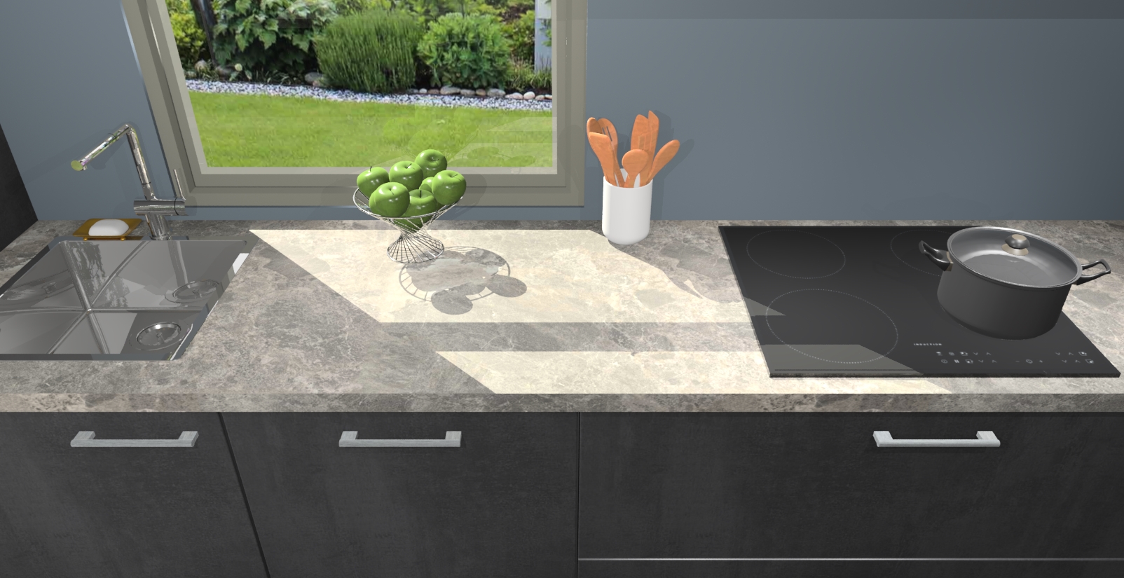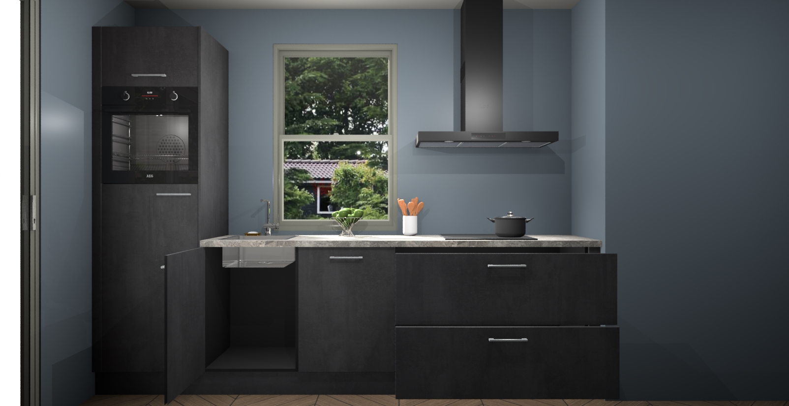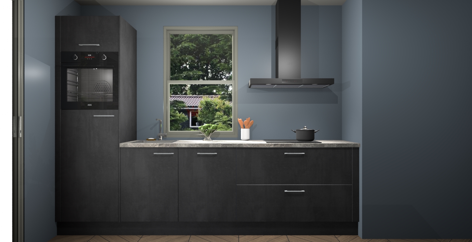 Een stijlvolle en praktische keuken als deze mag gezien worden. Dankzij de prachtige Beton Zwarte afwerking wordt de keuken gemakkelijk het middelpunt van uw huis - hij ziet er geweldig uit onder allerlei lichtomstandigheden, van dag tot nacht!