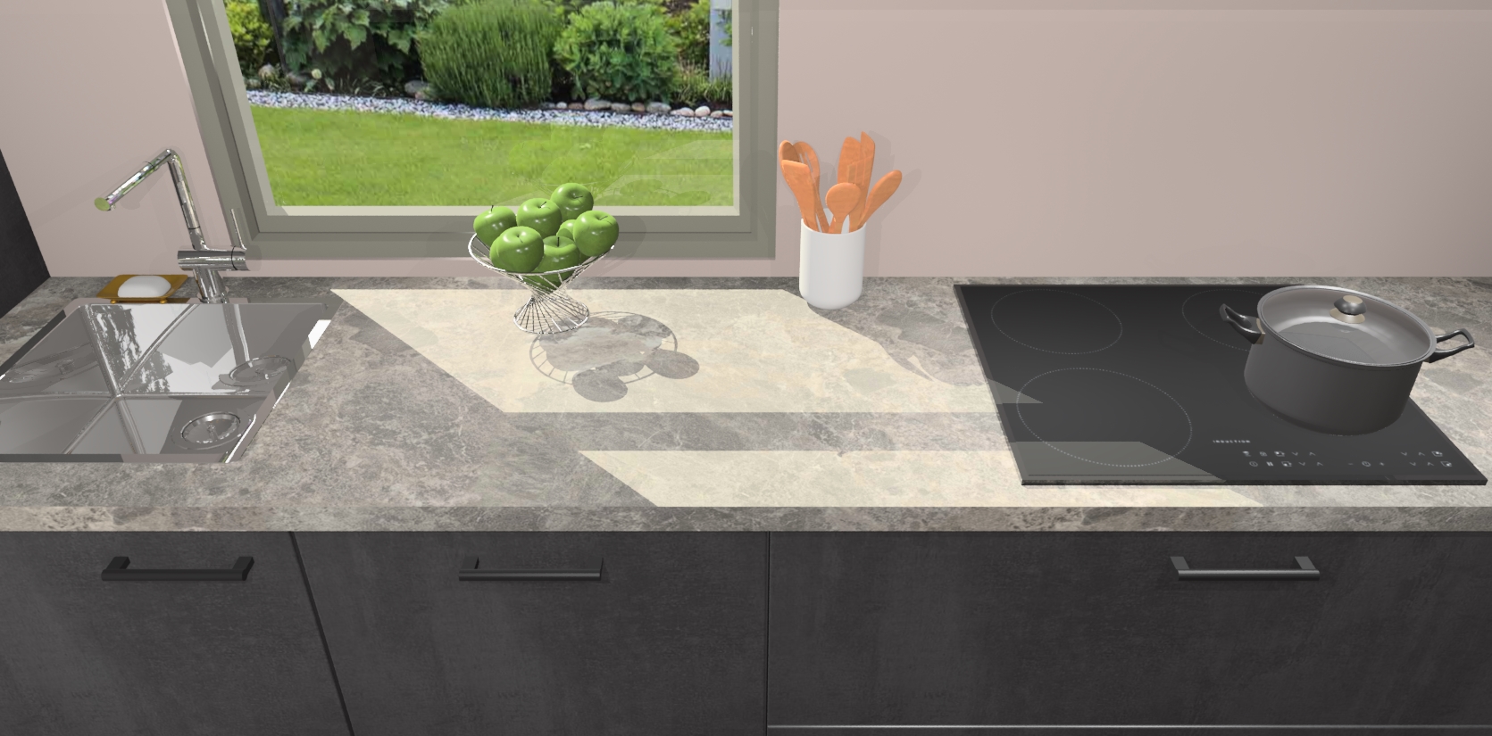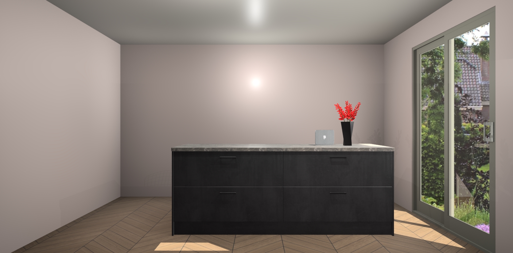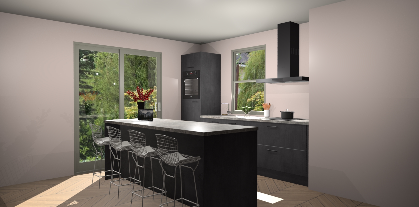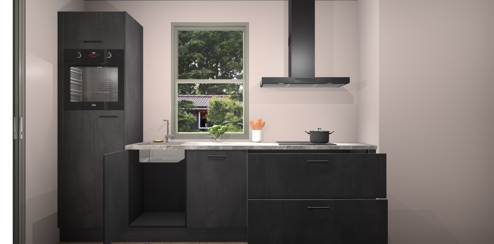 Een stijlvolle en praktische keuken als deze mag gezien worden. Dankzij de prachtige Beton Zwarte afwerking wordt de keuken gemakkelijk het middelpunt van uw huis - hij ziet er geweldig uit onder allerlei lichtomstandigheden, van dag tot nacht!