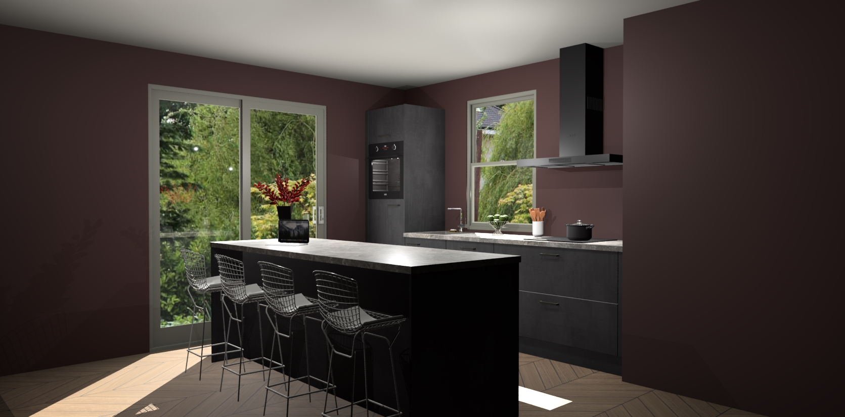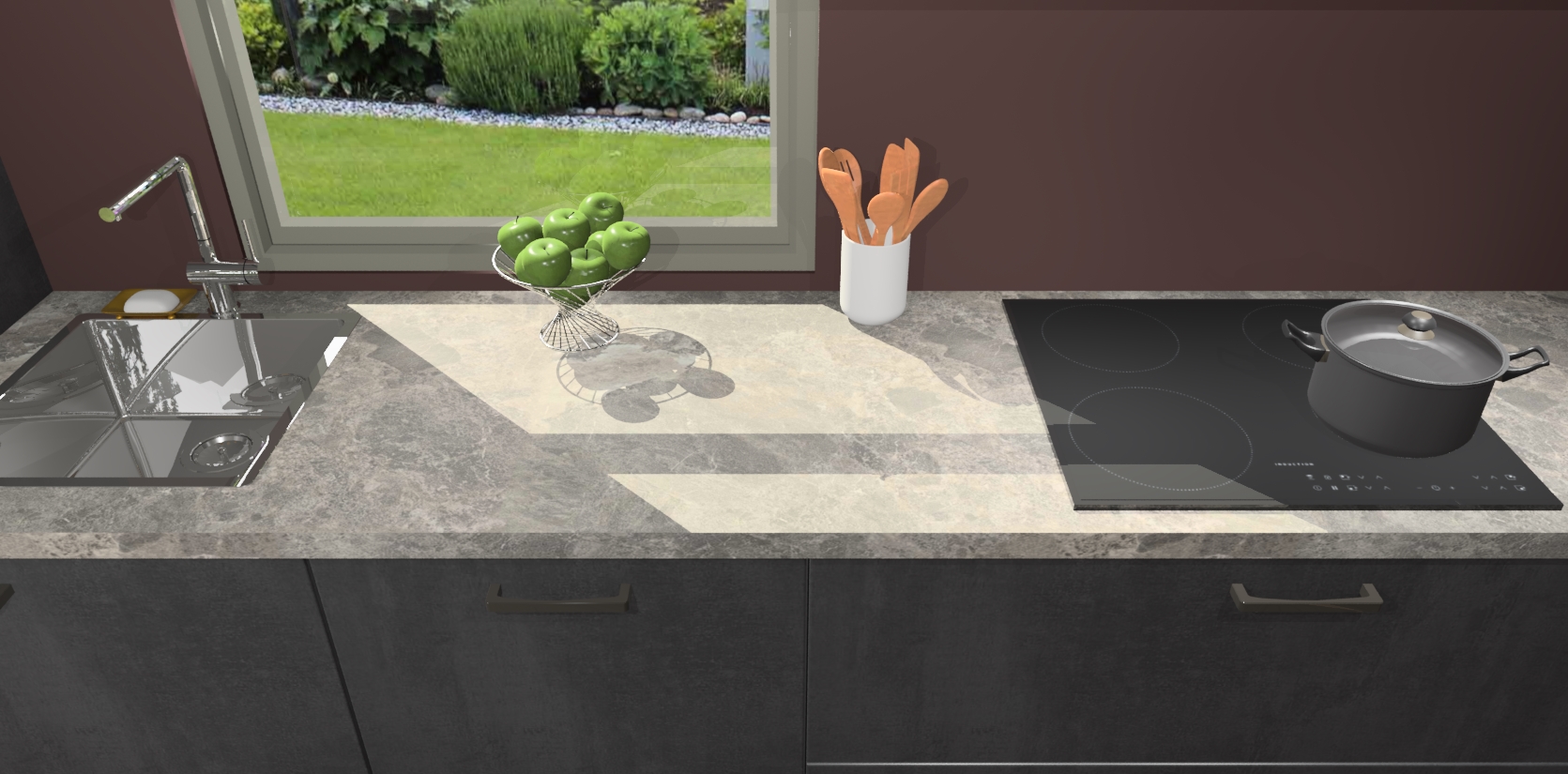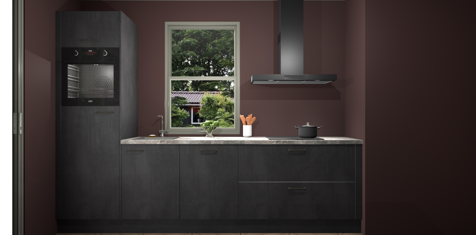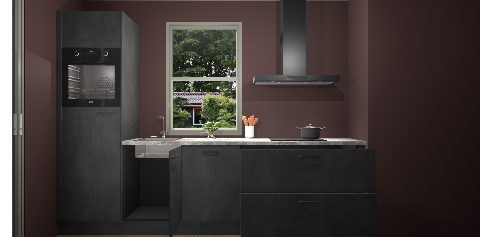 Een stijlvolle en praktische keuken als deze mag gezien worden. Dankzij de prachtige Beton Zwarte afwerking wordt de keuken gemakkelijk het middelpunt van uw huis - hij ziet er geweldig uit onder allerlei lichtomstandigheden, van dag tot nacht!
