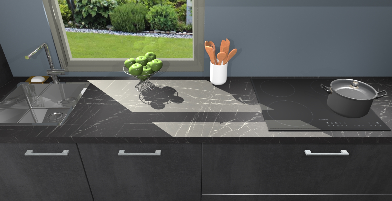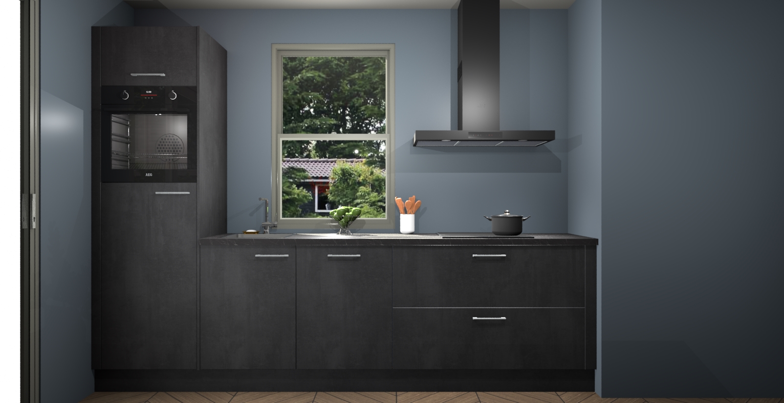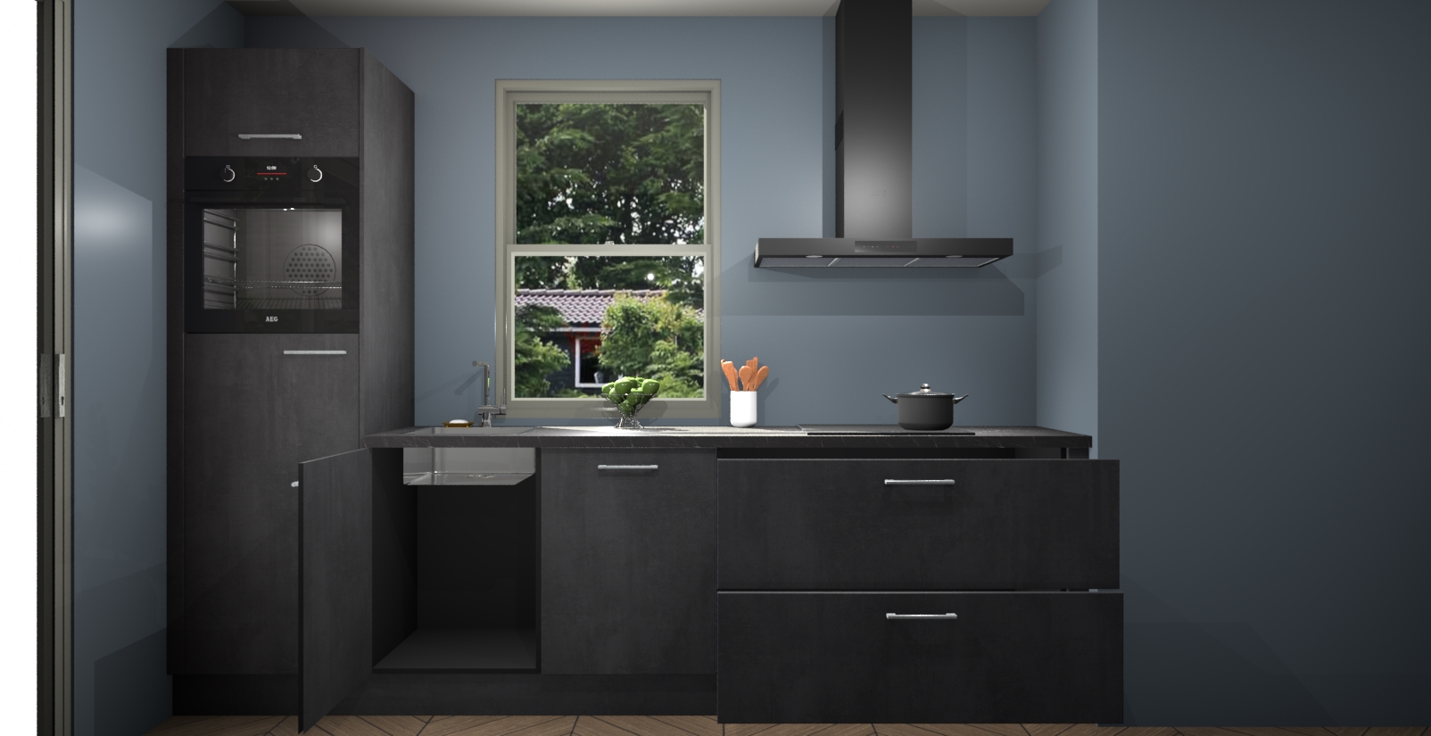 Een stijlvolle en praktische keuken als deze mag gezien worden. Dankzij de prachtige Beton Zwarte afwerking wordt de keuken gemakkelijk het middelpunt van uw huis - hij ziet er geweldig uit onder allerlei lichtomstandigheden, van dag tot nacht!