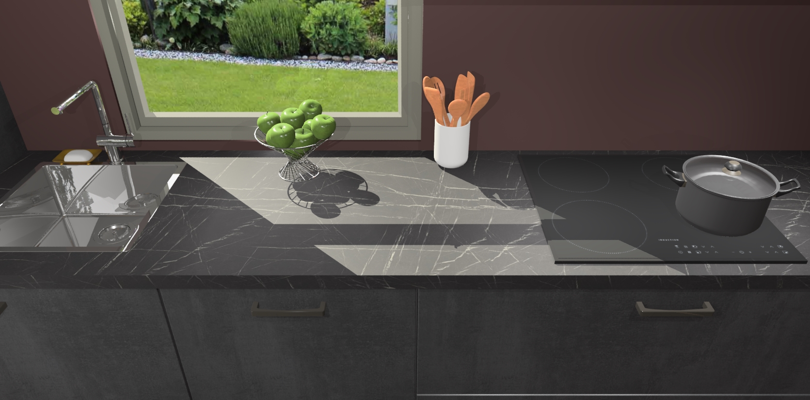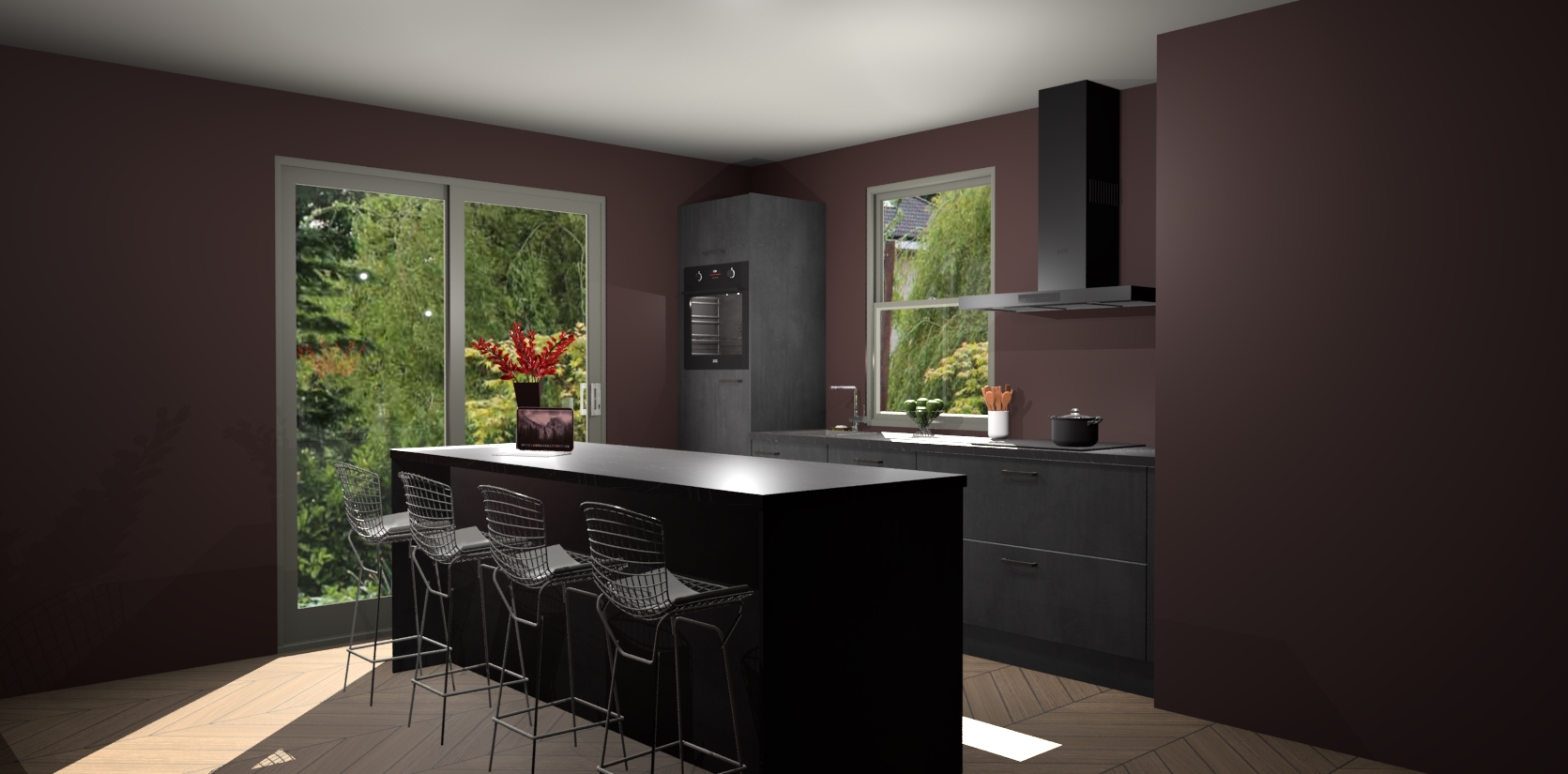 Een stijlvolle en praktische keuken als deze mag gezien worden. Dankzij de prachtige Beton Zwarte afwerking wordt de keuken gemakkelijk het middelpunt van uw huis - hij ziet er geweldig uit onder allerlei lichtomstandigheden, van dag tot nacht!
