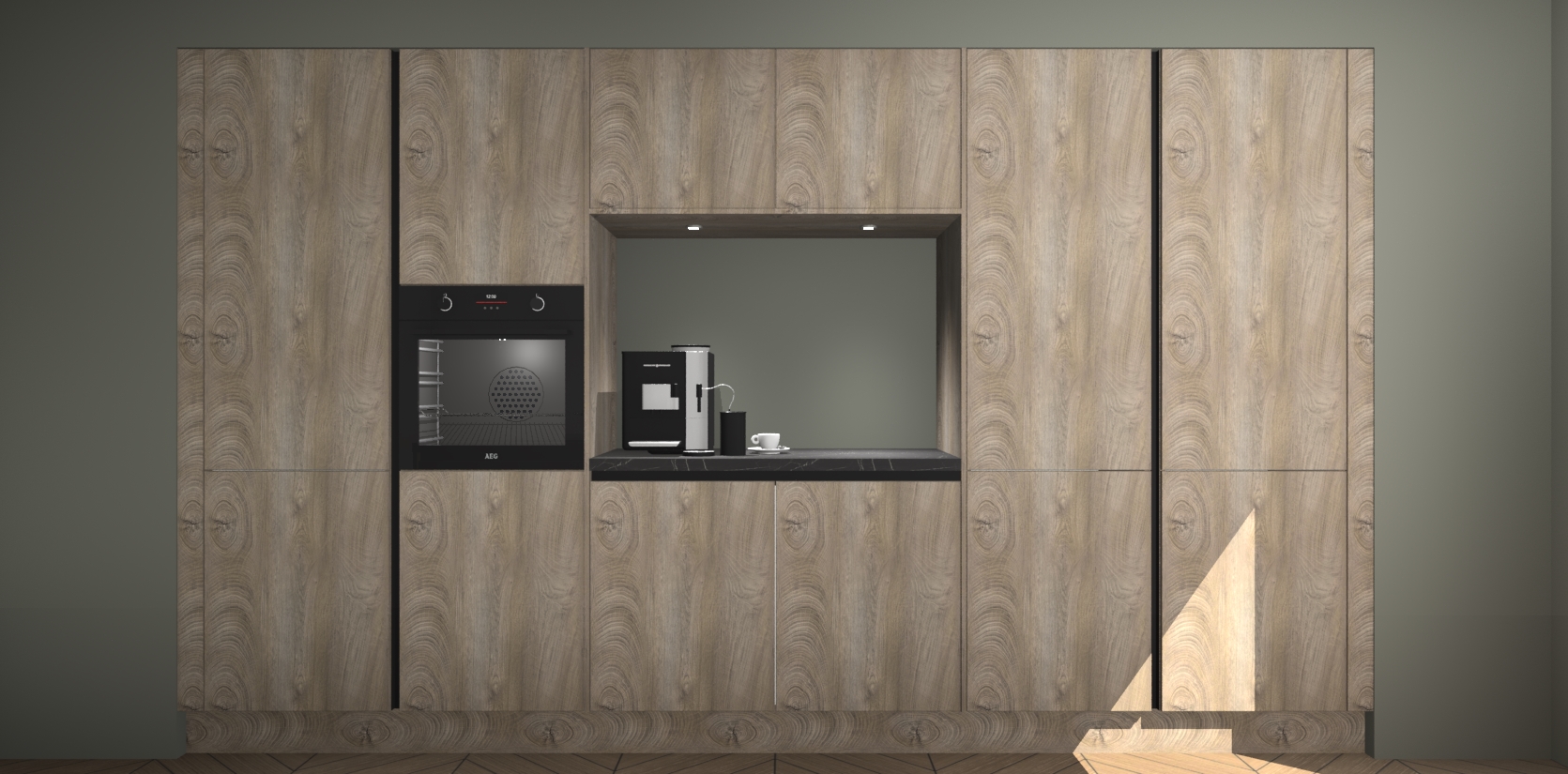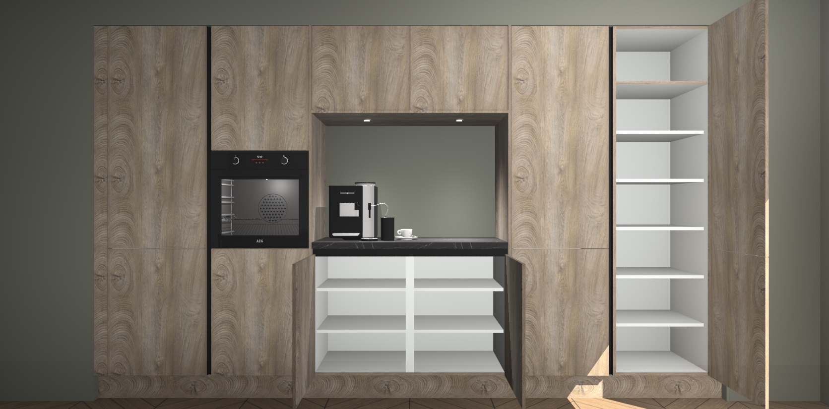 De Cantaro Eiken greeploze keuken Lodz wordt geleverd met een set van 5 ingebouwde apparaten: Een oven, inductiekookplaat, afzuigkap, vaatwasser en koelkast. Deze kunnen gemakkelijk worden opgewaardeerd naar AEG. Met de gegarandeerde lage prijs en de snelle levering van 7 weken kan u er op rekenen dat de Cantaro Eiken greeploze keuken Lodz zo snel mogelijk uw huis bereikt!