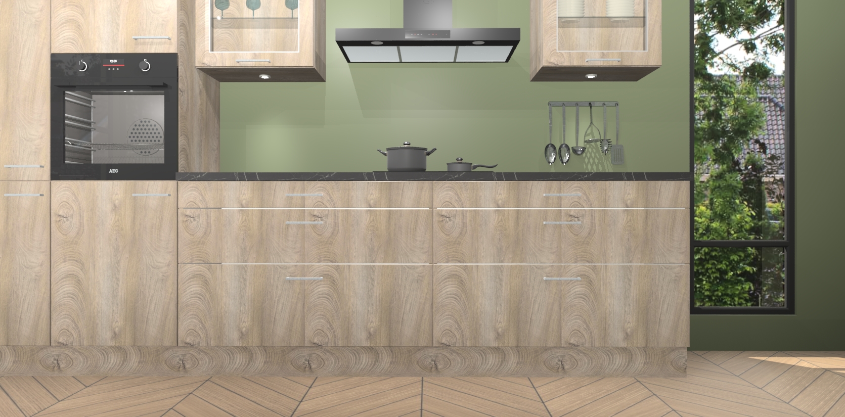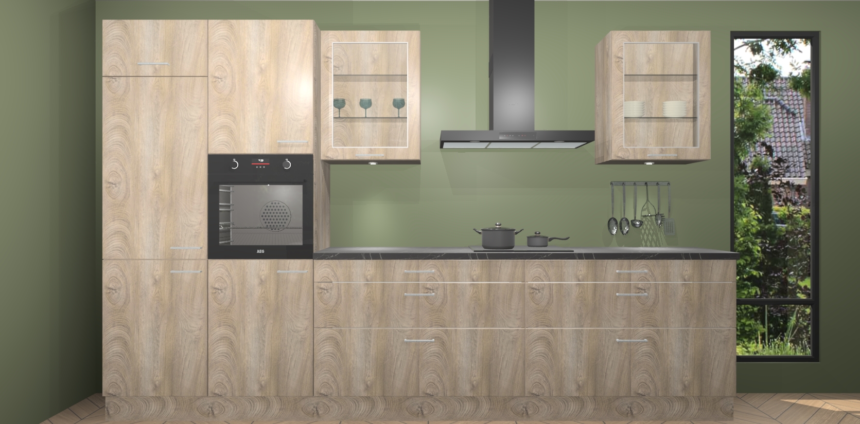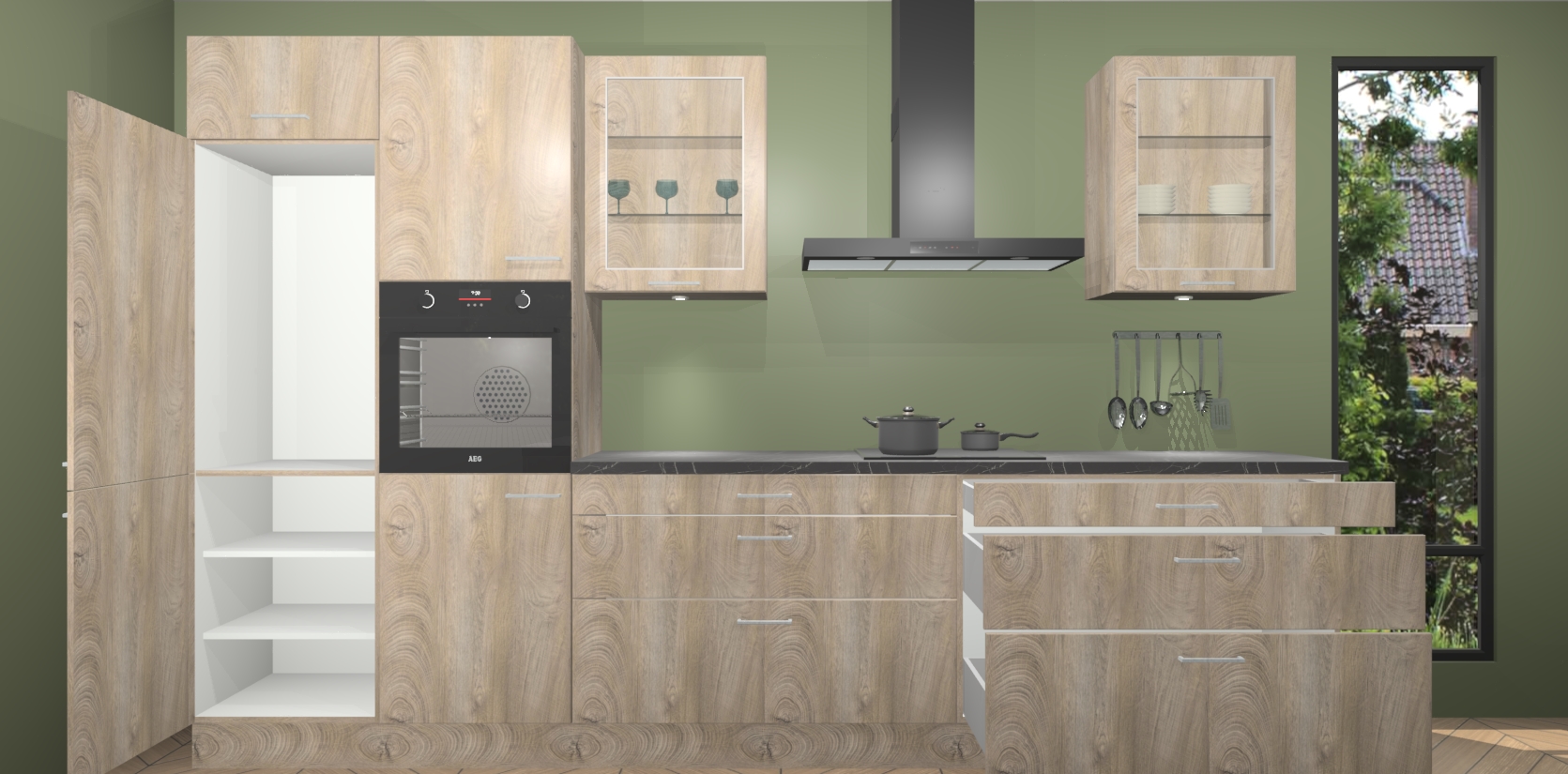 Er is ook genoeg ruimte aanwezig voor uw andere producten, want de cantaro eiken keuken Hyderabad 19365 heeft meer dan voldoende opbergruimte. Een van de meest fascinerende delen is wellicht het prachtige spoel eiland dat ervoor zorgt dat koken met verschillende pannen eenvoudiger dan ooit wordt. Wanneer u de bestelling plaatst, krijgt u 5 inbouwapparaten bijgevoegd: een oven, inductieplaat, afzuigkap, vaatwasser en koelkast - gemakkelijk te upgraden naar AEG-apparaten indien gewilde. De softclose deuren maken dit tot de perfecte keuken toevoeging aan uw huis waarmee alles soepel en stil loopt.