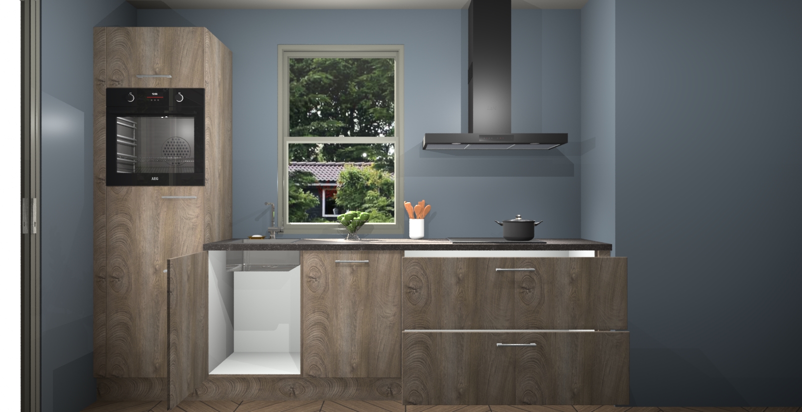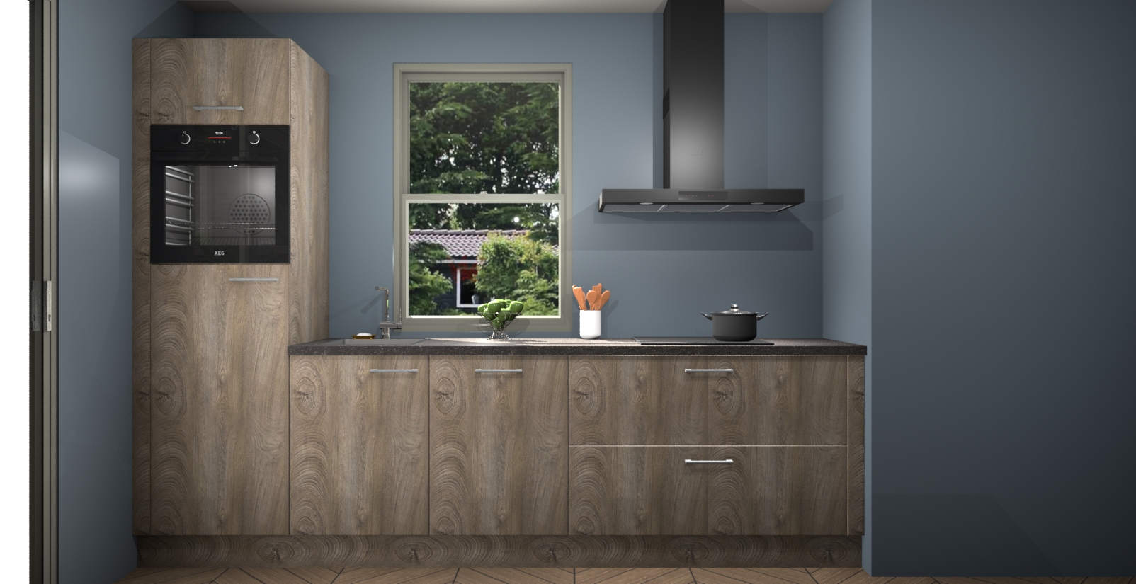 Een stijlvolle en praktische keuken als deze mag gezien worden. Dankzij de prachtige Cantaro Eiken afwerking wordt de keuken gemakkelijk het middelpunt van uw huis - hij ziet er geweldig uit onder allerlei lichtomstandigheden, van dag tot nacht!