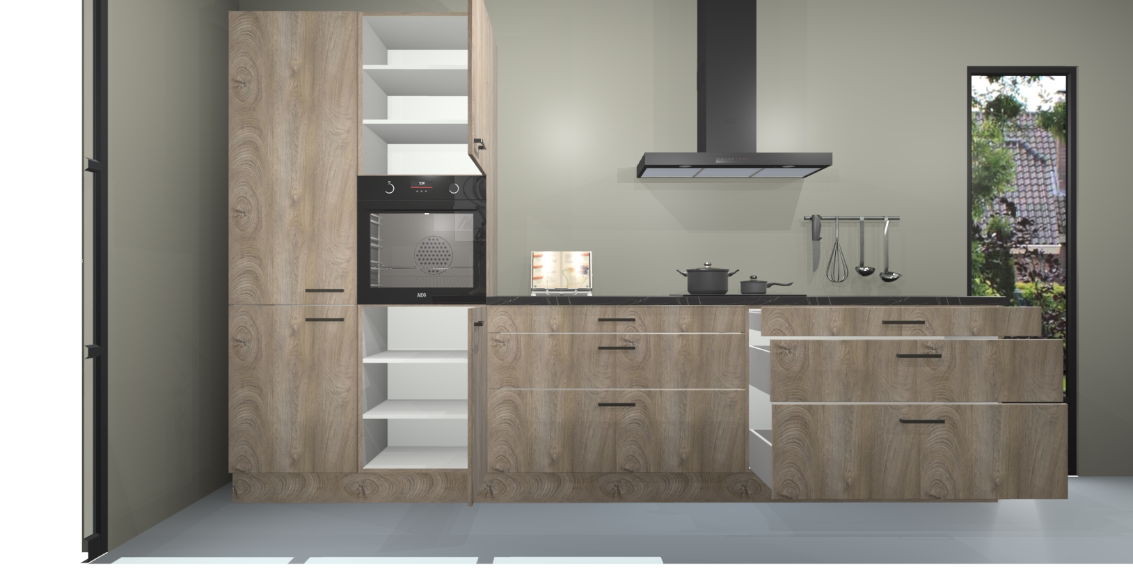 De cantaro eiken keuken Zhongshan 18773 is in staat om uw keuken naar een hoger niveau te brengen! Elegant en modern ontworpen, straalt deze keuken warmte en sfeer uit. De vele opslagmogelijkheden zullen één van uw favoriete kenmerken worden. Niet alleen is er een prachtig spoeleiland voor ultieme prestaties, maar ook krijgt u 5 inbouwapparaten als onderdeel van uw aankoop: oven, inductieplaat, afzuigkap, vaatwasser en koelkast! Bovendien kunt u bij bestellen ook upgraden naar het AEG-pakket voor extra gemak. Softclose deuren maken het mysterie compleet.
